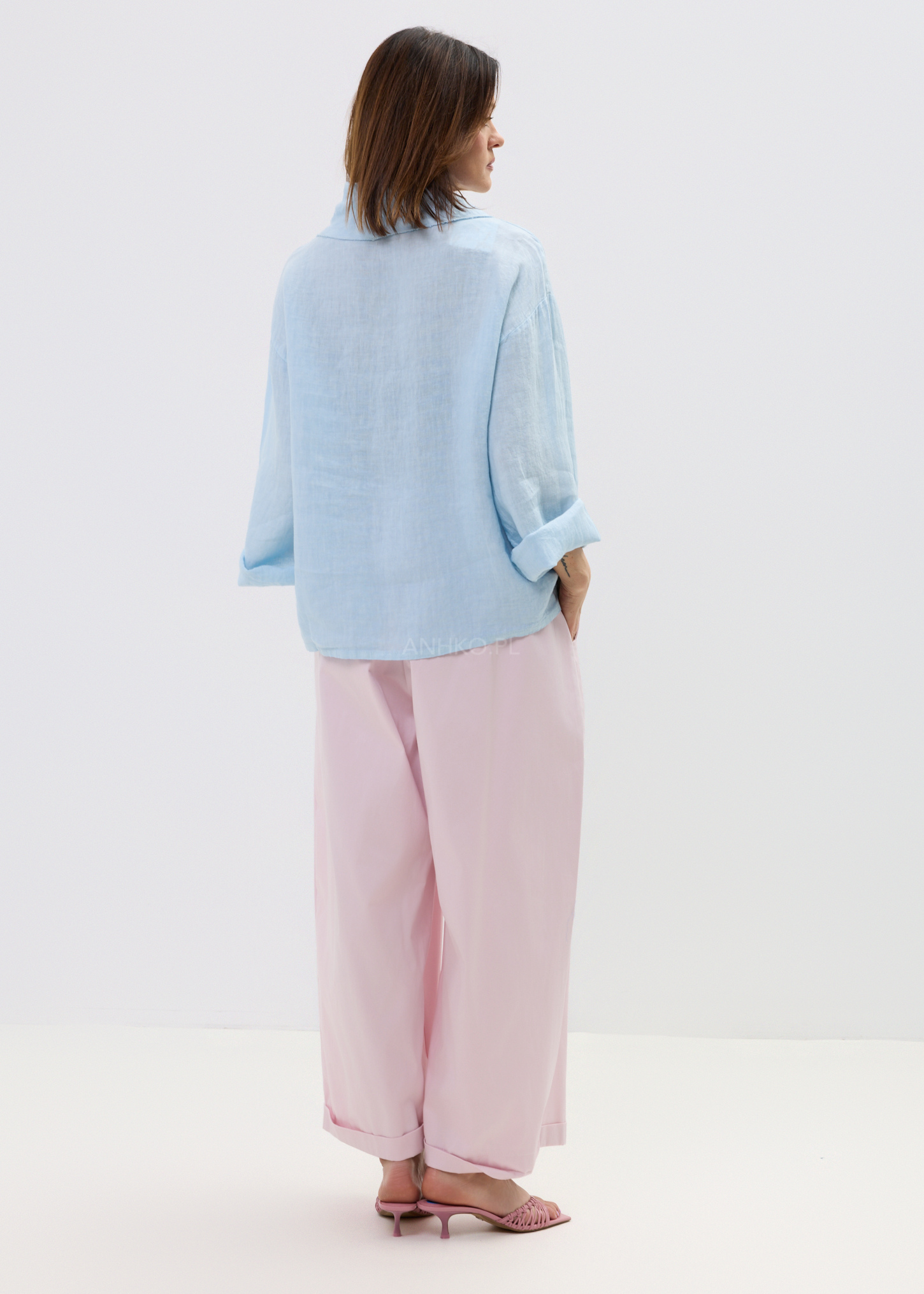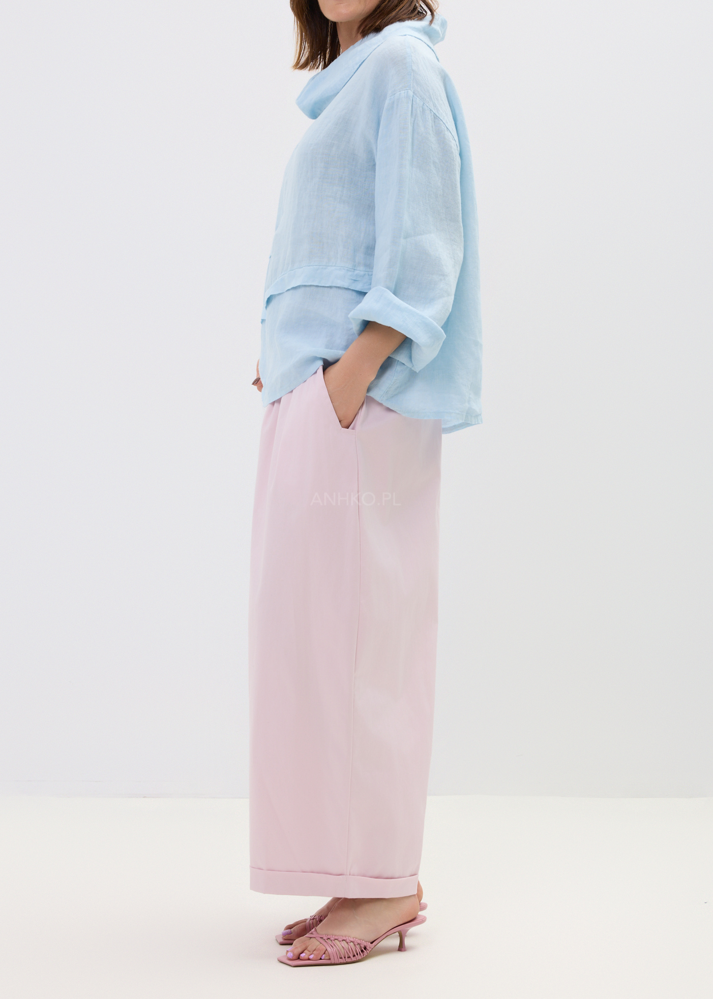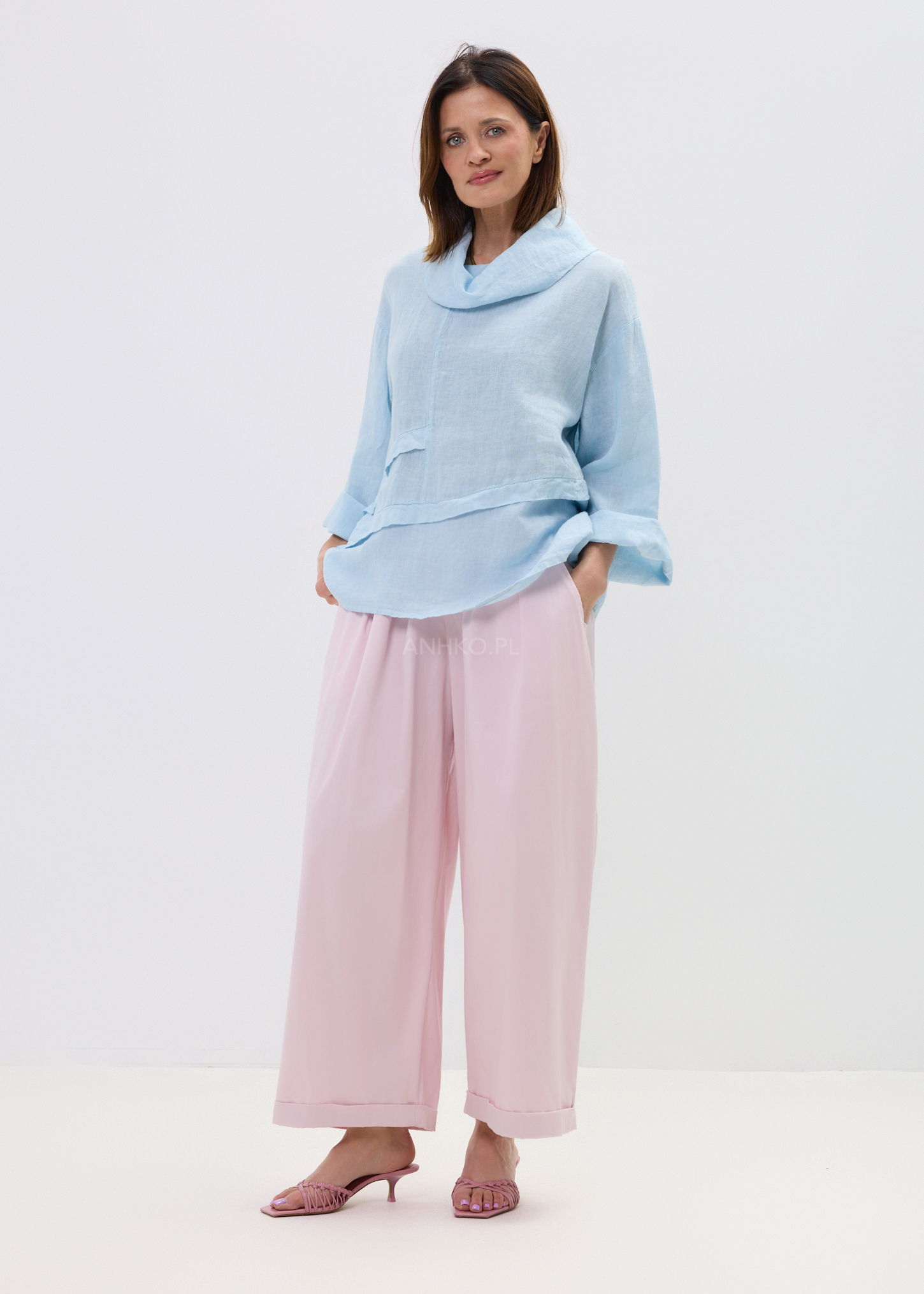 Bluzka Lniana Azzule Błękitna - Lekka, lniana bluzka w odcieniu baby blue z luźnym krojem i miękkim kominem. Idealna na cieplejsze dni – swobodna, oddychająca i stylowa bez wysiłku.