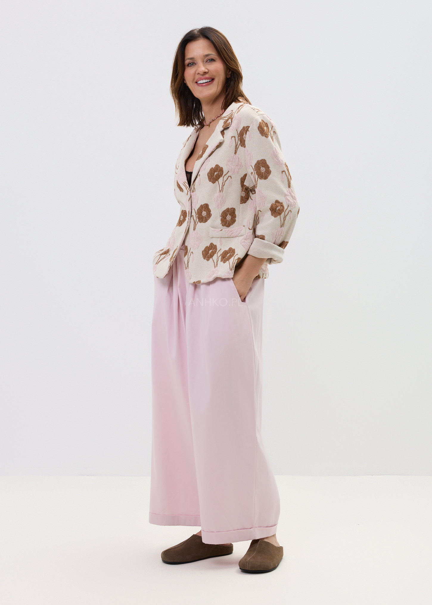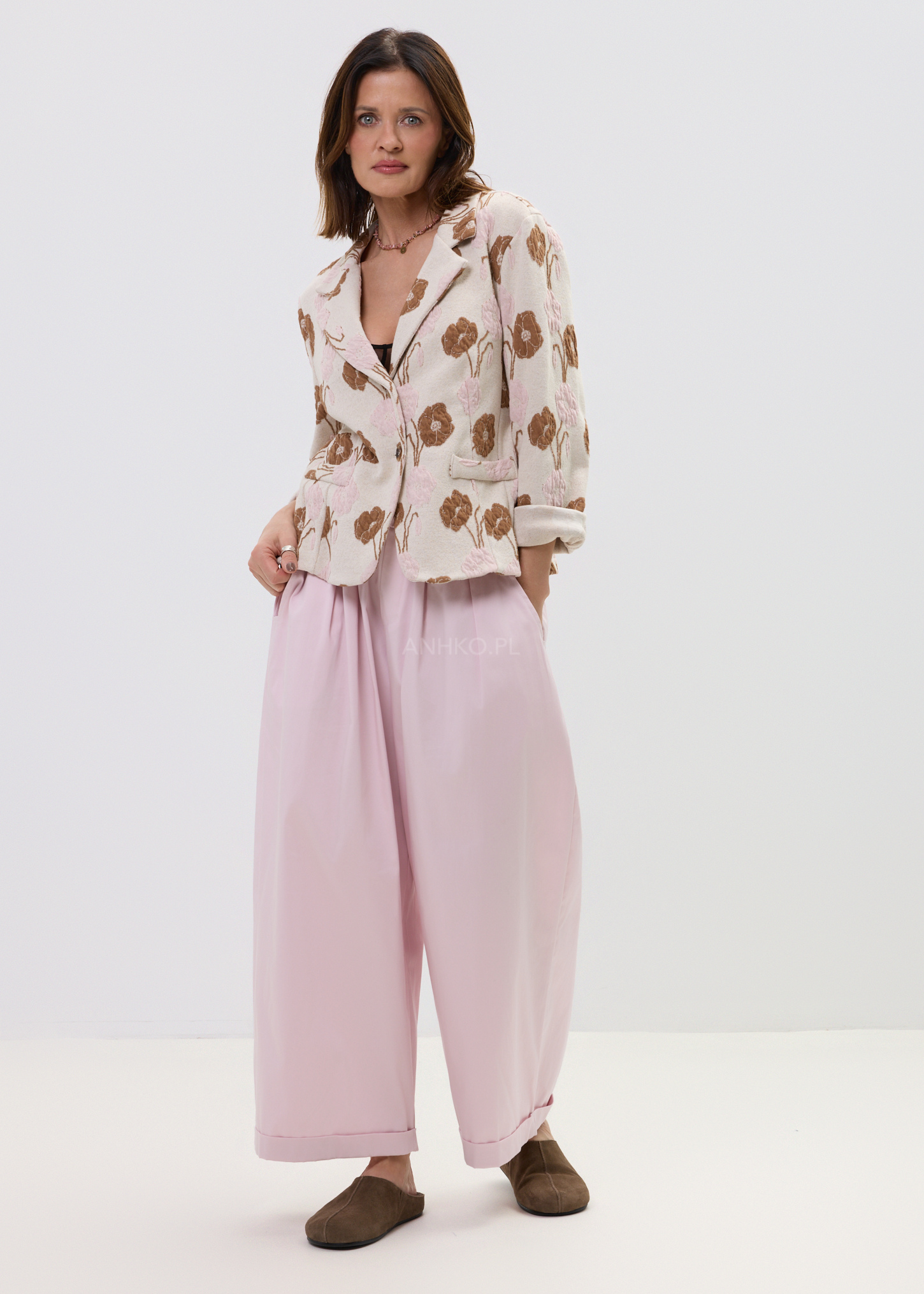Marynarka Nereus Beżowo-Różowa - Stylowa marynarka w artystyczny, kwiatowy wzór, która przyciąga spojrzenia i nadaje stylizacji charakteru. Klasyczny fason z klapami i jednym guzikiem sprawia, że świetnie sprawdzi się zarówno w codziennych, jak i bardziej eleganckich zestawach.