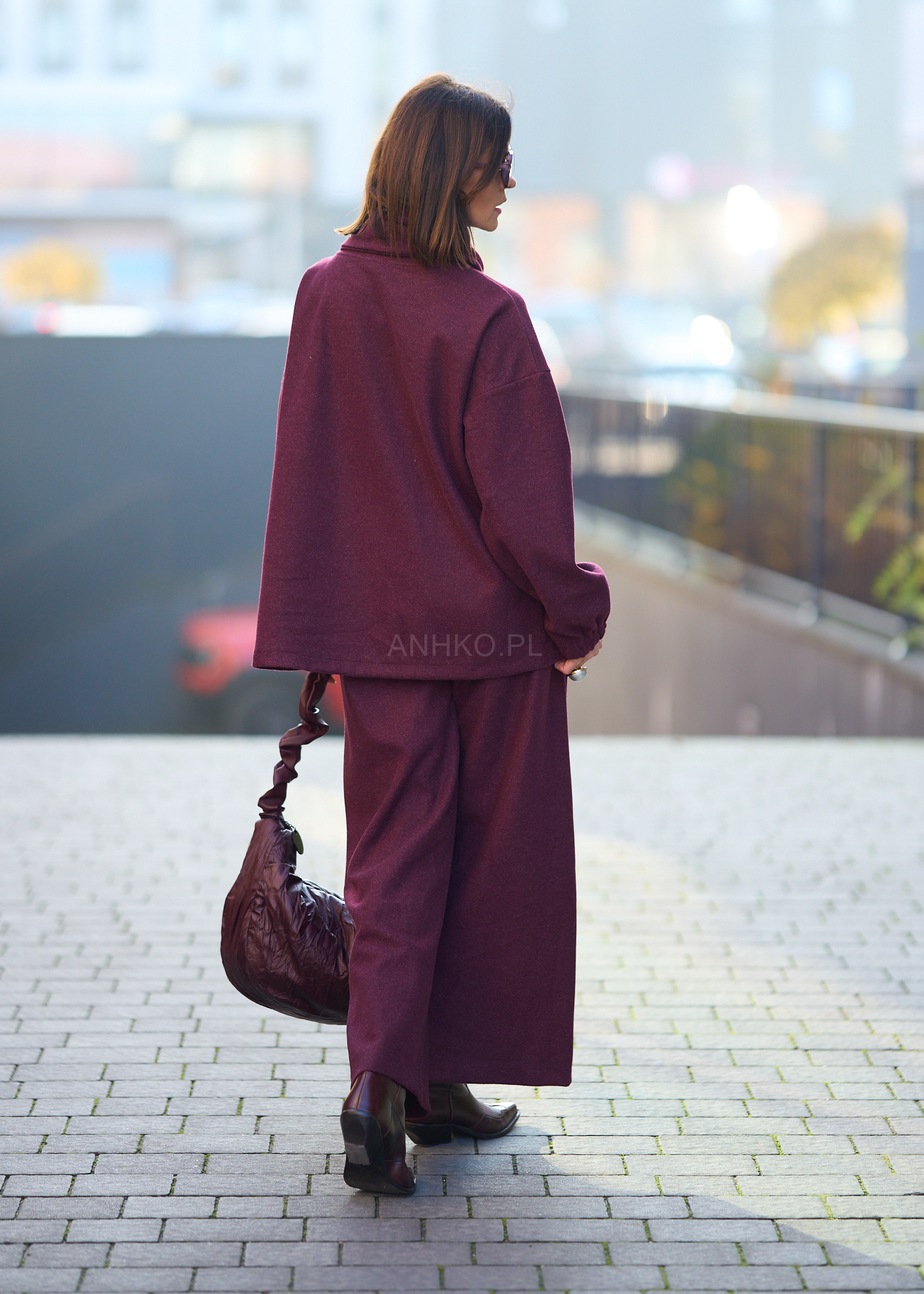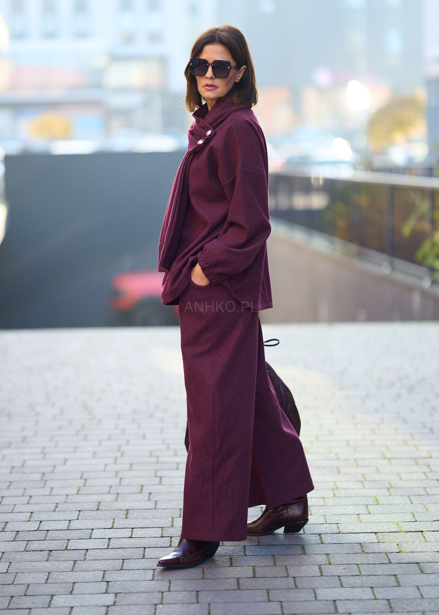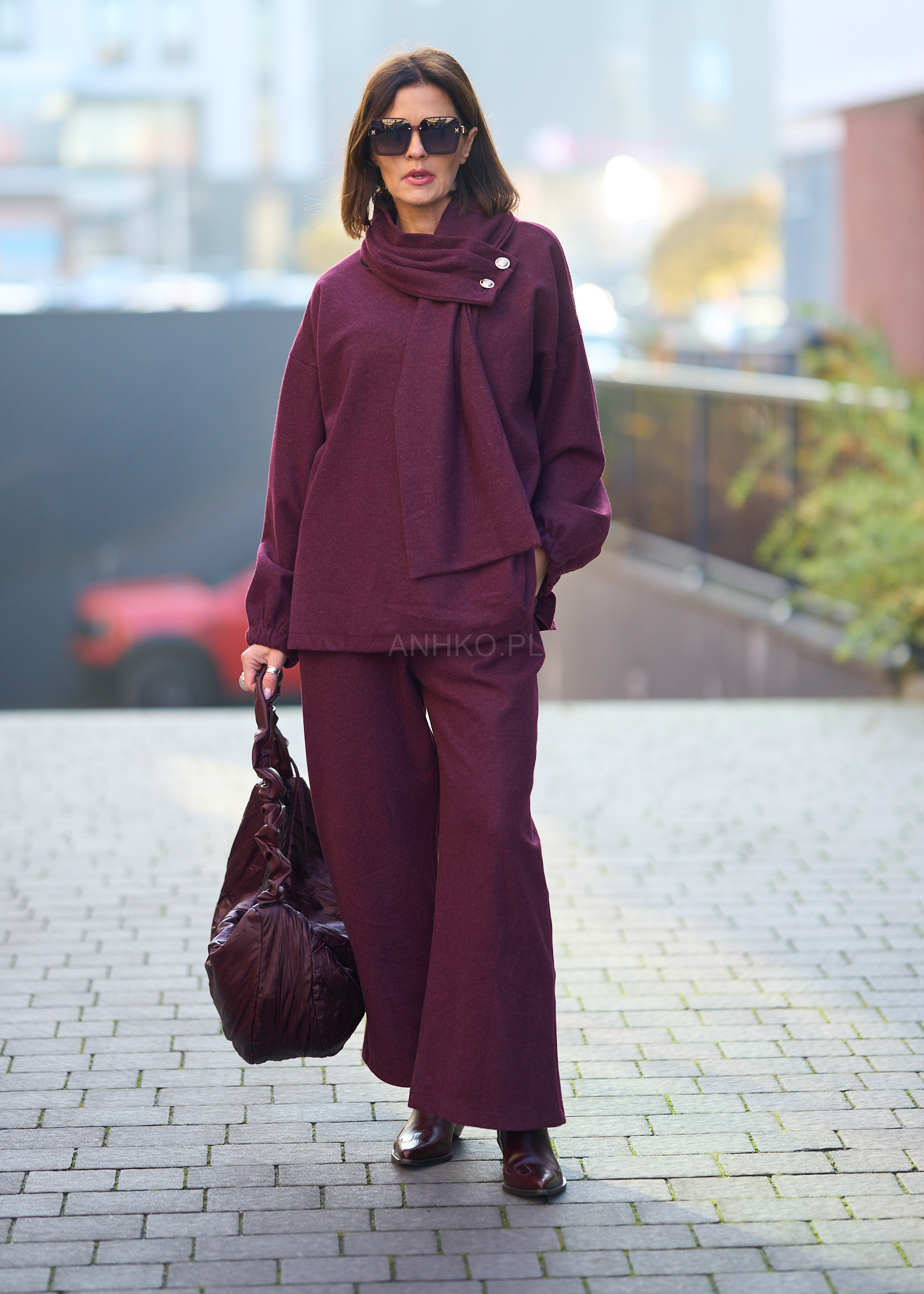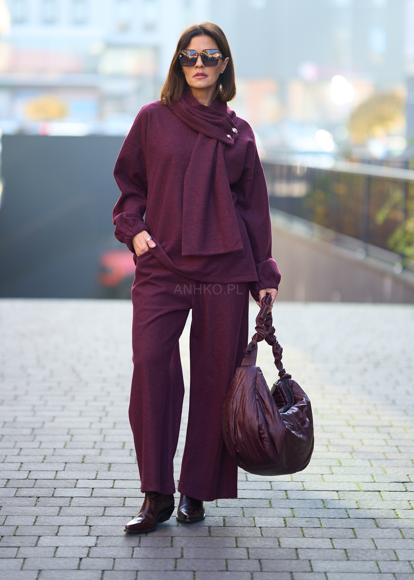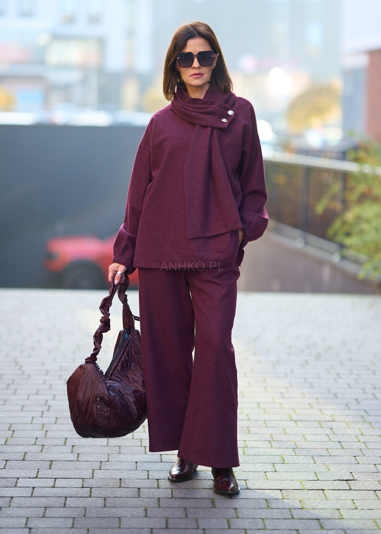 Bluza Miralune Bordowa z Szalem - Stylowa bluza made in Italy z dekoracyjnym marszczeniem i złotymi guzikami. Miękka, komfortowa i elegancka, idealna na co dzień, do pracy i na chłodniejsze dni. Łączy wygodę z unikalnym, subtelnie biżuteryjnym akcentem.