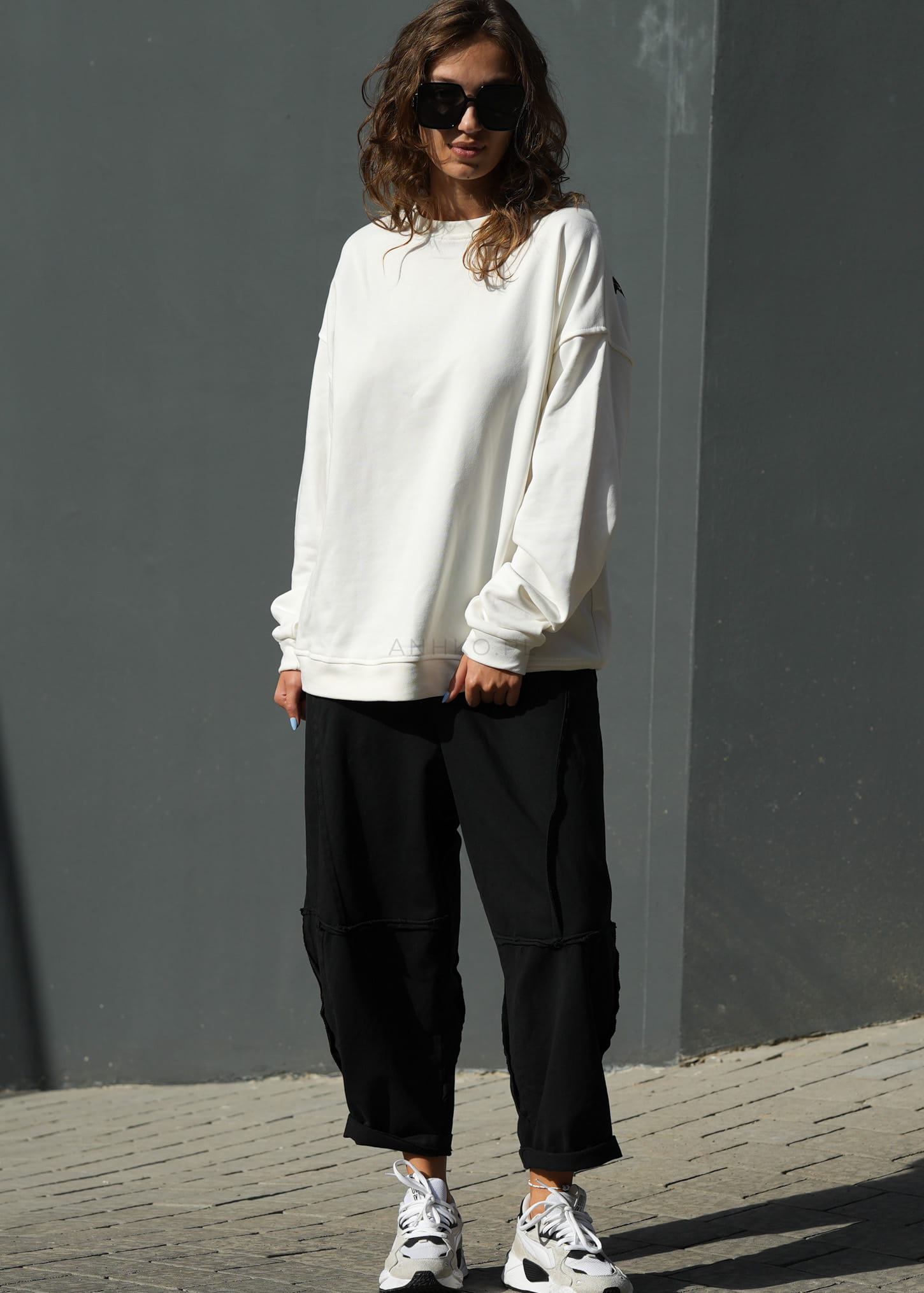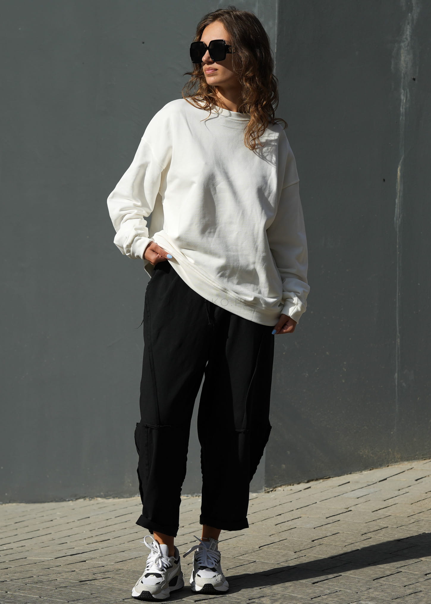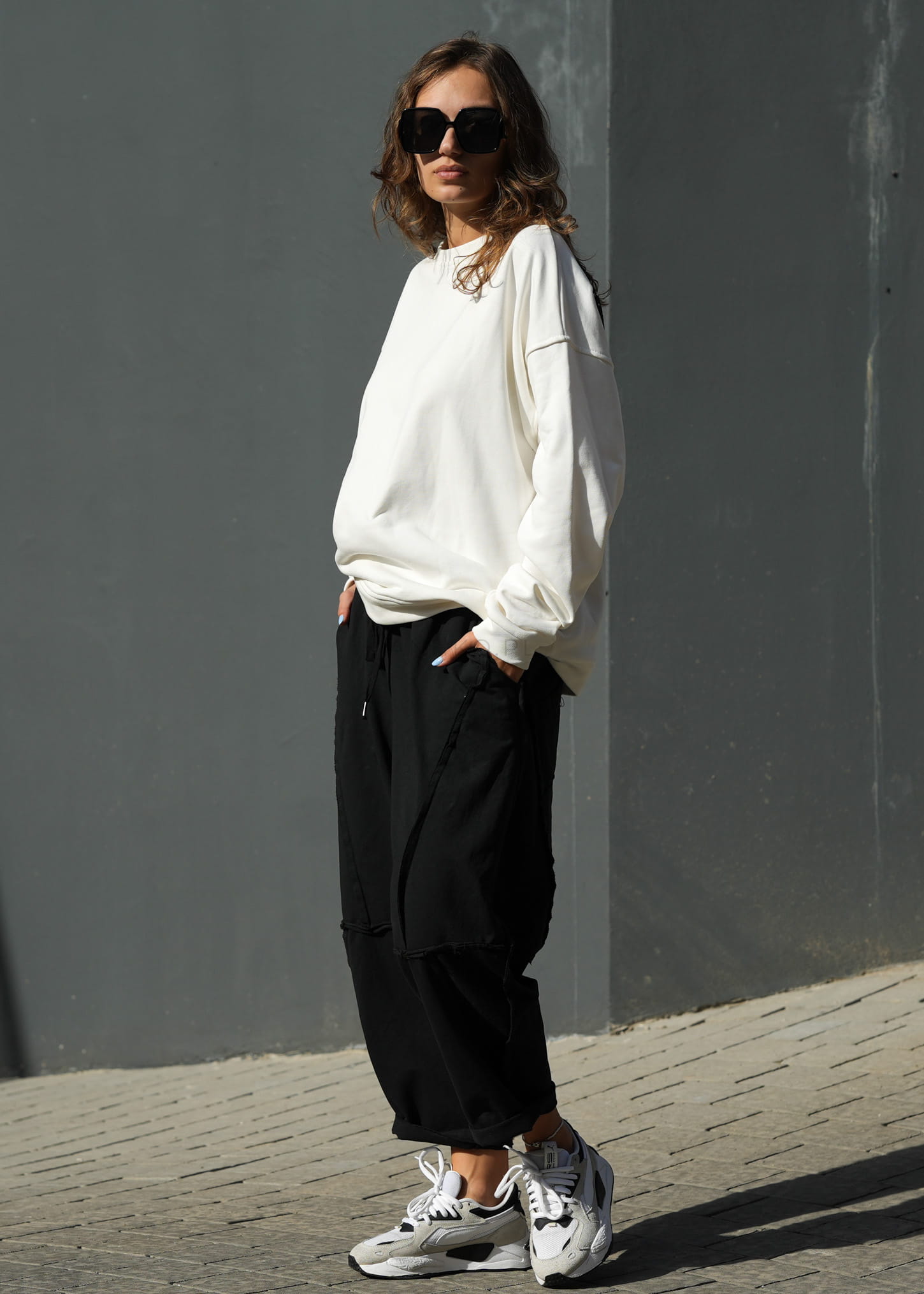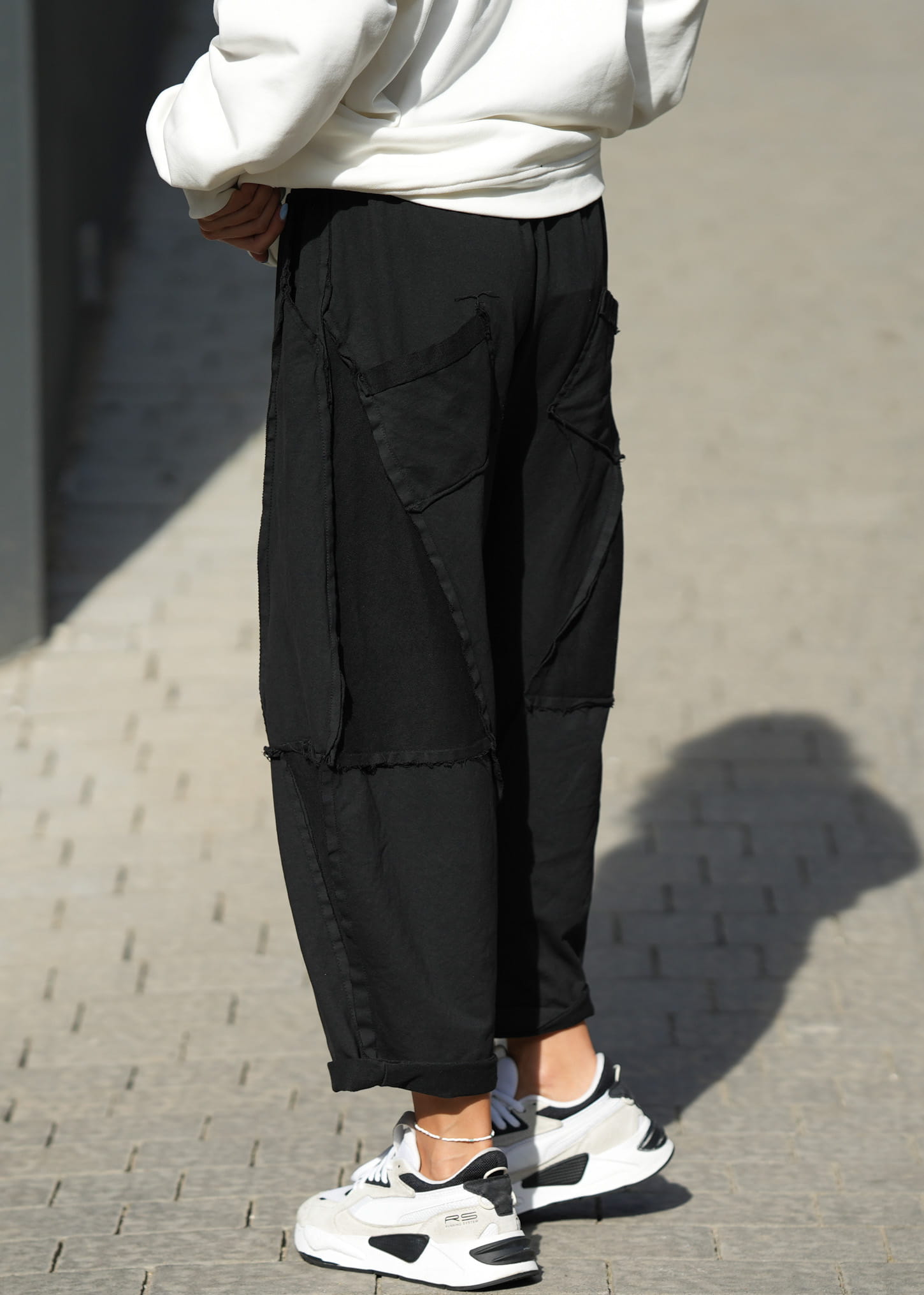 Model wyróżniają fantazyjne przeszycia oraz cztery praktyczne kieszenie, które podkreślają nowoczesny, streetowy styl. Miękka dzianina z wysoką zawartością bawełny zapewnia komfort noszenia przez cały dzień – zarówno w casualowych zestawach ze sneakersami, jak i w bardziej kontrastowym połączeniu z marynarką czy dopasowanym topem.