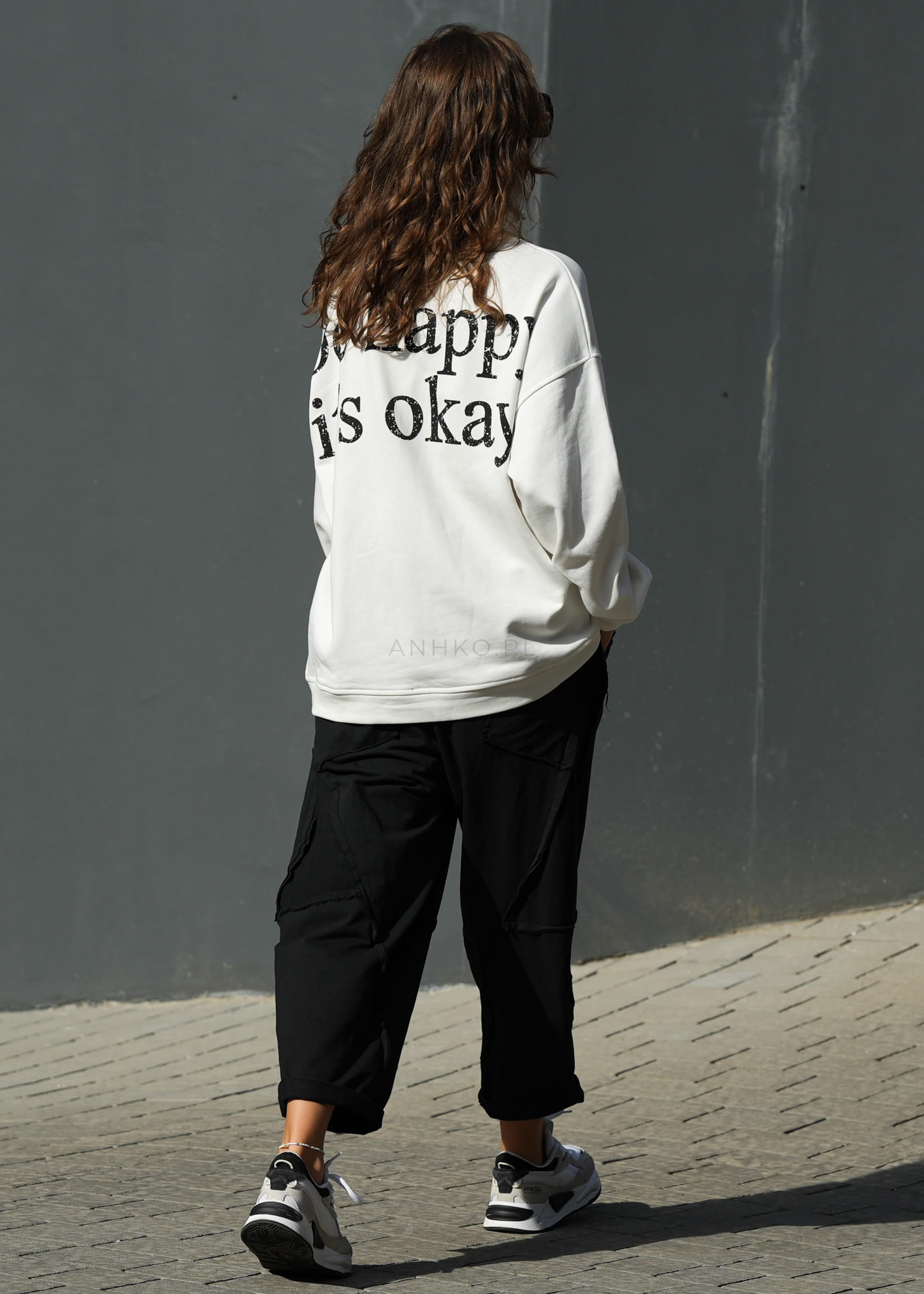 - Fason: Luźny krój z obniżonym krokiem w stylu baggy.