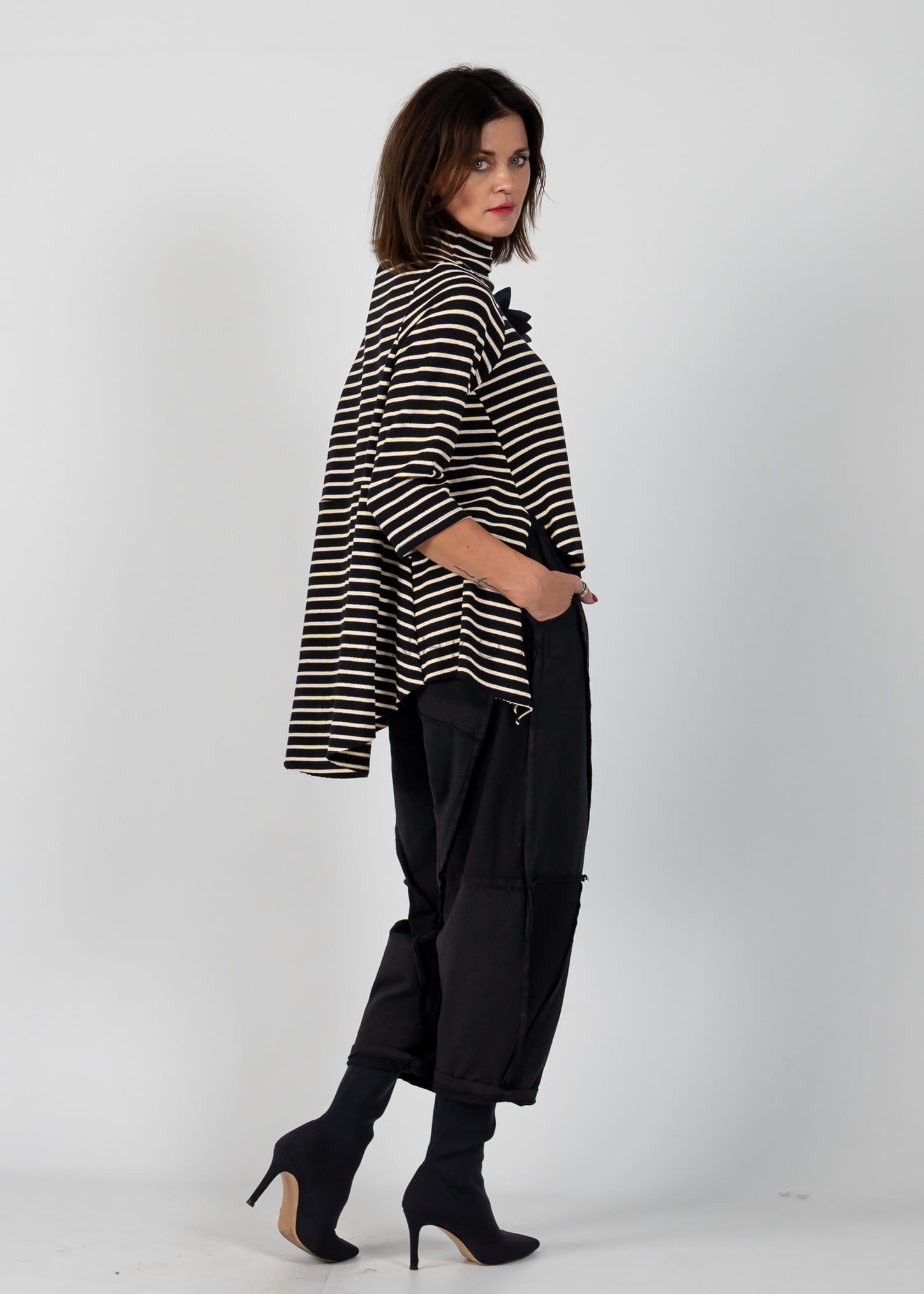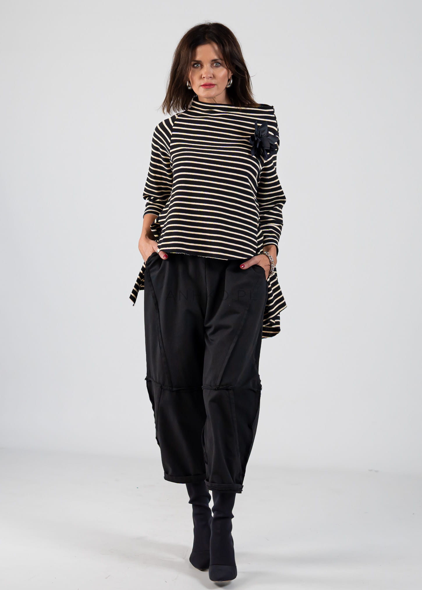 - Talia: Szeroka gumka w pasie ze sznurkiem do regulacji.