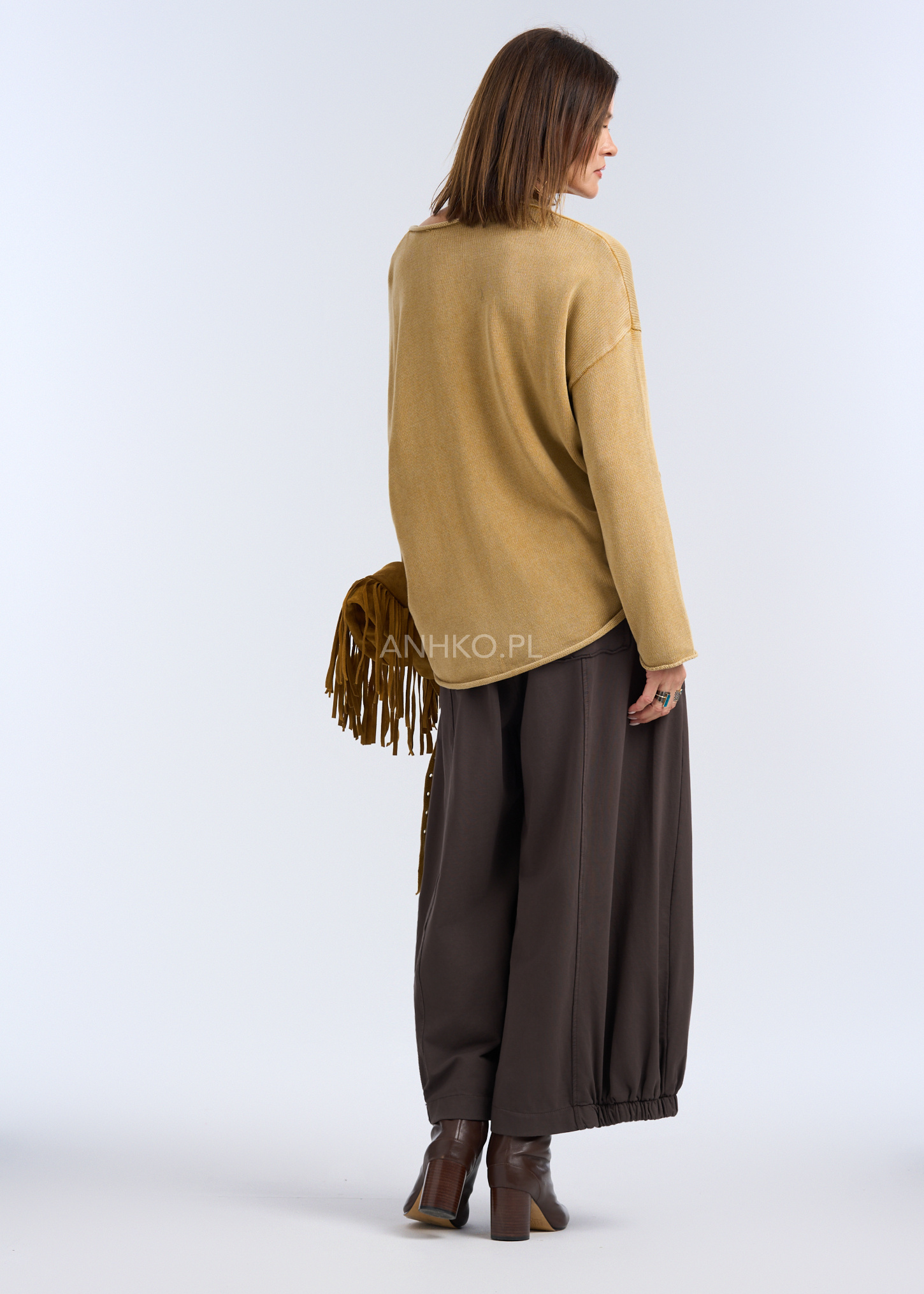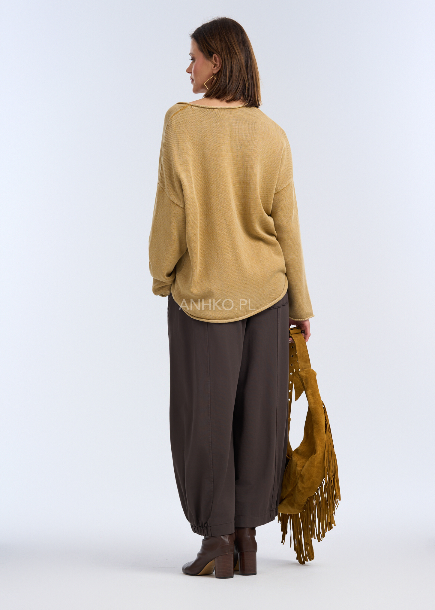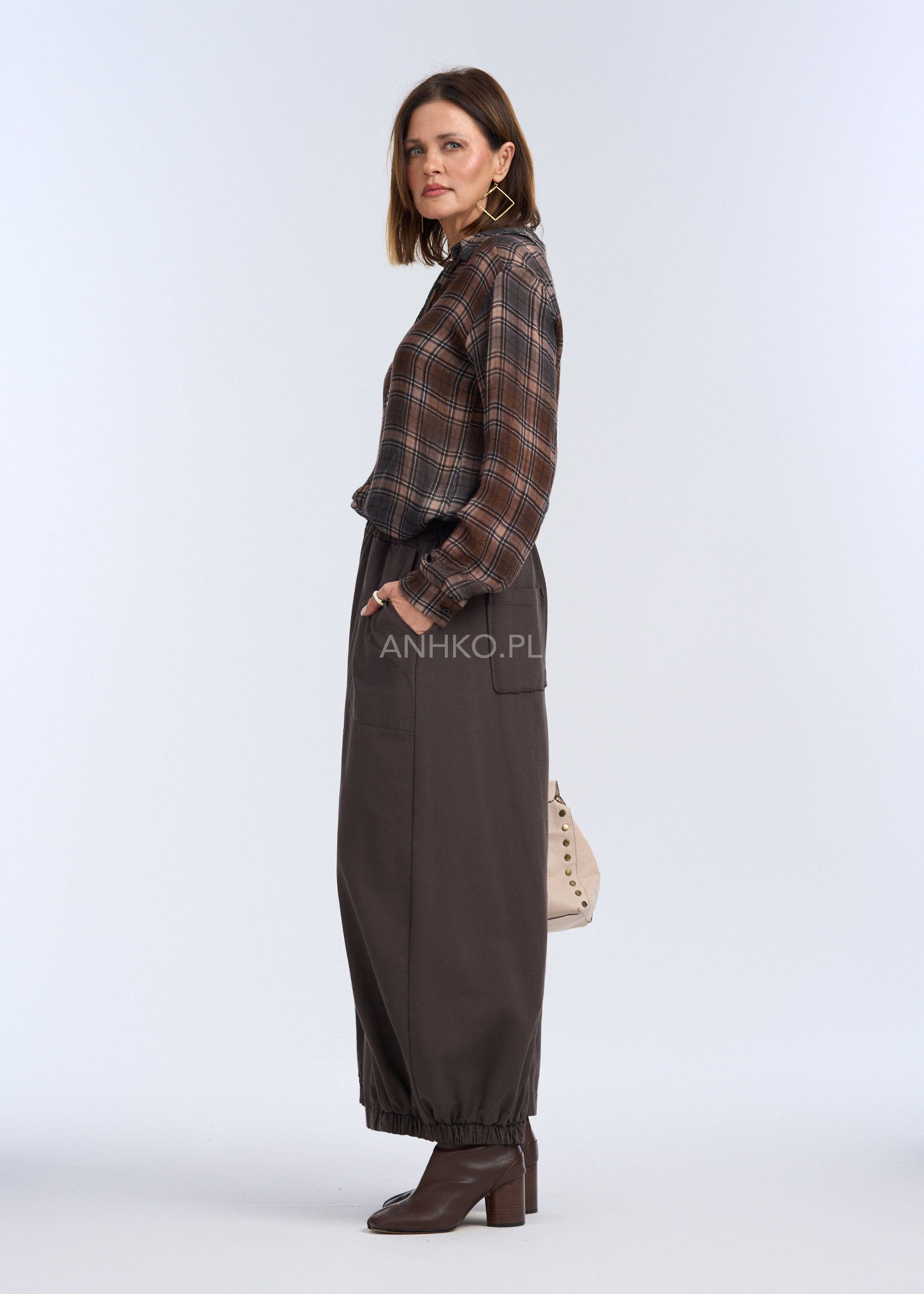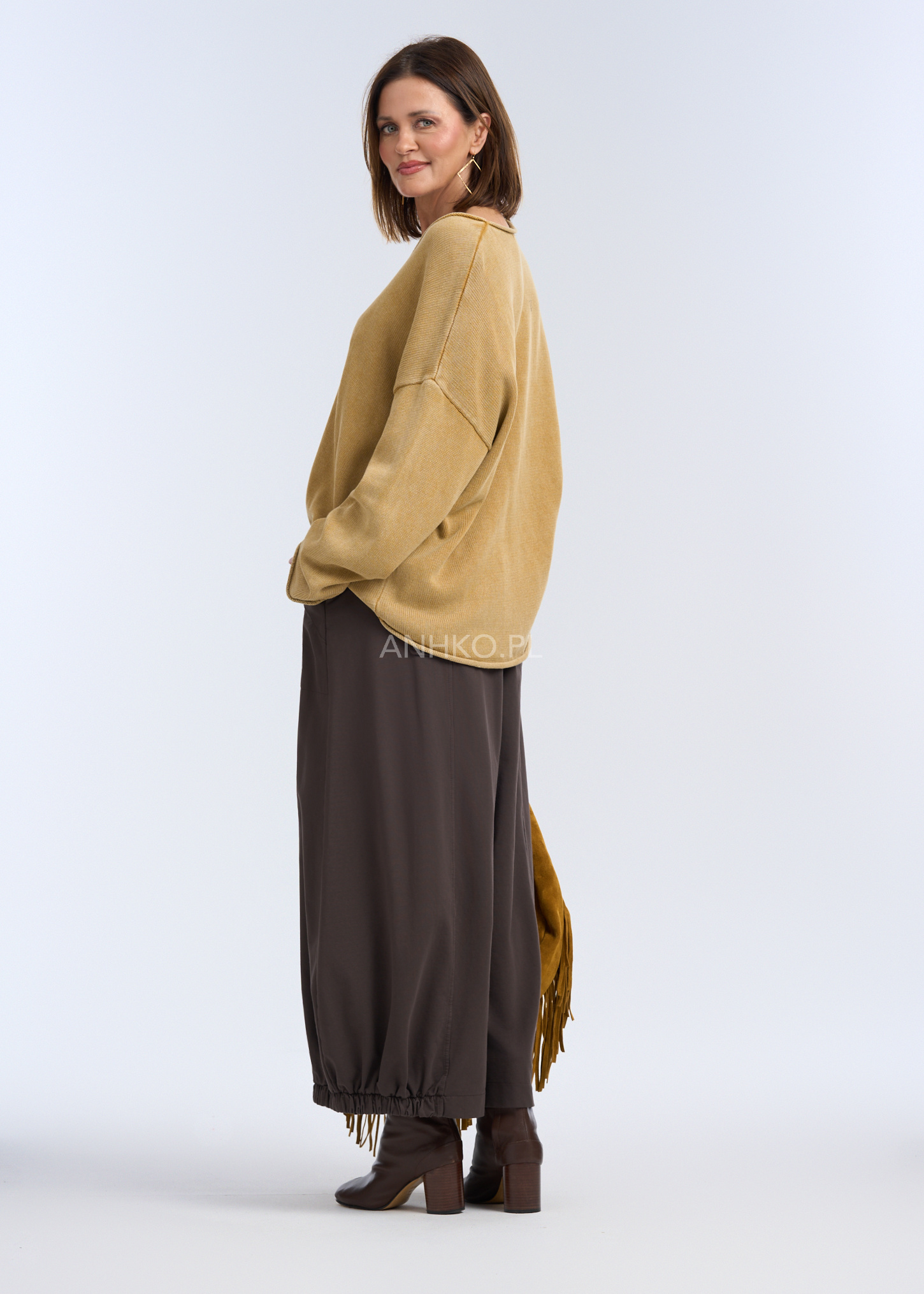 Te spodnie zostały zaprojektowane z myślą o maksymalnym komforcie i uniwersalnym stylu. Luźny krój oraz elastyczna talia sprawiają, że doskonale dopasowują się do sylwetki, nie krępując ruchów. Model posiada praktyczne kieszenie po bokach, które podnoszą funkcjonalność i codzienny charakter spodni. Nogawki zakończone delikatnym ściągaczem nadają całości nowoczesnej formy. Świetnie sprawdzą się w zestawieniu z t-shirtem, swetrem lub bluzą, zarówno na co dzień, do pracy w trybie casual, jak i na spacery czy podróże.