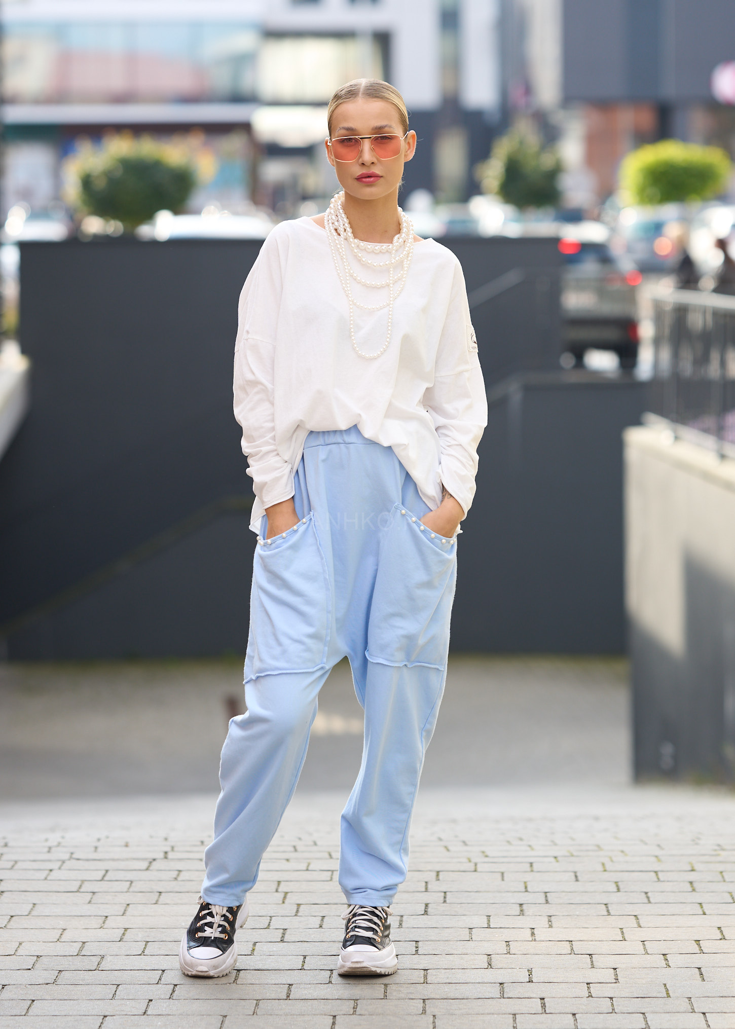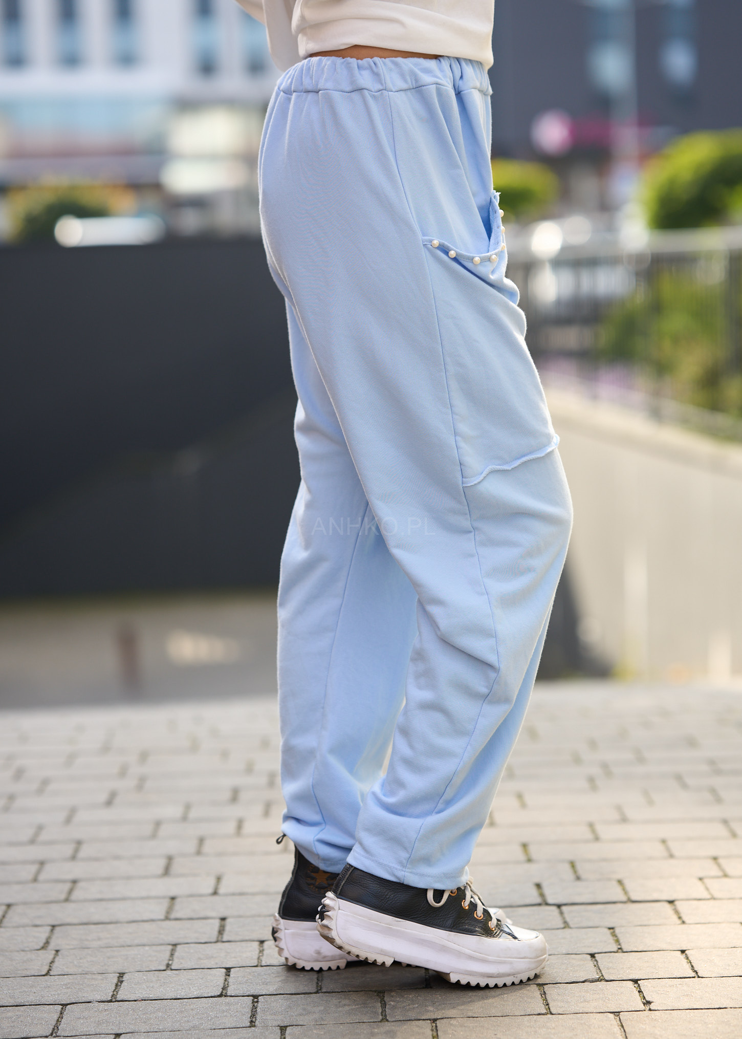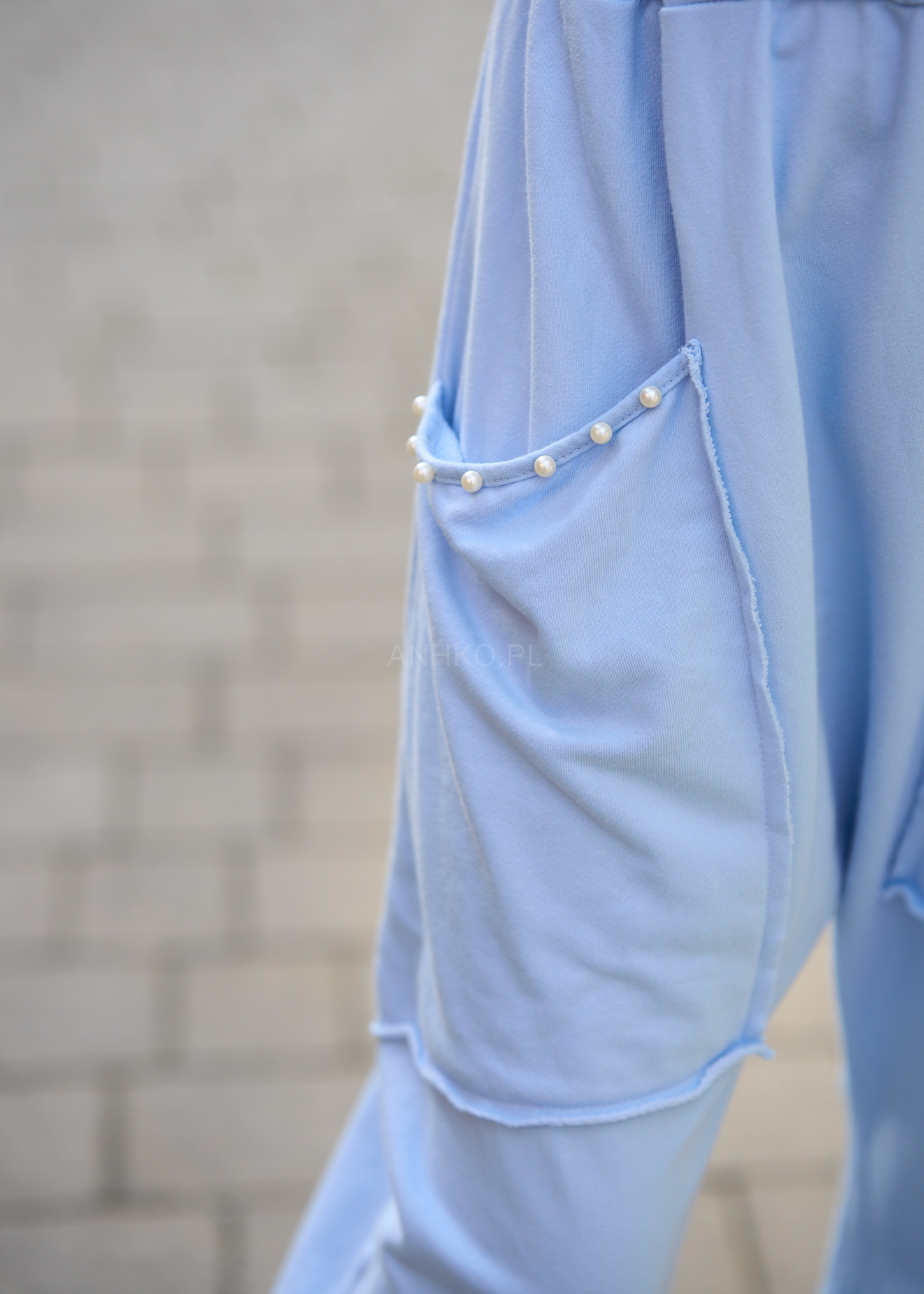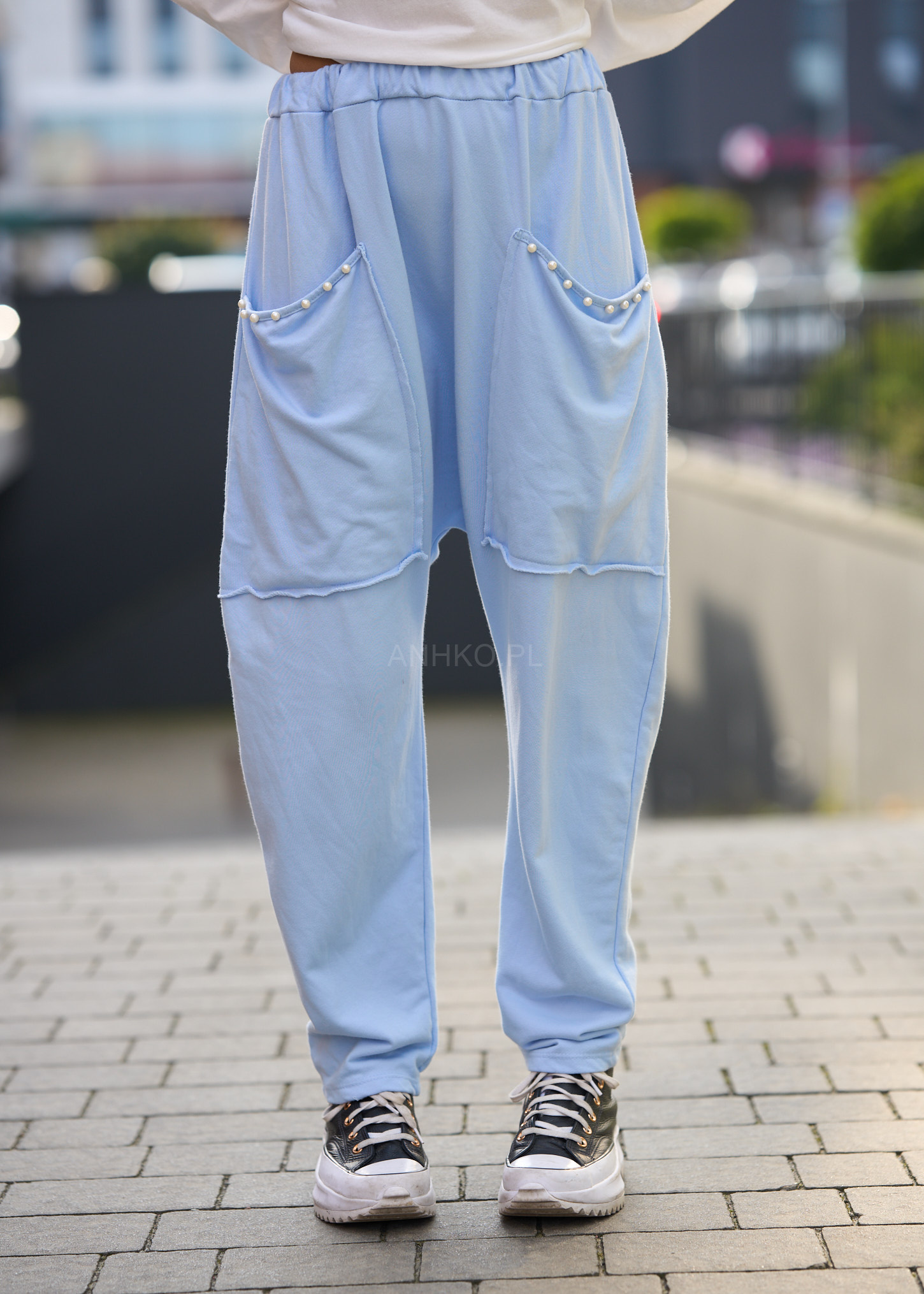 Te spodnie damskie z wysokim stanem łączą wygodę sportowego fasonu z modowym detalem, który przyciąga uwagę. Luźny krój typu harem swobodnie układa się na sylwetce, tworząc nowoczesny, lekko streetwearowy look. Jasnoniebieski kolor dodaje stylizacji świeżości, a elastyczna talia zapewnia komfort i dobre dopasowanie do figury.
