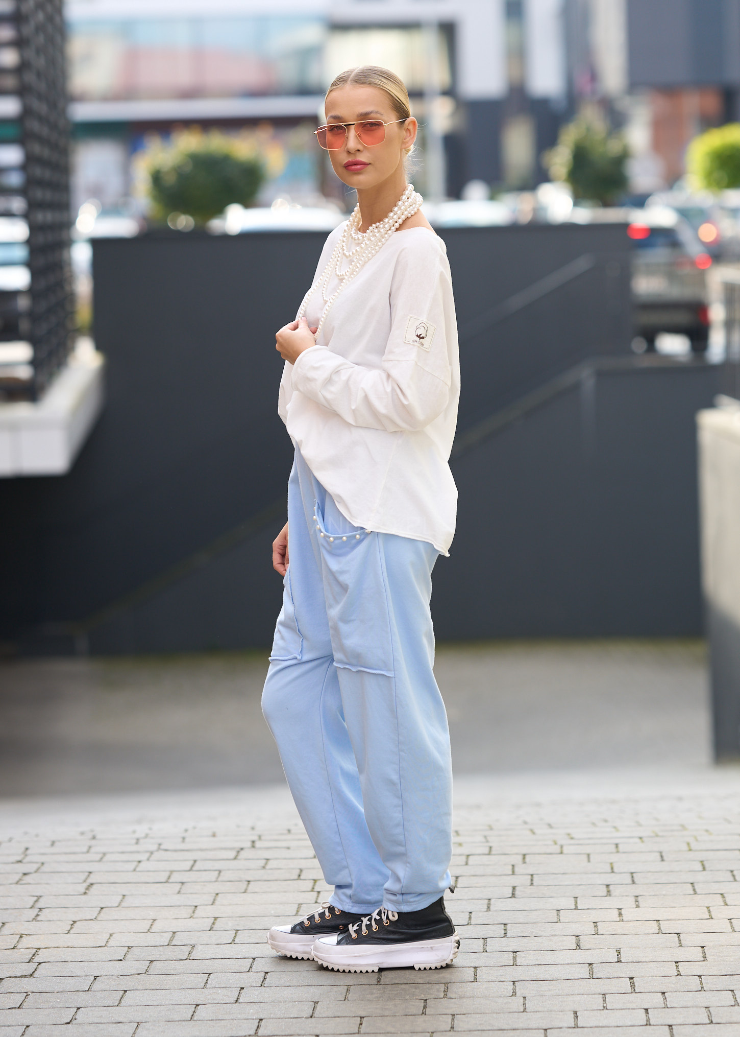 Najbardziej charakterystycznym elementem modelu są duże kieszenie ozdobione perłowymi aplikacjami, które nadają całości nieoczywistego, modowego charakteru. Miękki materiał z dodatkiem bawełny sprawia, że spodnie są przyjemne w noszeniu i dobrze pracują w ruchu. To model idealny do codziennych stylizacji – wystarczy dodać oversize’owy t-shirt, lekką bluzę lub top, aby stworzyć wygodny i stylowy zestaw.
