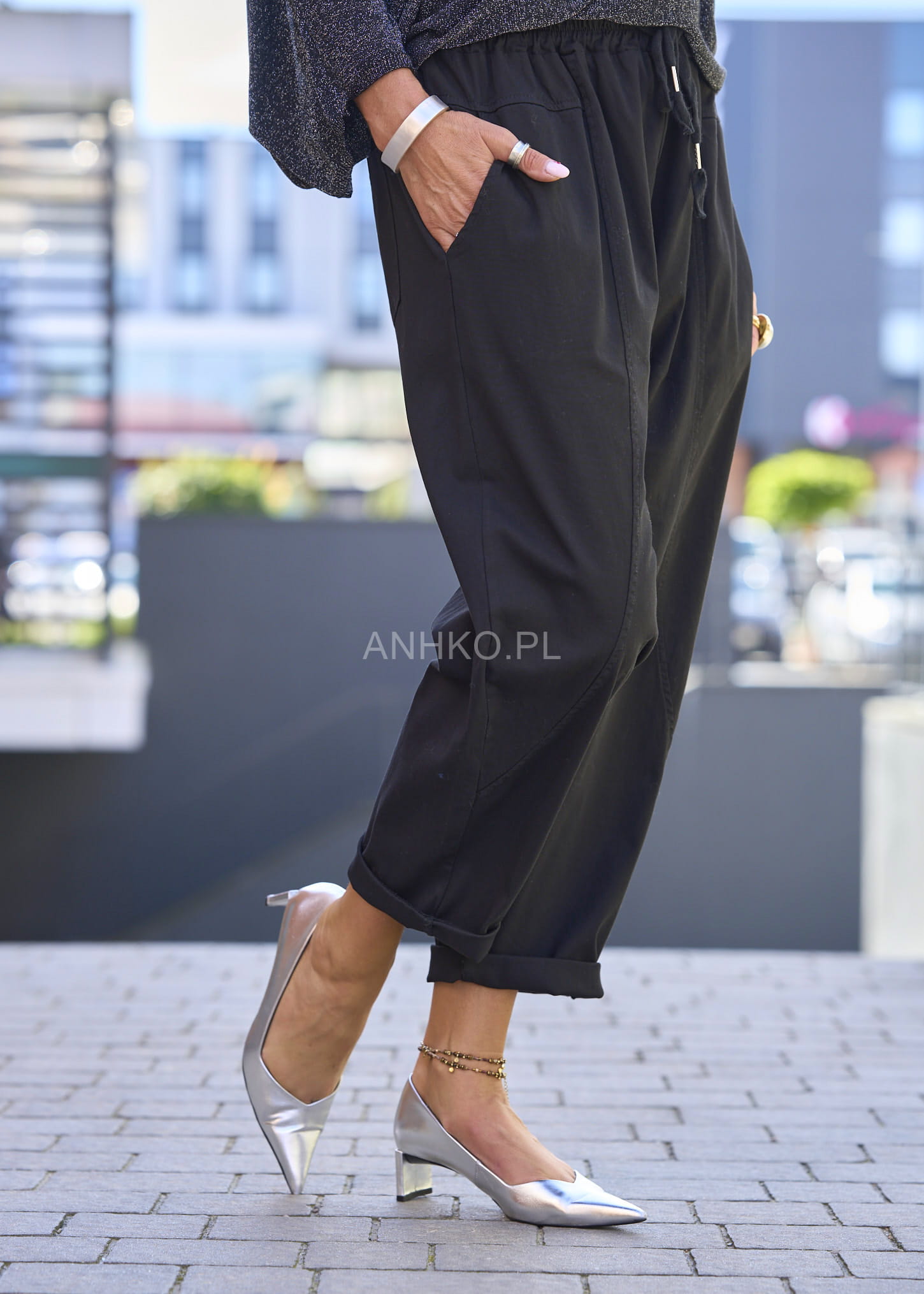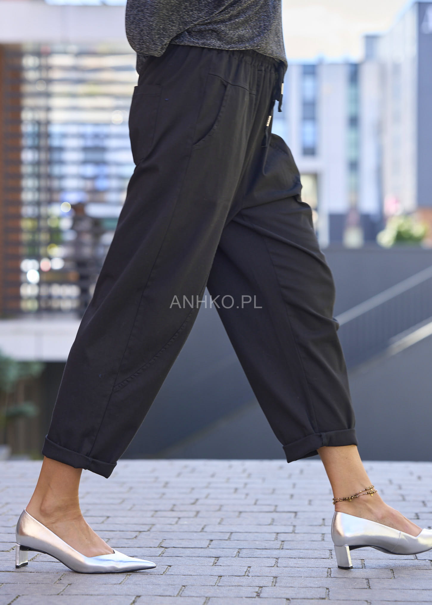 - Nogawki: Zwężane ku dołowi, z możliwością podwinięcia.