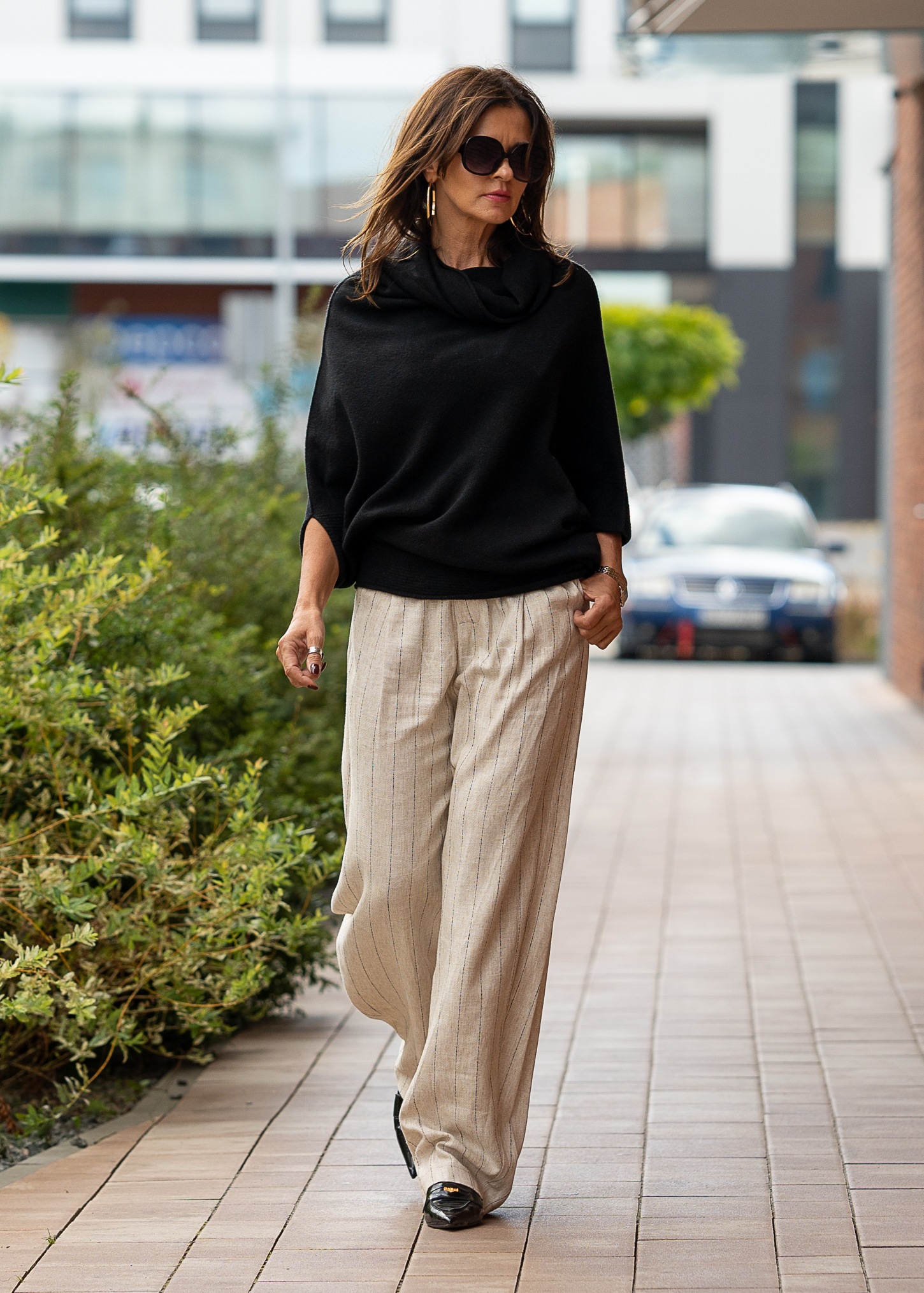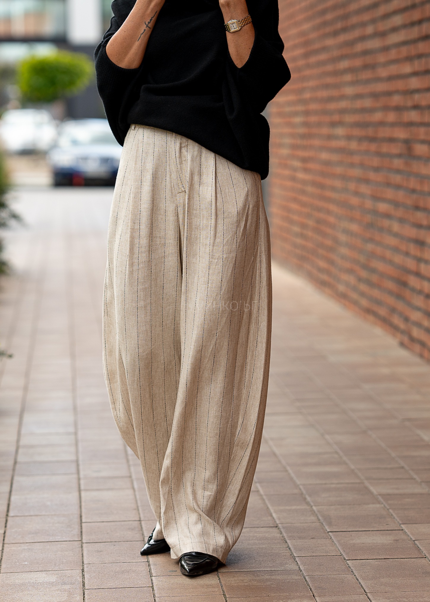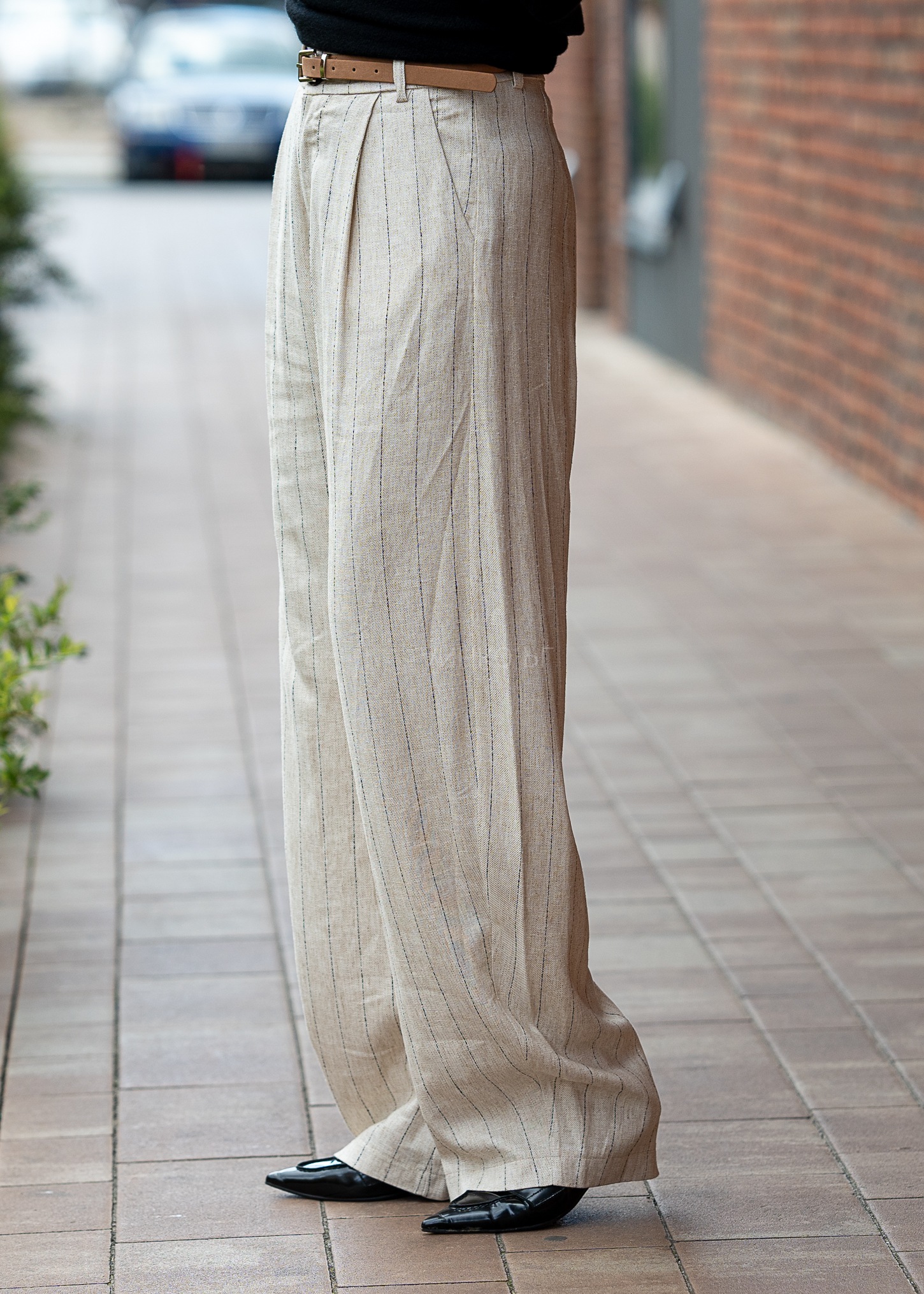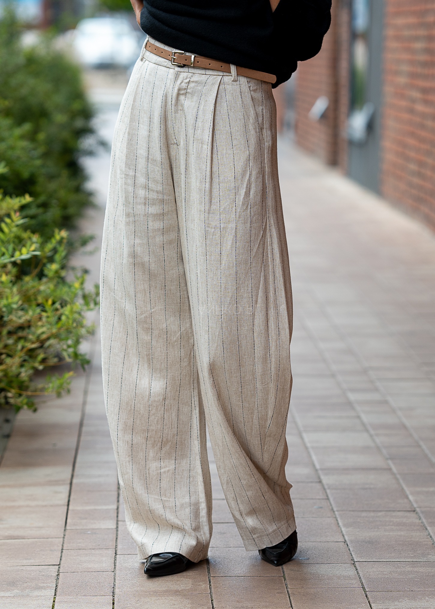 To synonim lekkości, wygody i klasy. Wykonane z wysokiej jakości mieszanki 70% wiskozy i 30% lnu z bawełnianą podszewką, zapewniają oddychalność i komfort nawet w ciepłe dni. Subtelny beżowy kolor z pionowym paskowaniem optycznie wydłuża nogi, a regulacja w pasie i smukły pasek dodają elegancji. Doskonale sprawdzą się w codziennych stylizacjach z koszulą lub T-shirtem, ale również w bardziej formalnych zestawach z marynarką. Idealne na spotkania biznesowe, letnie uroczystości, wyjścia ze znajomymi czy wakacyjne spacery w mieście.