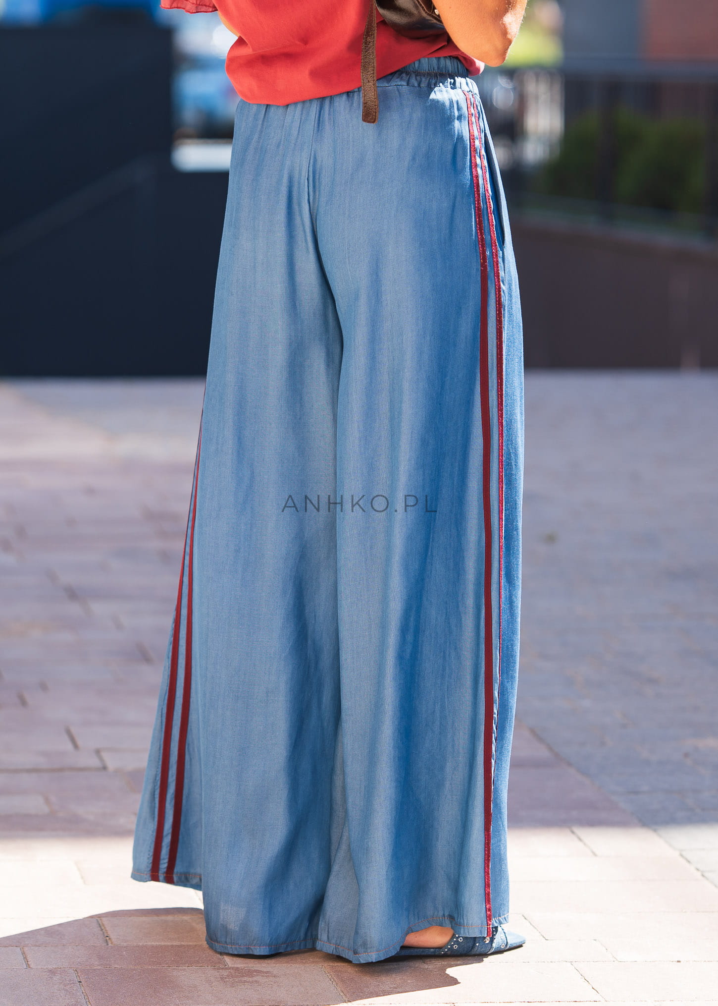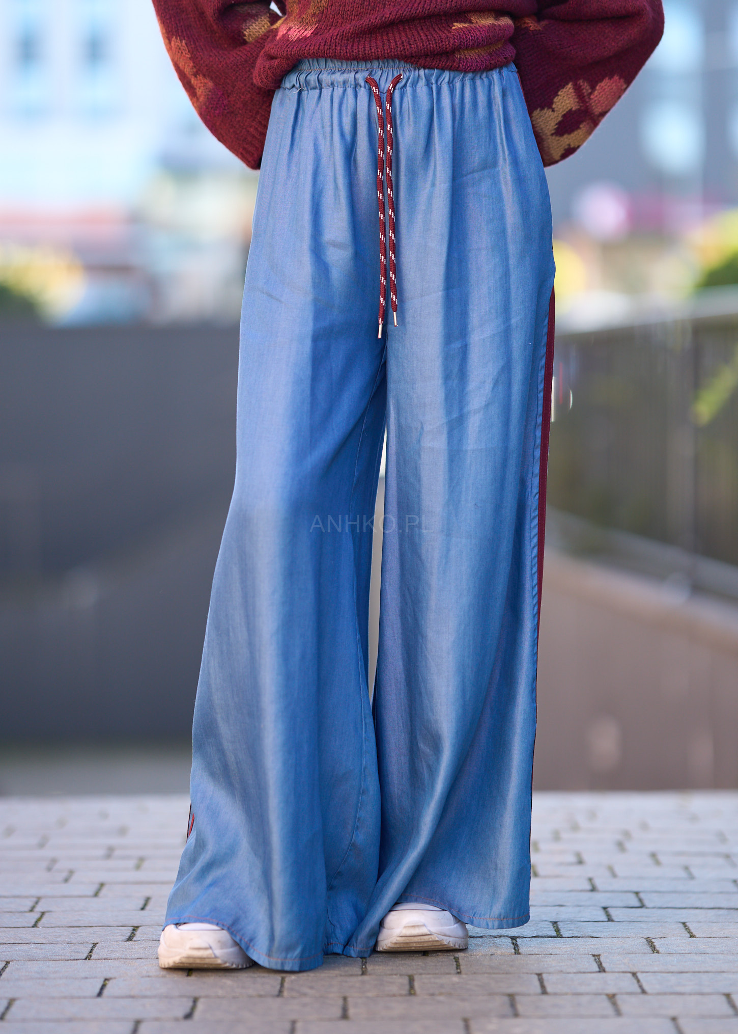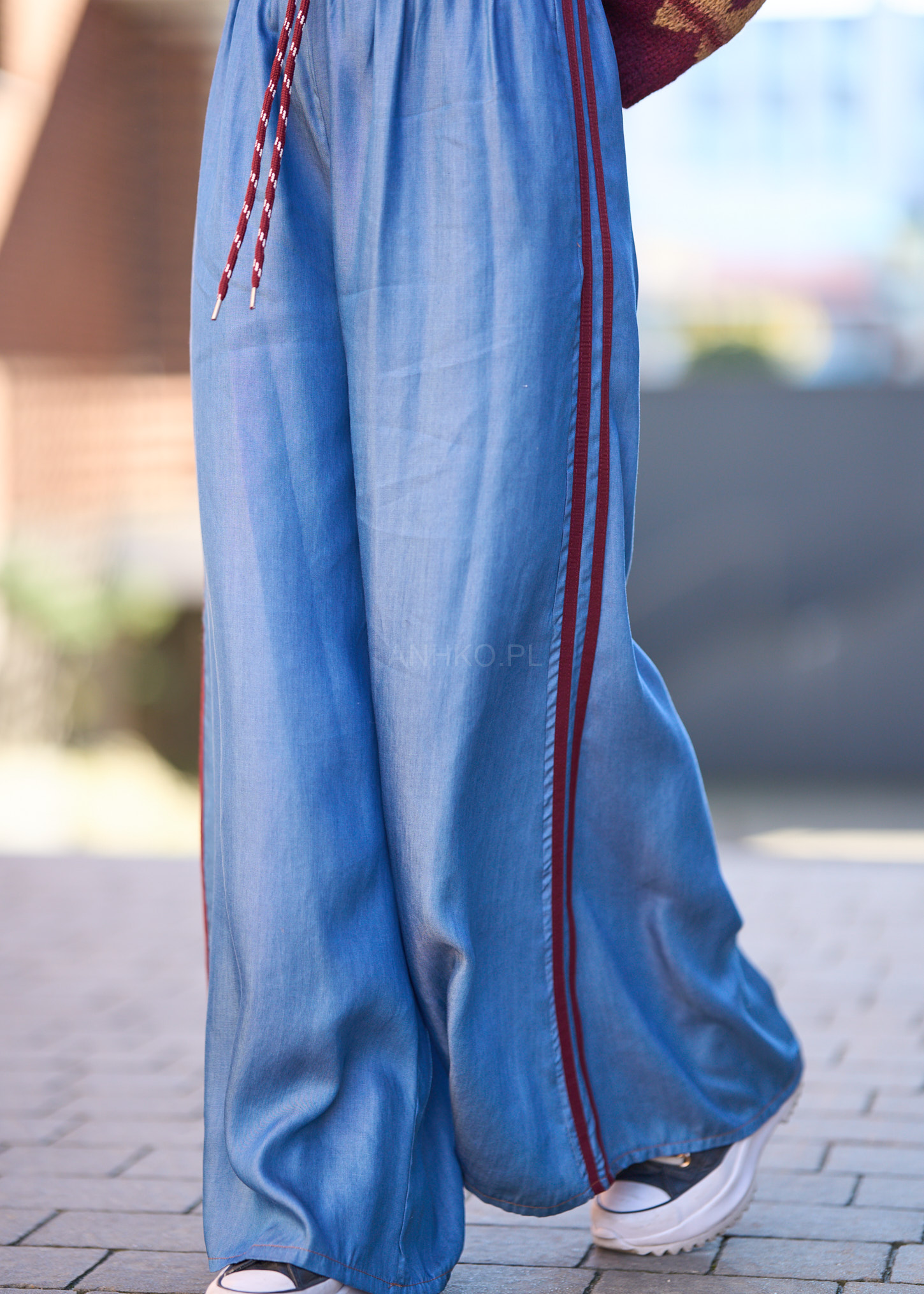 to stylowe, szerokie spodnie z miękkiego Tencelu – materiału znanego z wyjątkowego komfortu i oddychalności. Lampasy w kolorze bordowym nadają im sportowego sznytu, a elastyczna talia ze sznurkiem umożliwia dopasowanie do sylwetki. Sprawdzą się doskonale w stylizacjach casualowych i streetwearowych – zestaw je z T-shirtem i sneakersami na co dzień albo z marynarką dla stylu athleisure. Świetny wybór na podróże, weekendowy luz lub kreatywny dress code w pracy.