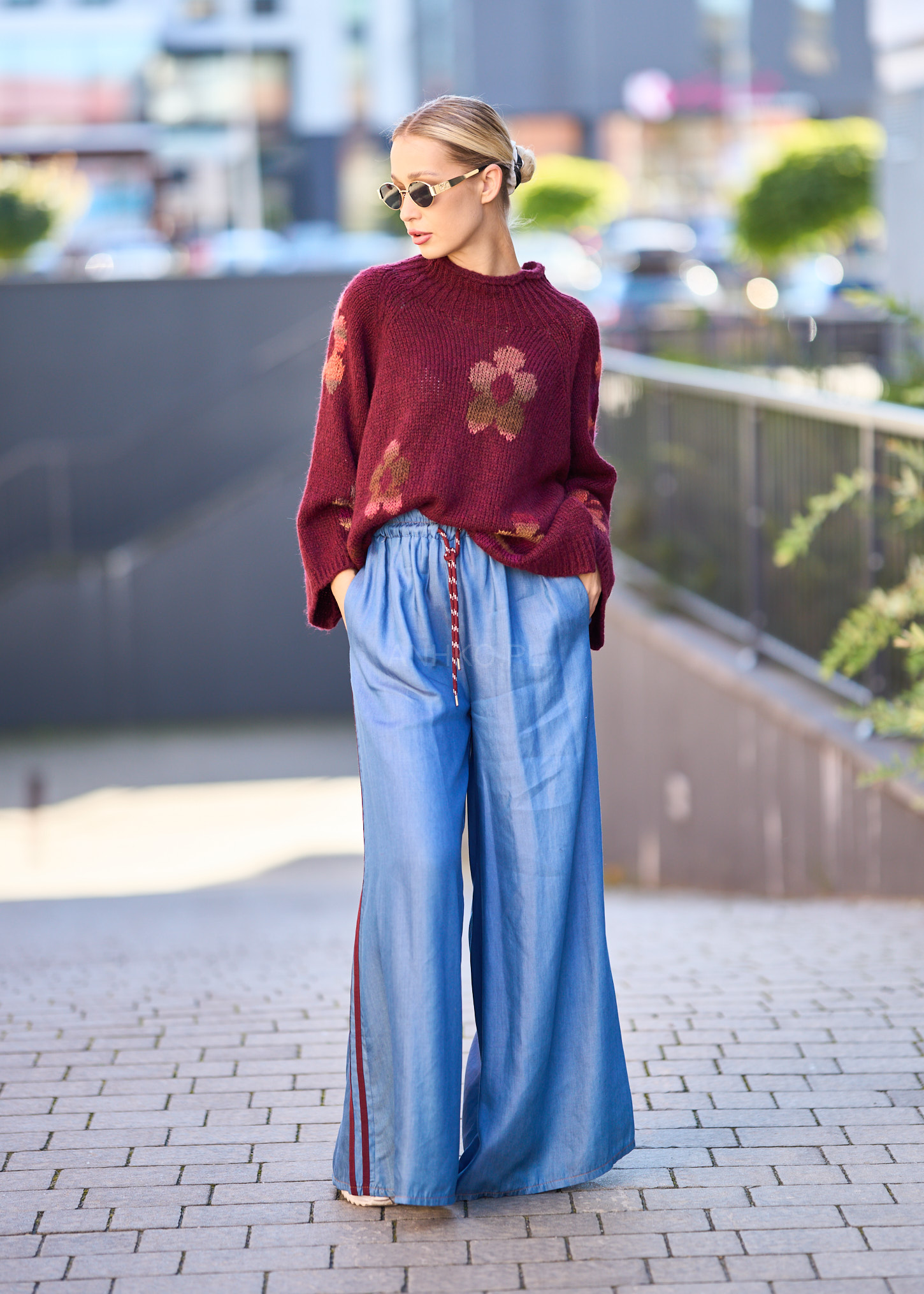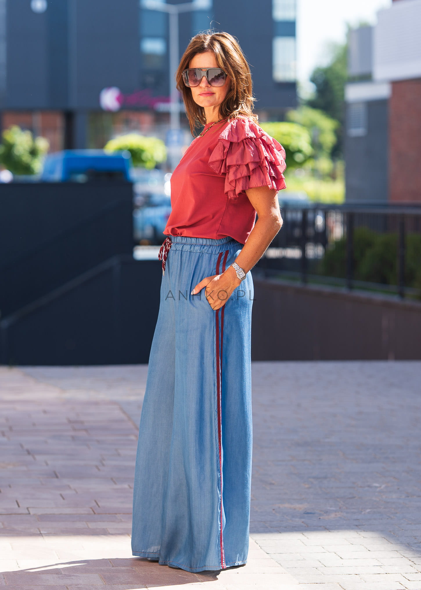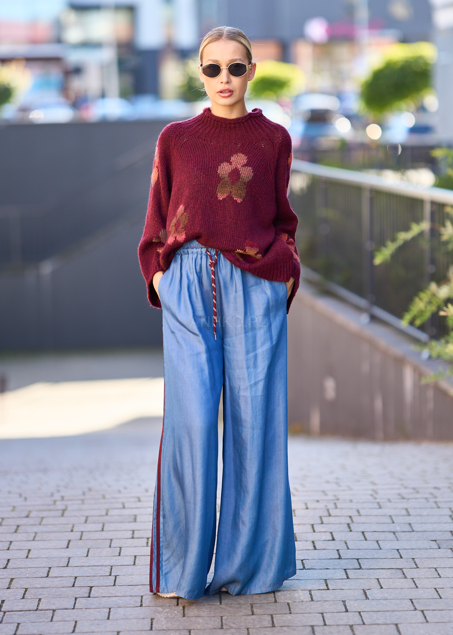 to stylowe, szerokie spodnie z miękkiego Tencelu – materiału znanego z wyjątkowego komfortu i oddychalności. Lampasy w kolorze bordowym nadają im sportowego sznytu, a elastyczna talia ze sznurkiem umożliwia dopasowanie do sylwetki. Sprawdzą się doskonale w stylizacjach casualowych i streetwearowych – zestaw je z T-shirtem i sneakersami na co dzień albo z marynarką dla stylu athleisure. Świetny wybór na podróże, weekendowy luz lub kreatywny dress code w pracy.