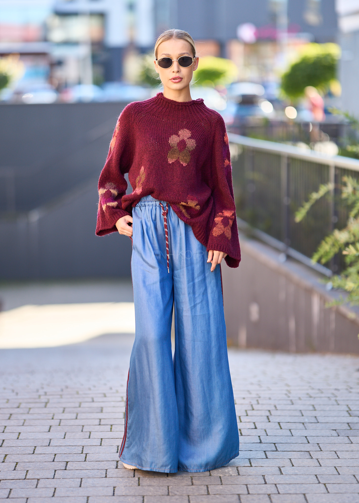 Sweter Retro Bloom Bordowy - Ciepły bordowy sweter z kwiatowym motywem w stylu retro. Miękki, włoski materiał zapewnia komfort, a oryginalny wzór dodaje charakteru każdej stylizacji. Idealny na chłodniejsze dni.