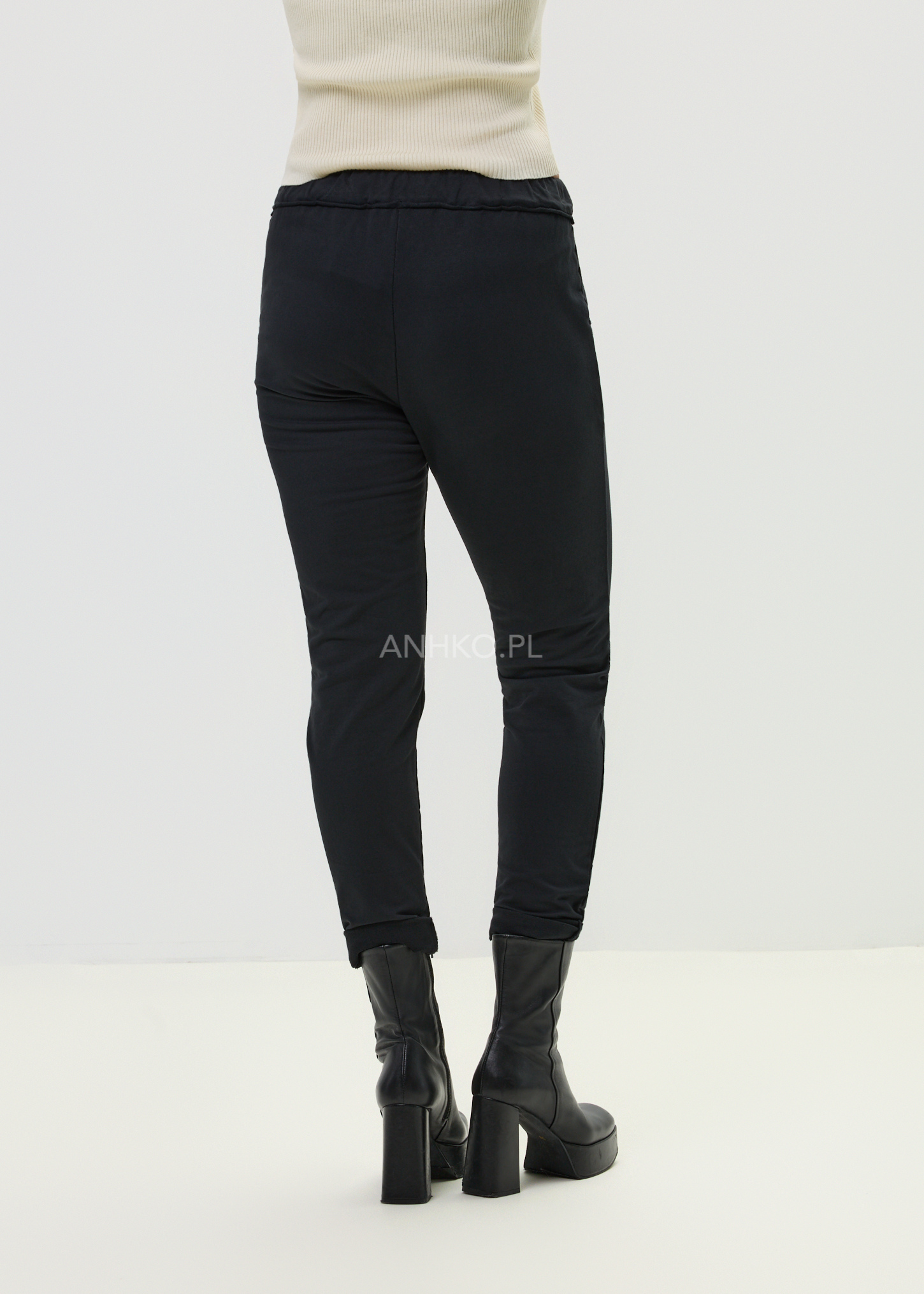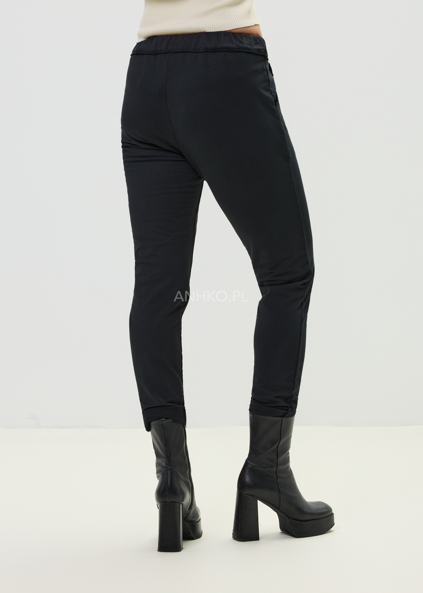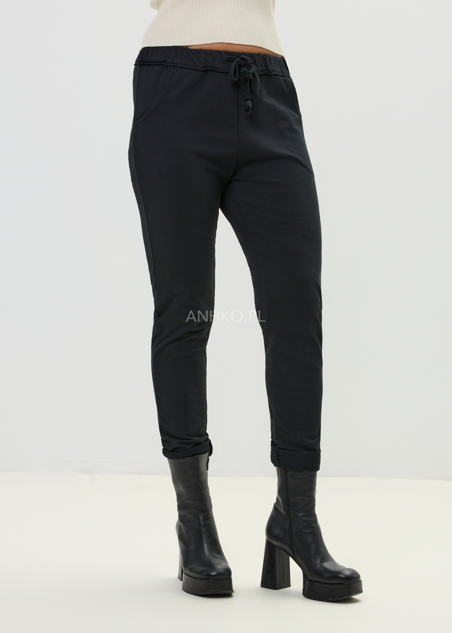 Swobodny krój gwarantuje pełną swobodę ruchów, a praktyczne kieszenie zwiększają funkcjonalność modelu. Prosta nogawka z możliwością podwinięcia pozwala łatwo zmieniać charakter stylizacji – od bardziej casualowej po lekko minimalistyczną. Czerń dodaje całości ponadczasowego charakteru i sprawia, że spodnie świetnie komponują się zarówno z T-shirtem, bluzą, jak i koszulą oversize.