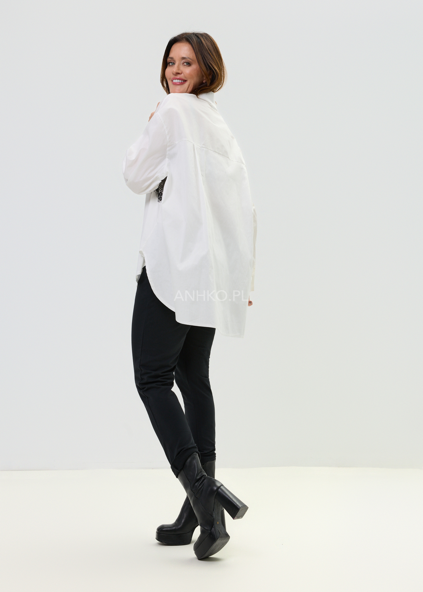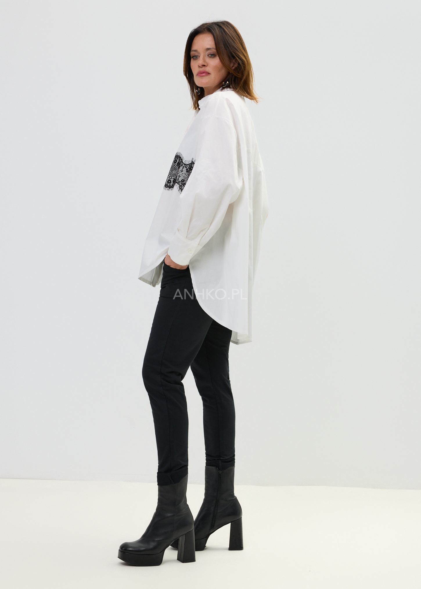 Koszula Noir Lace Story Biała - Biała koszula oversize z efektownym pasem czarnej koronki, który przyciąga uwagę i nadaje stylizacji charakteru. Lekka, wygodna i niezwykle stylowa – idealna do casualowych zestawów, ale też bardziej eleganckich looków.