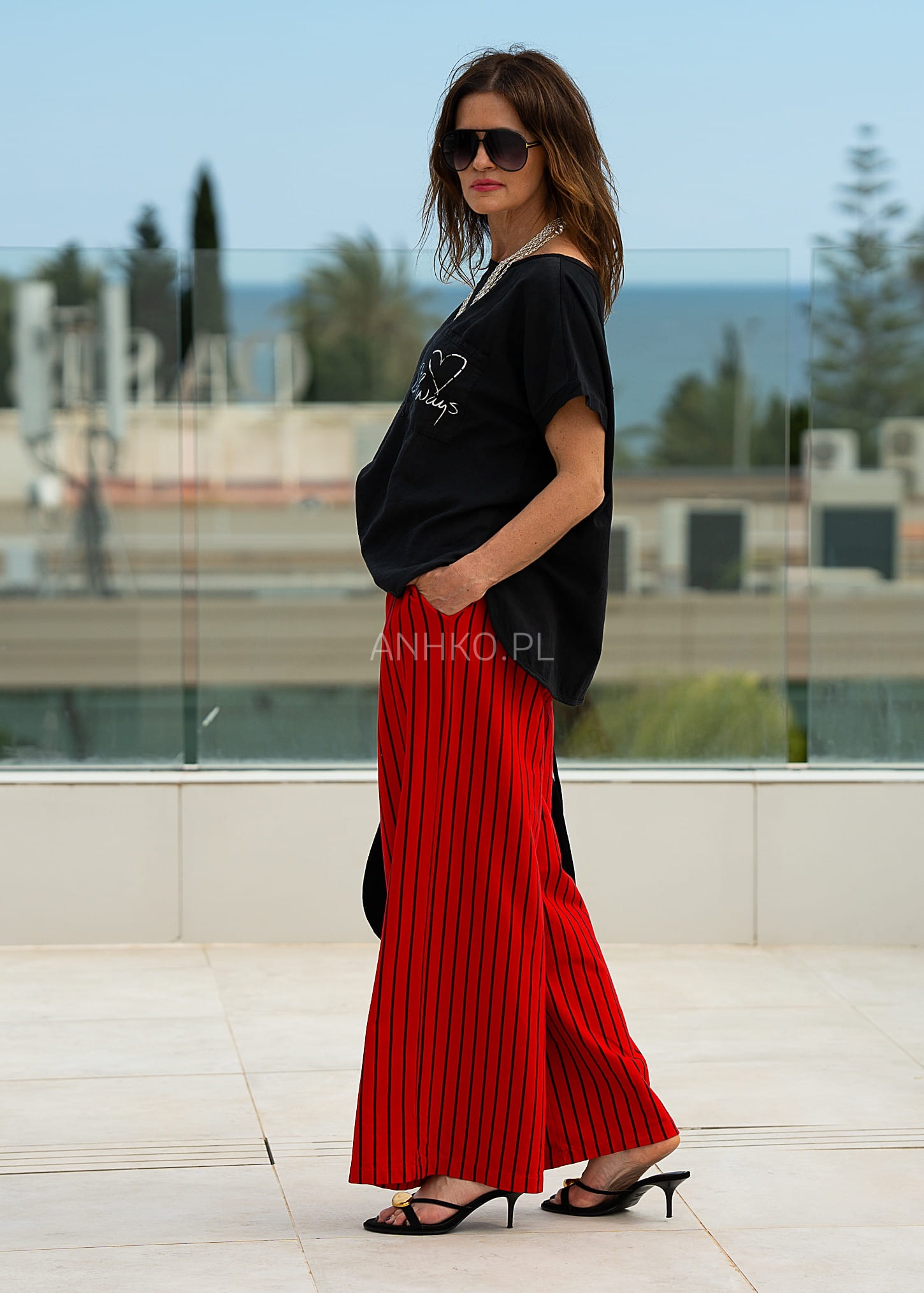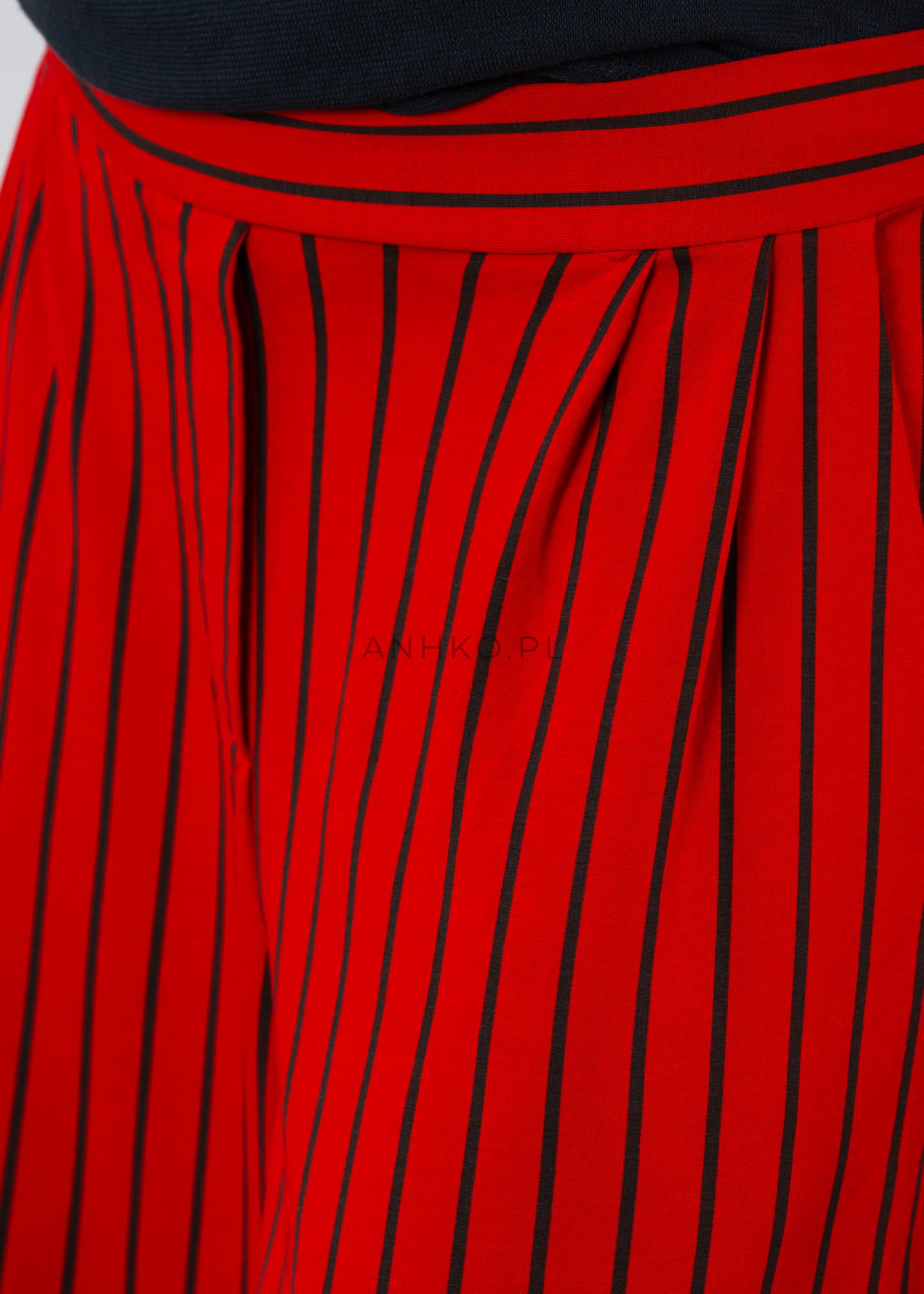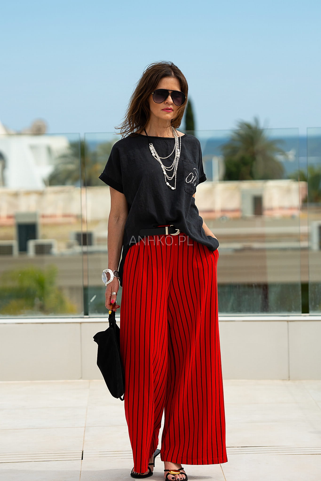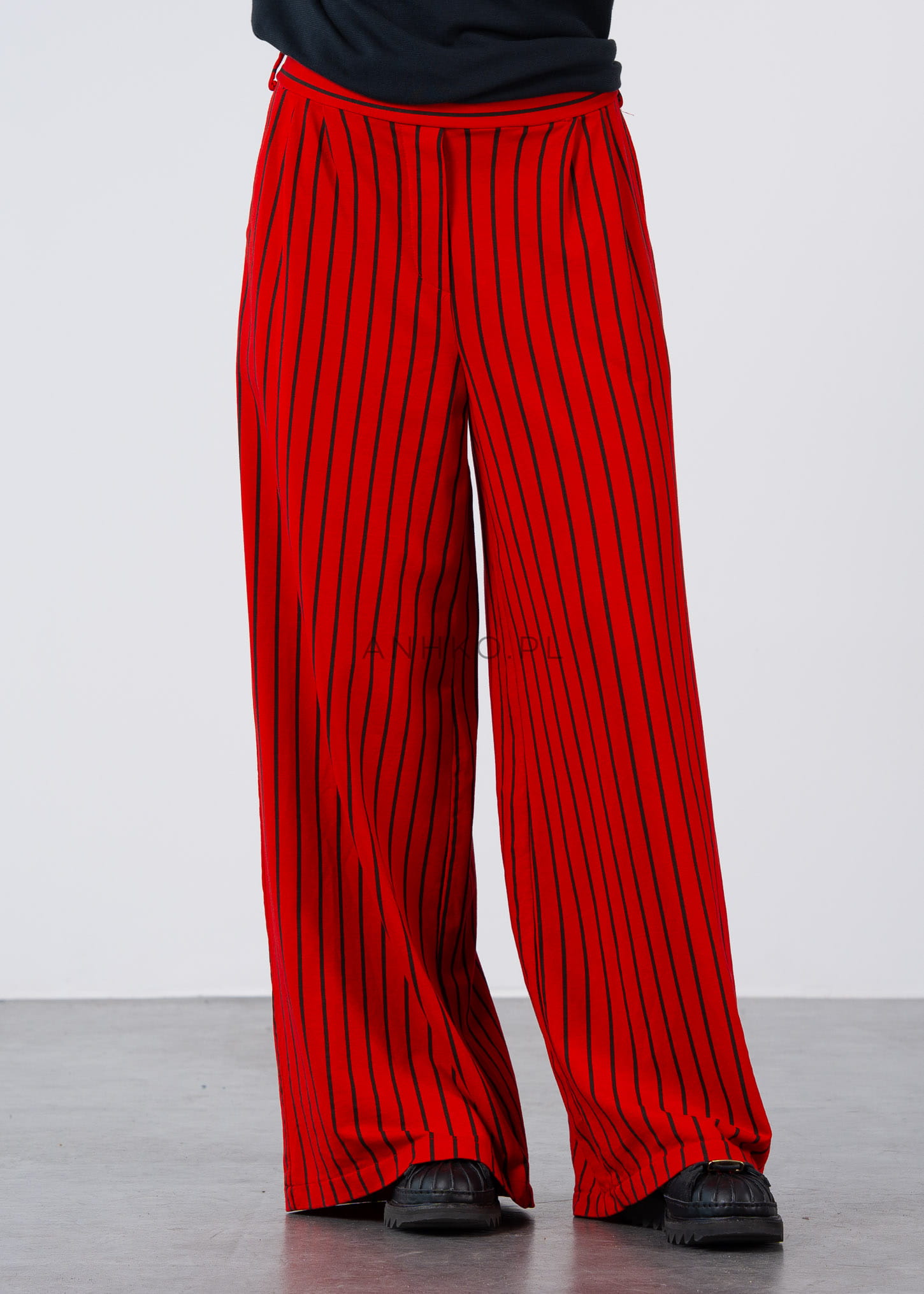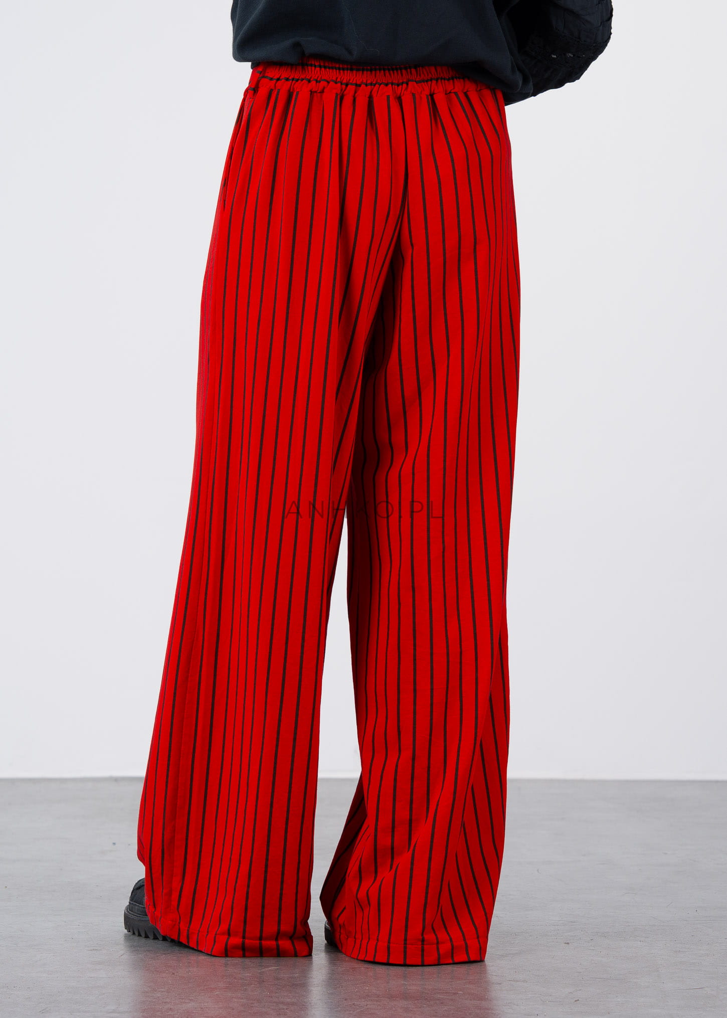 Te spodnie szerokie w intensywnym odcieniu czerwieni przyciągają spojrzenia i tworzą efektowną linię sylwetki. Pionowe paski optycznie wydłużają nogi, a swobodnie opadający fason nadaje całości lekkości i nowoczesnego charakteru. Dzięki dopracowanemu krojowi spodnie pięknie układają się w ruchu, podkreślając proporcje.