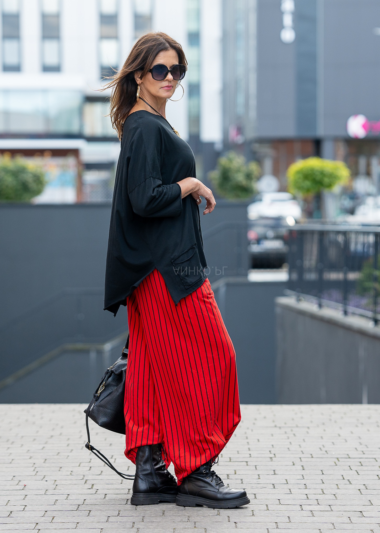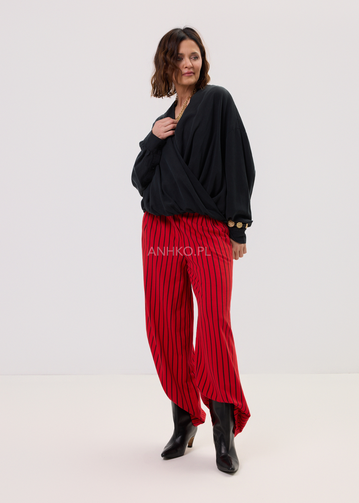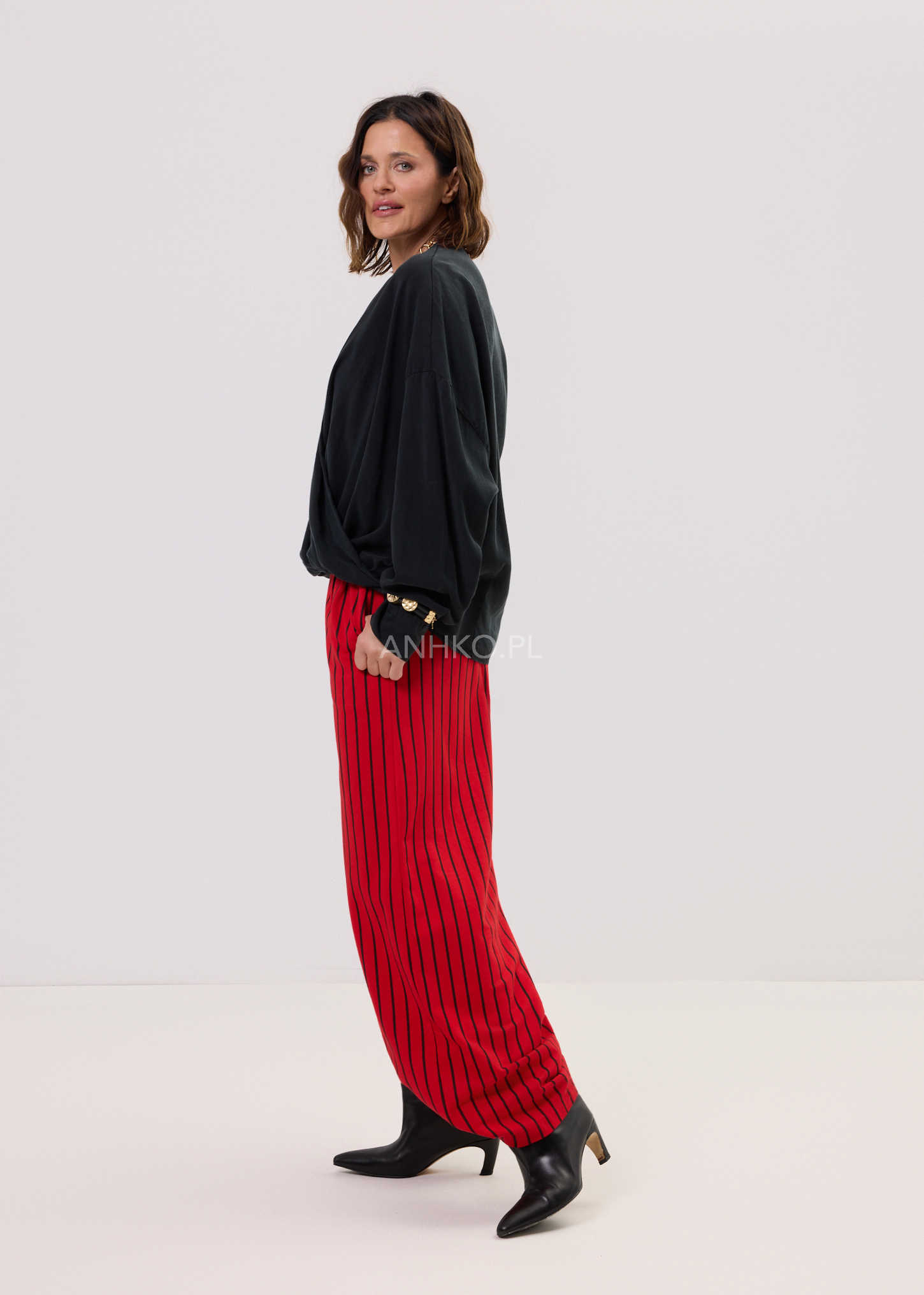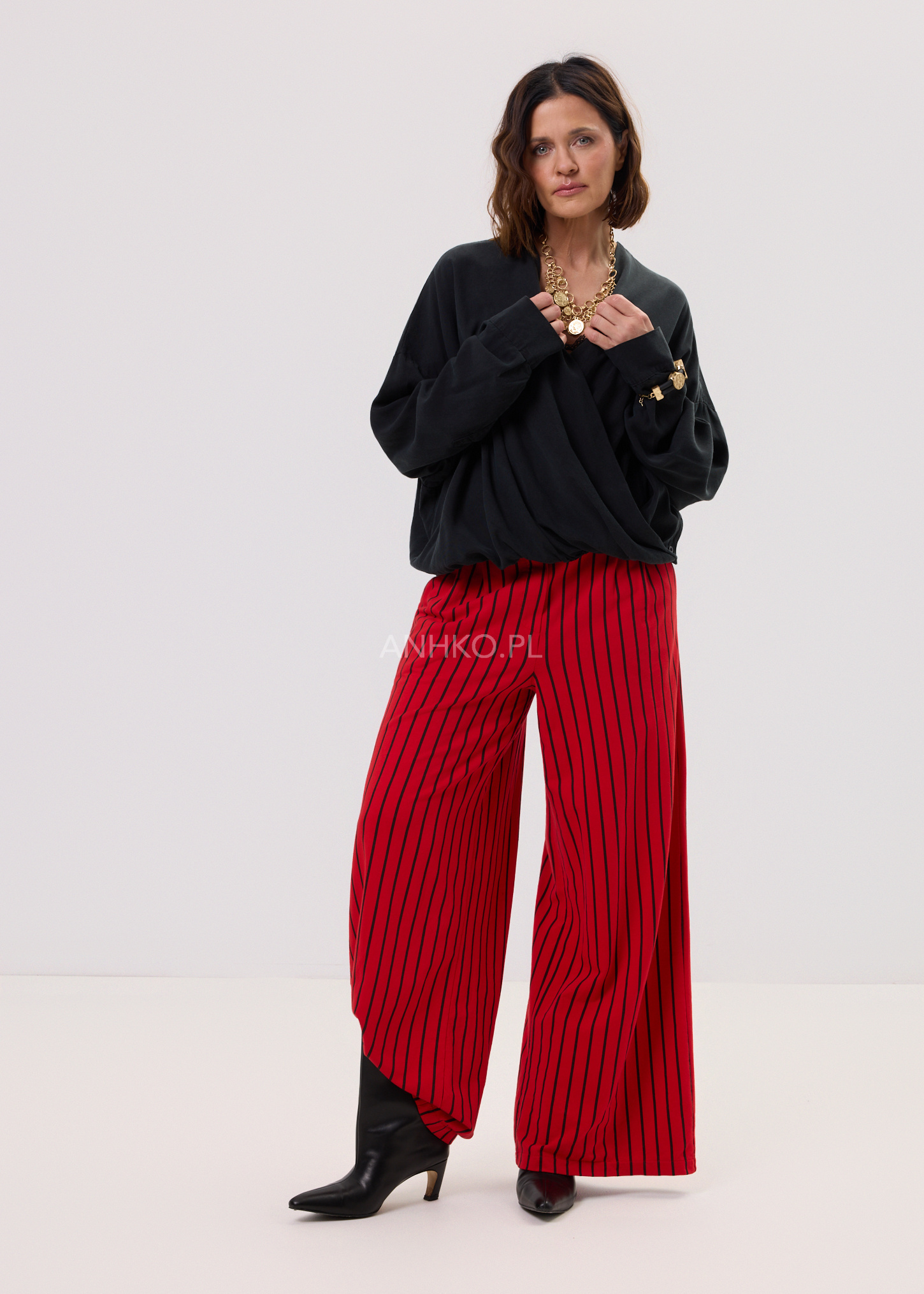 Te spodnie szerokie w intensywnym odcieniu czerwieni przyciągają spojrzenia i tworzą efektowną linię sylwetki. Pionowe paski optycznie wydłużają nogi, a swobodnie opadający fason nadaje całości lekkości i nowoczesnego charakteru. Dzięki dopracowanemu krojowi spodnie pięknie układają się w ruchu, podkreślając proporcje.