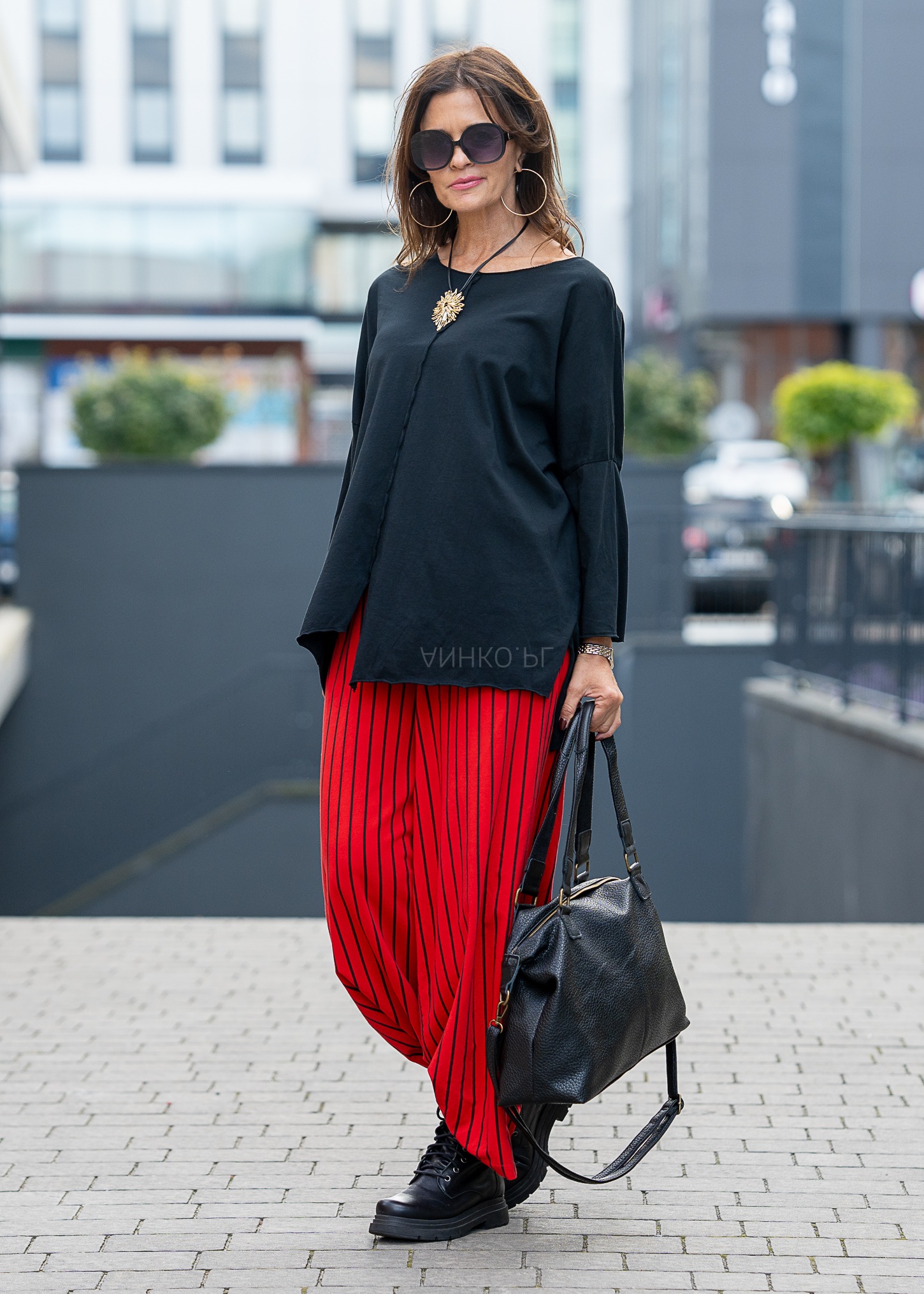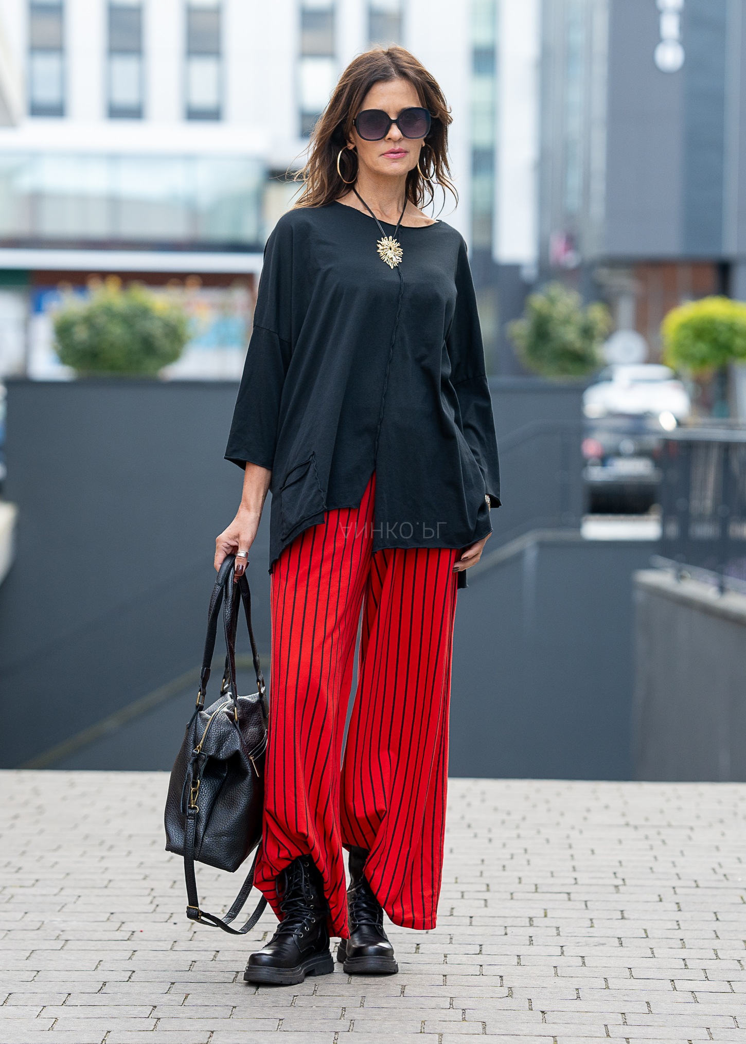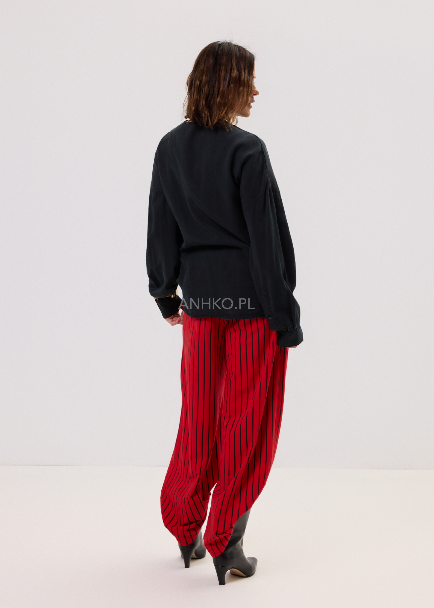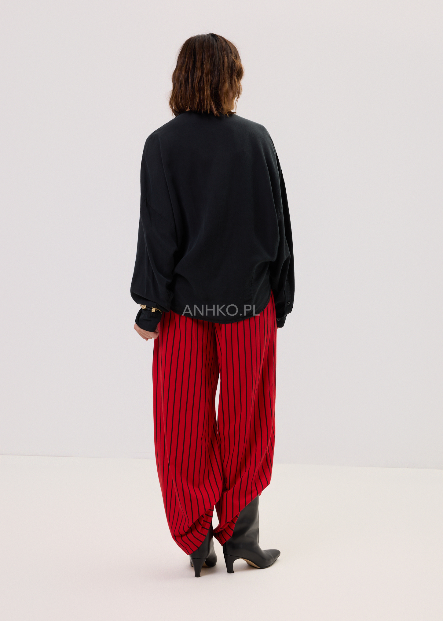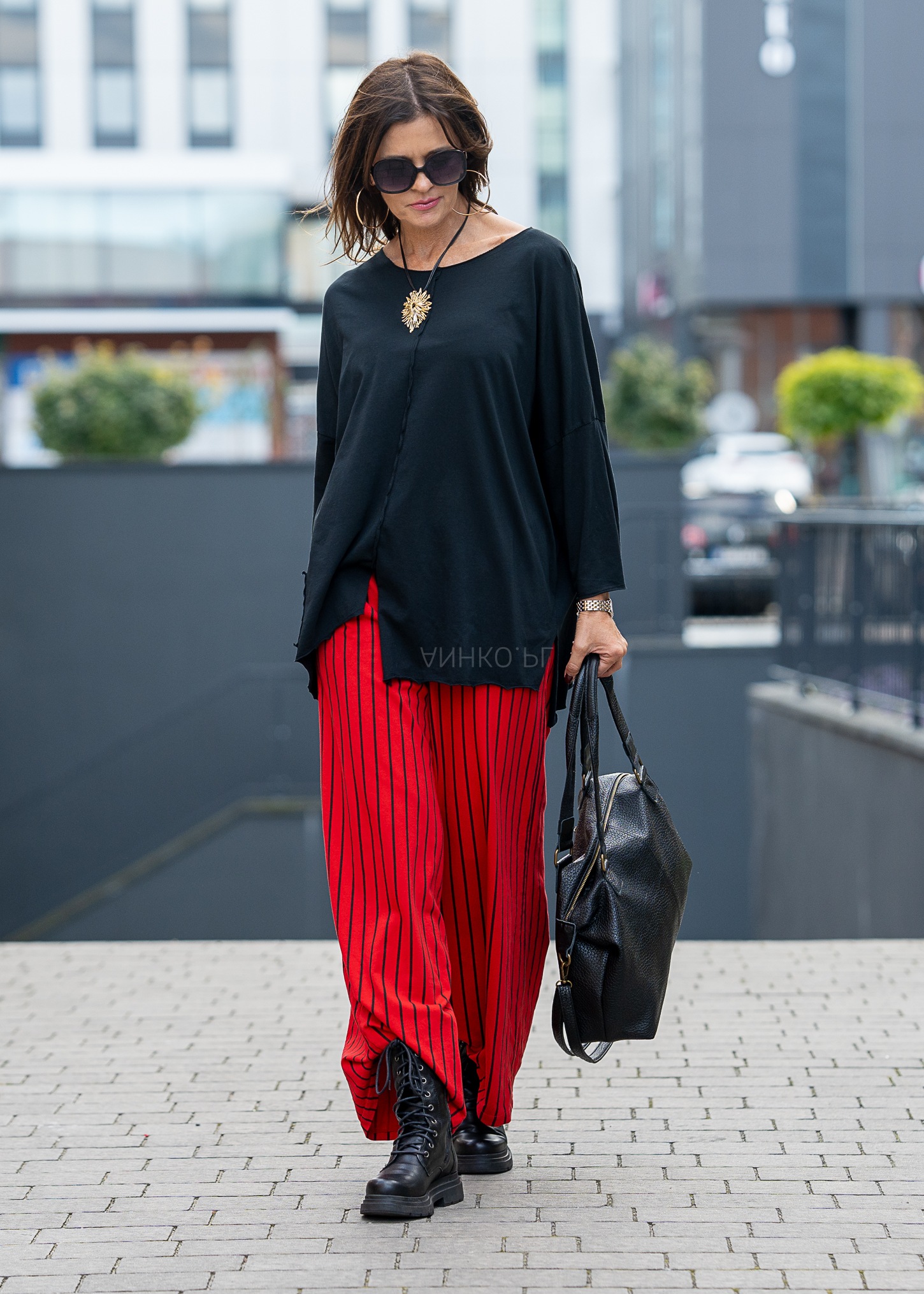Te spodnie szerokie w intensywnym odcieniu czerwieni przyciągają spojrzenia i tworzą efektowną linię sylwetki. Pionowe paski optycznie wydłużają nogi, a swobodnie opadający fason nadaje całości lekkości i nowoczesnego charakteru. Dzięki dopracowanemu krojowi spodnie pięknie układają się w ruchu, podkreślając proporcje.