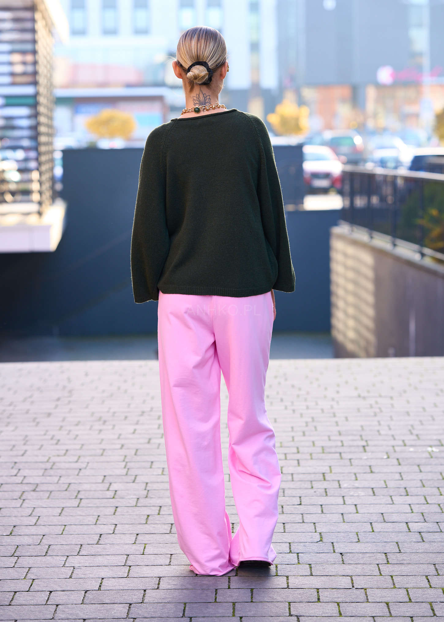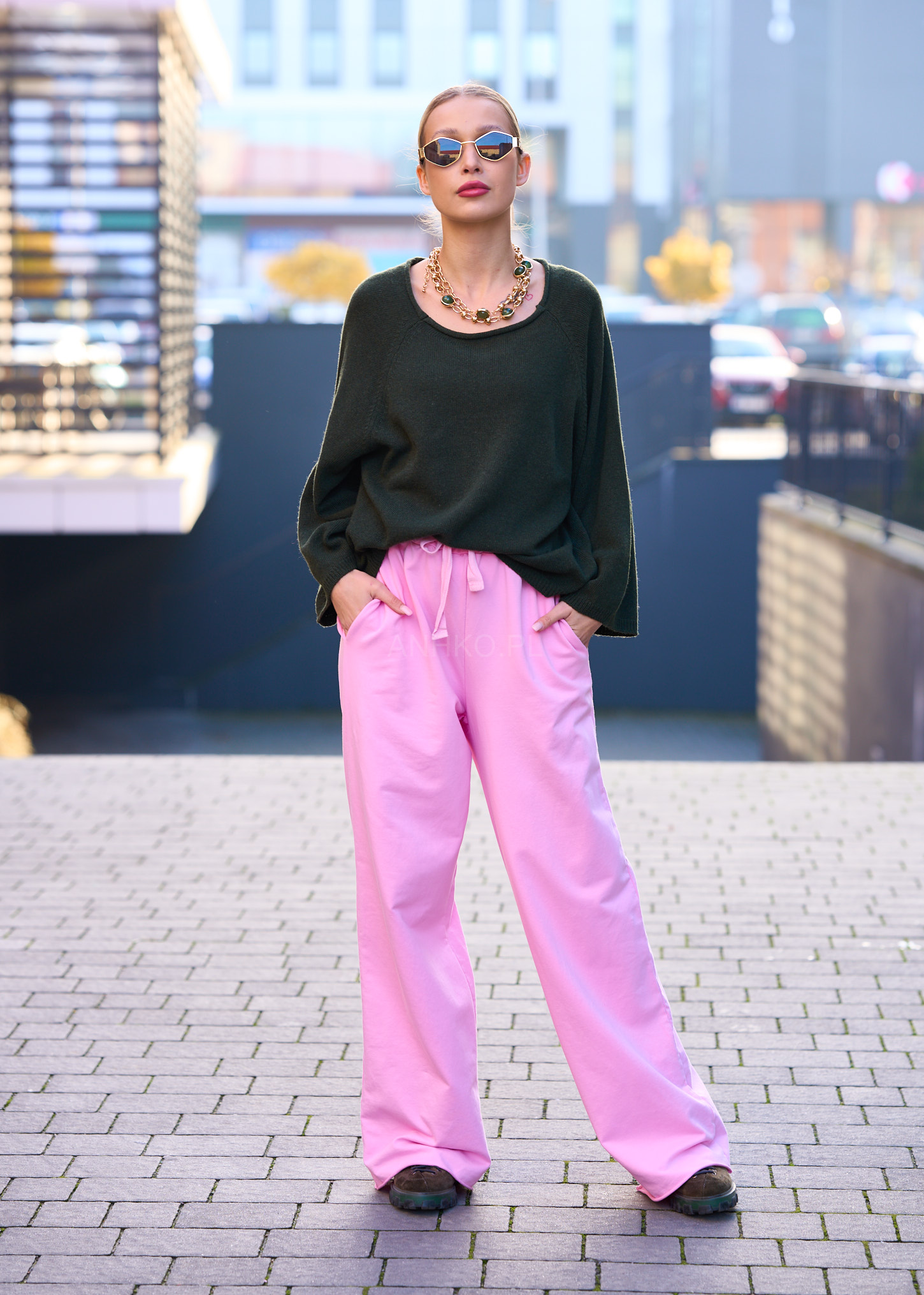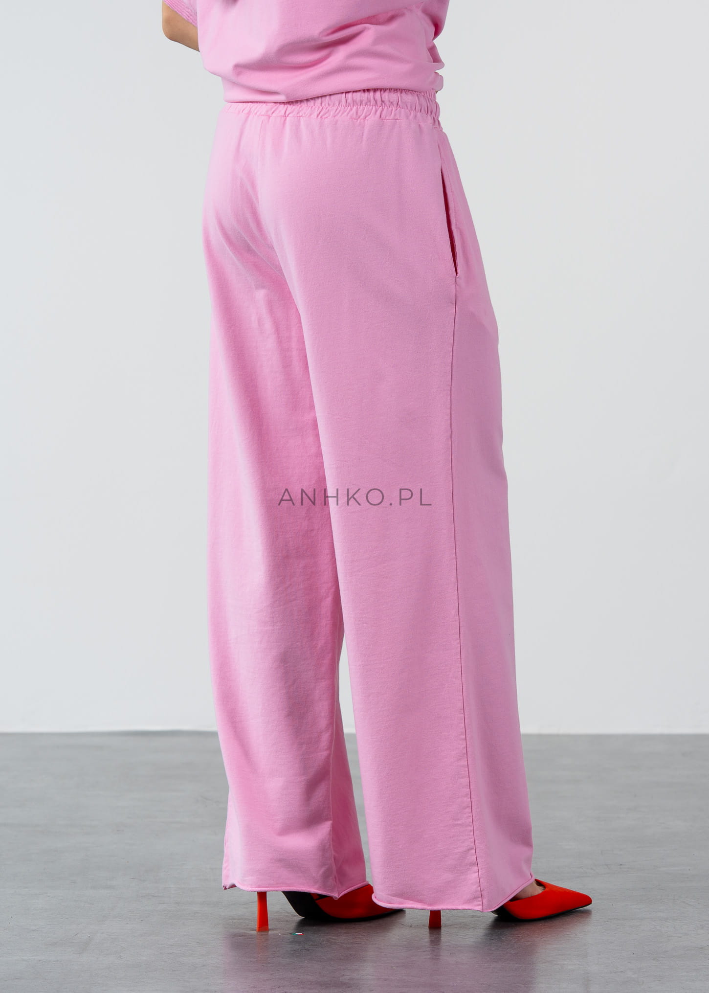 Te spodnie damskie przyciągają uwagę intensywnym odcieniem różu i swobodnym krojem, który pięknie układa się na sylwetce. Luźna nogawka miękko opada wzdłuż nóg, tworząc modny, lekko oversize’owy efekt. Elastyczna talia ze sznurkiem pozwala łatwo dopasować spodnie do figury, a przyjemna w dotyku dzianina zapewnia wygodę przez cały dzień.