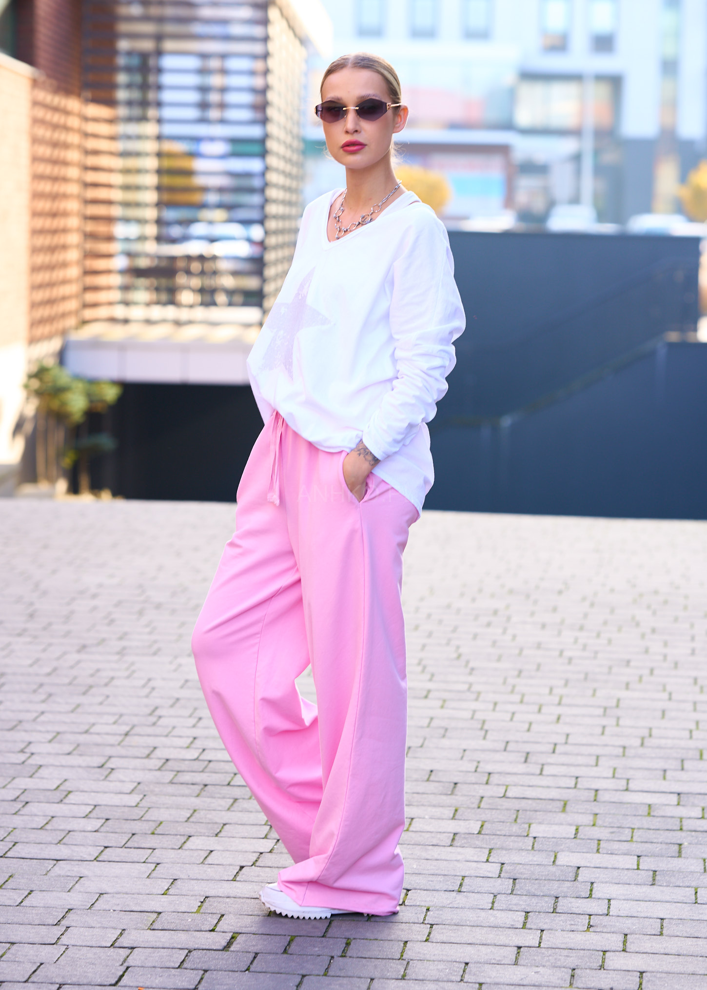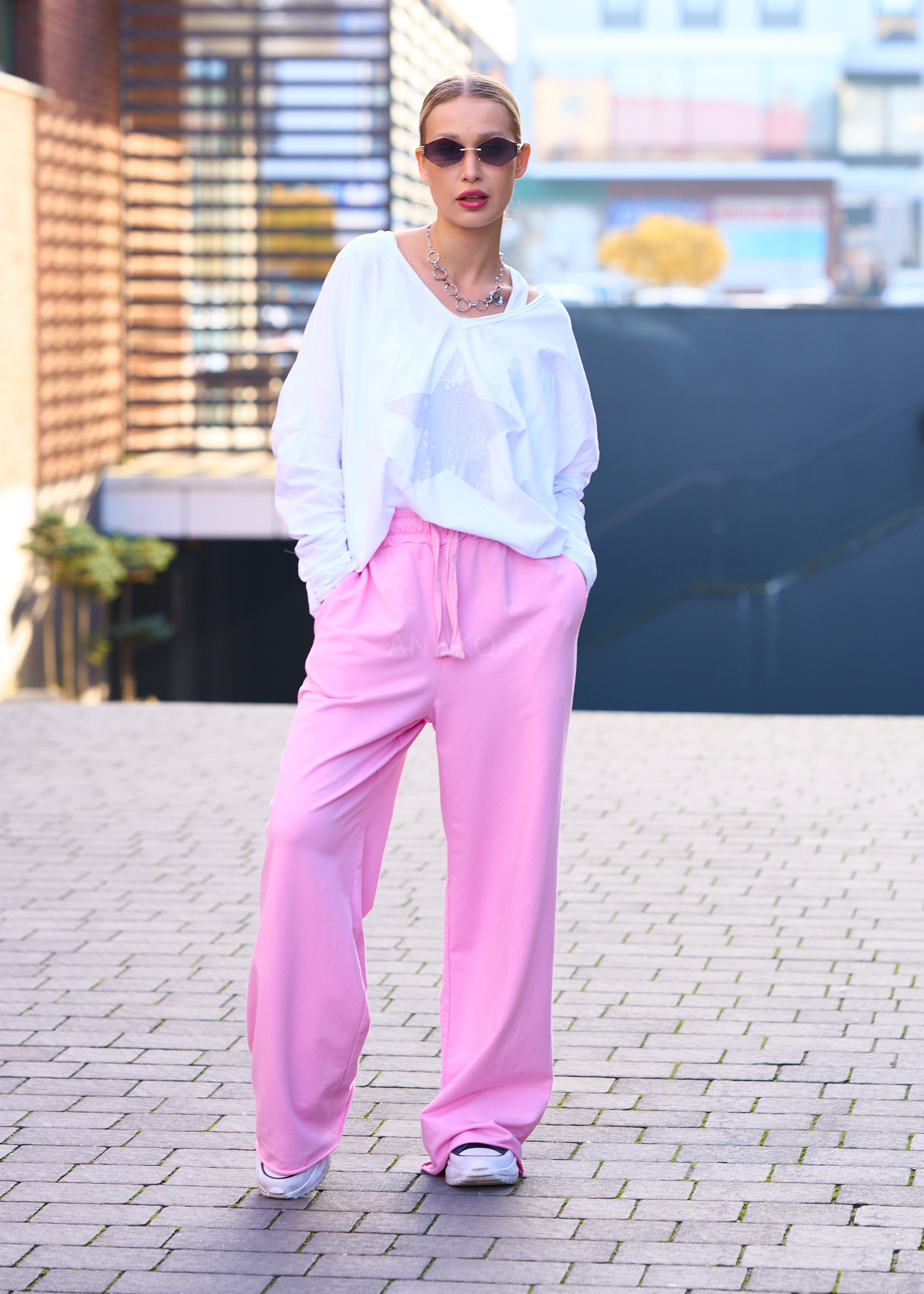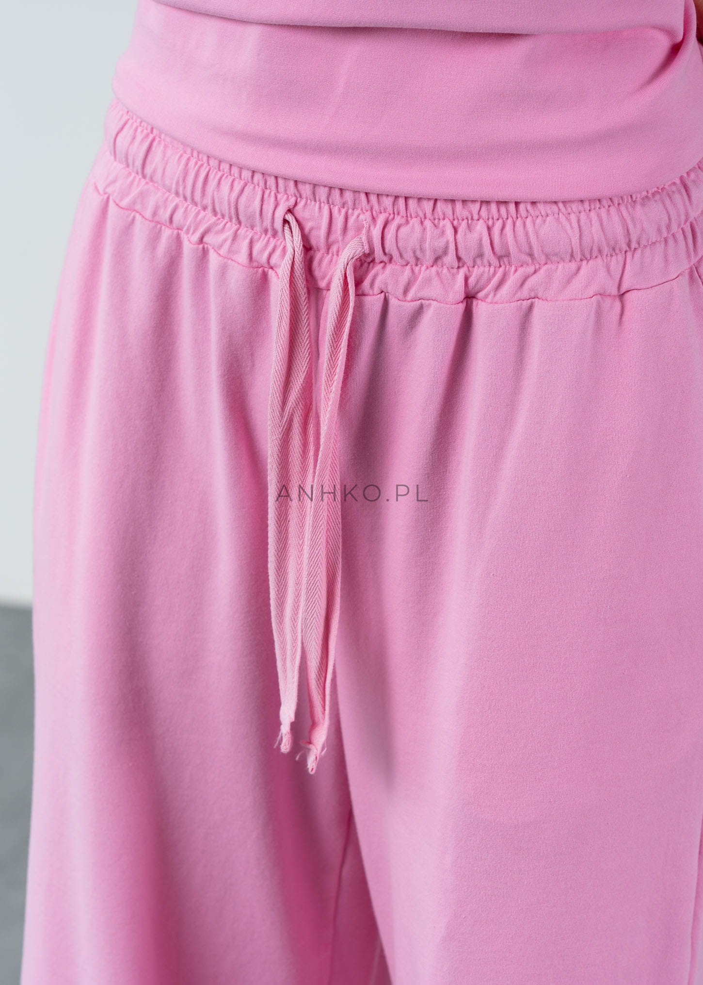 Te spodnie damskie przyciągają uwagę intensywnym odcieniem różu i swobodnym krojem, który pięknie układa się na sylwetce. Luźna nogawka miękko opada wzdłuż nóg, tworząc modny, lekko oversize’owy efekt. Elastyczna talia ze sznurkiem pozwala łatwo dopasować spodnie do figury, a przyjemna w dotyku dzianina zapewnia wygodę przez cały dzień.
