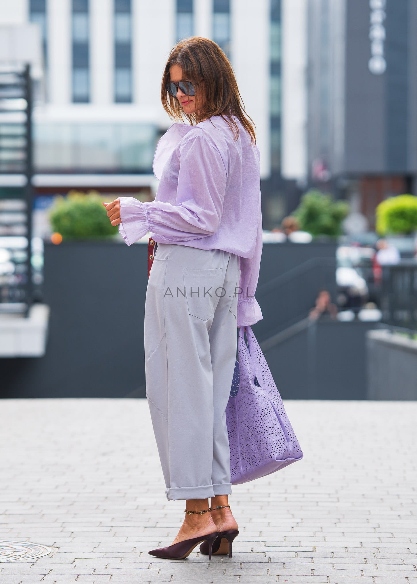 Torebka Perforated w kolorze liliowym, z dziurkowanym wzorem na całej powierzchni. Wyjątkowa konstrukcja z dwoma raczkami, zapinana na zamek. Z dodatkową dużą kosmetyczką na zamek i regulowanym długim paskiem. Idealna na co dzień lub specjalne okazje, łączy elegancję z unikalnym stylem.