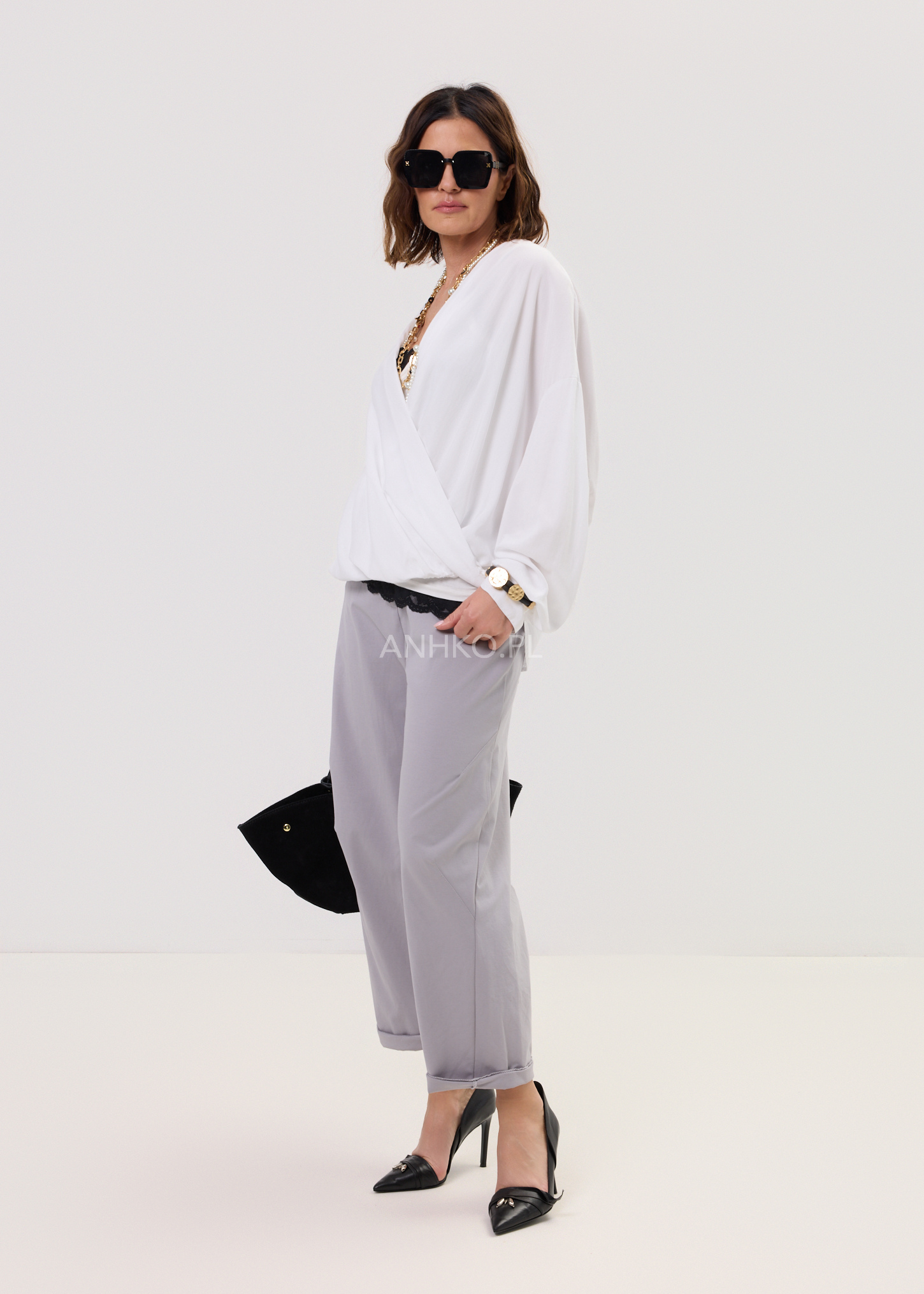 Bluzka Elira Wrap Biała - Luźna bluzka o kopertowym dekolcie w kolorze wina. Lekka, lejąca forma pięknie układa się na sylwetce, zapewniając komfort i swobodę noszenia. Idealna do codziennych stylizacji z nutą kobiecej elegancji.
