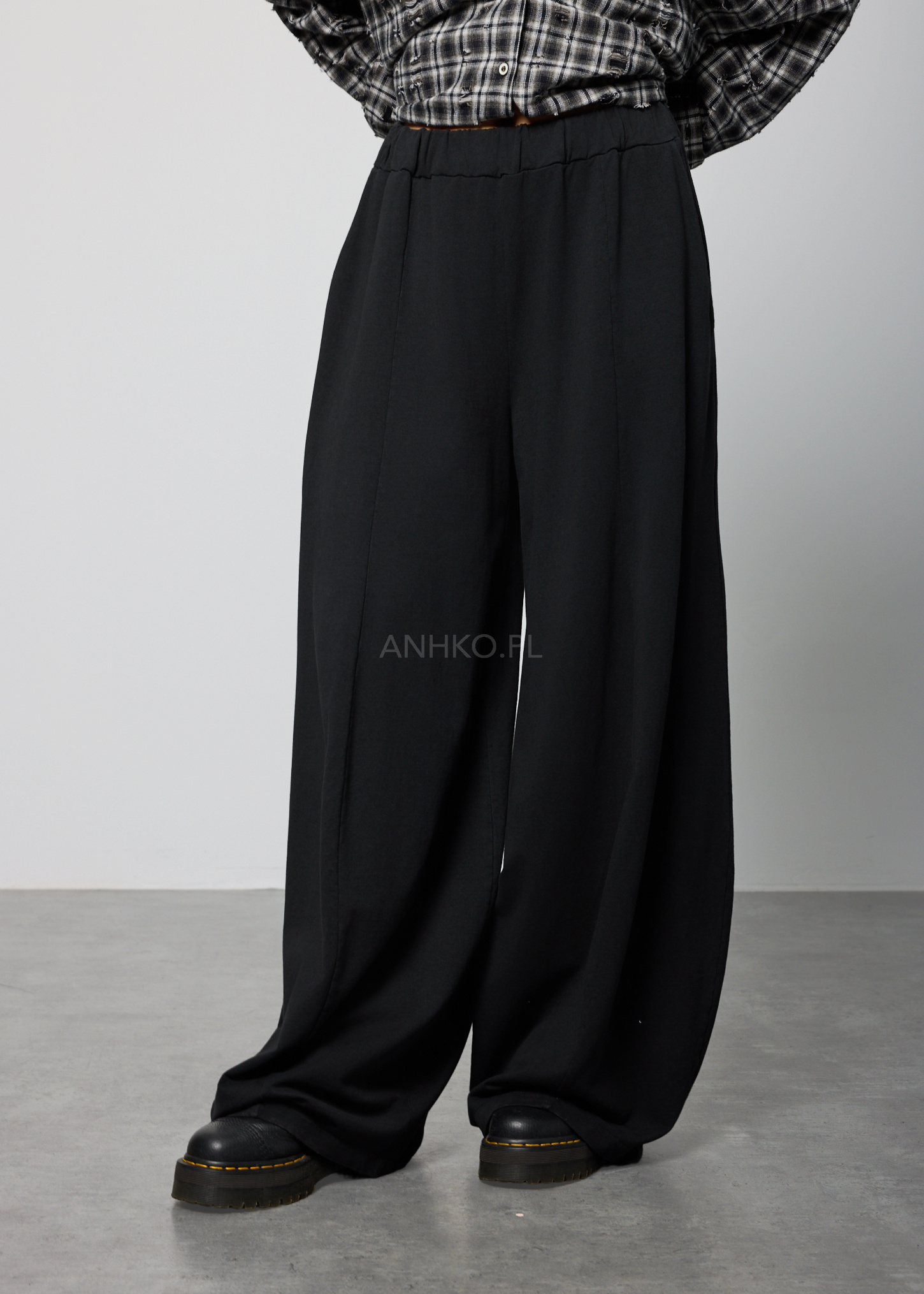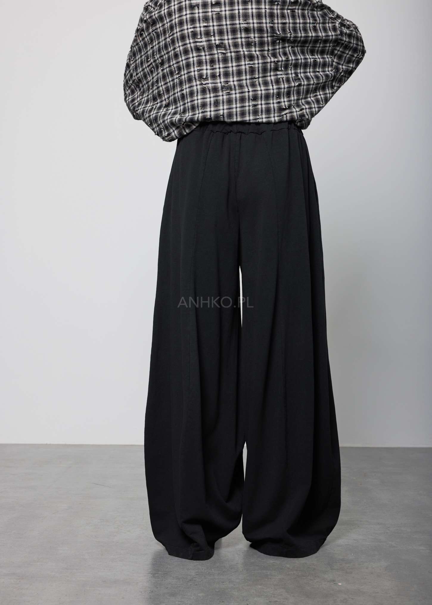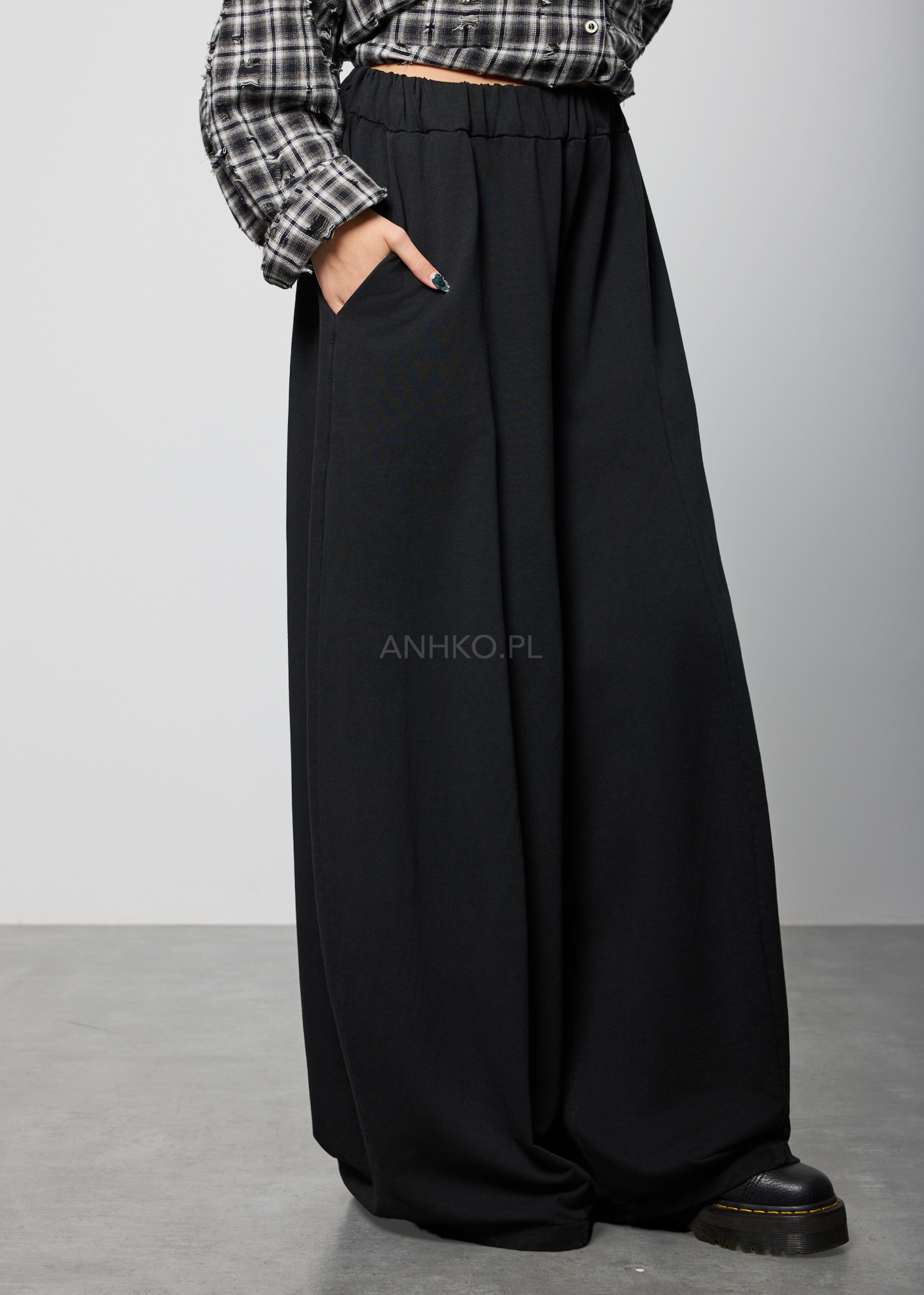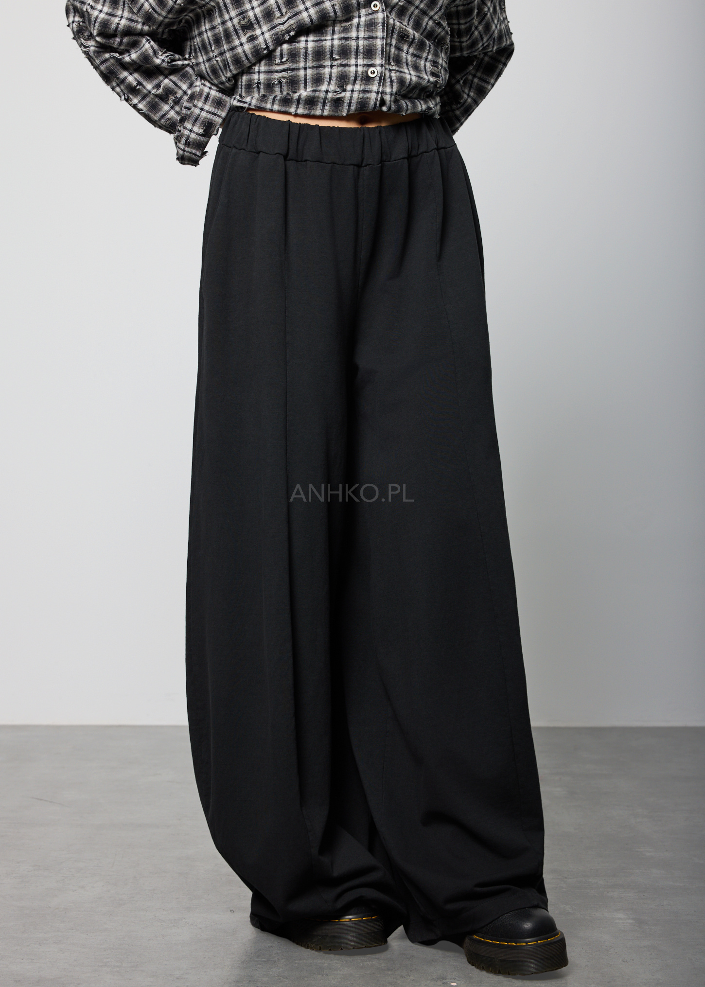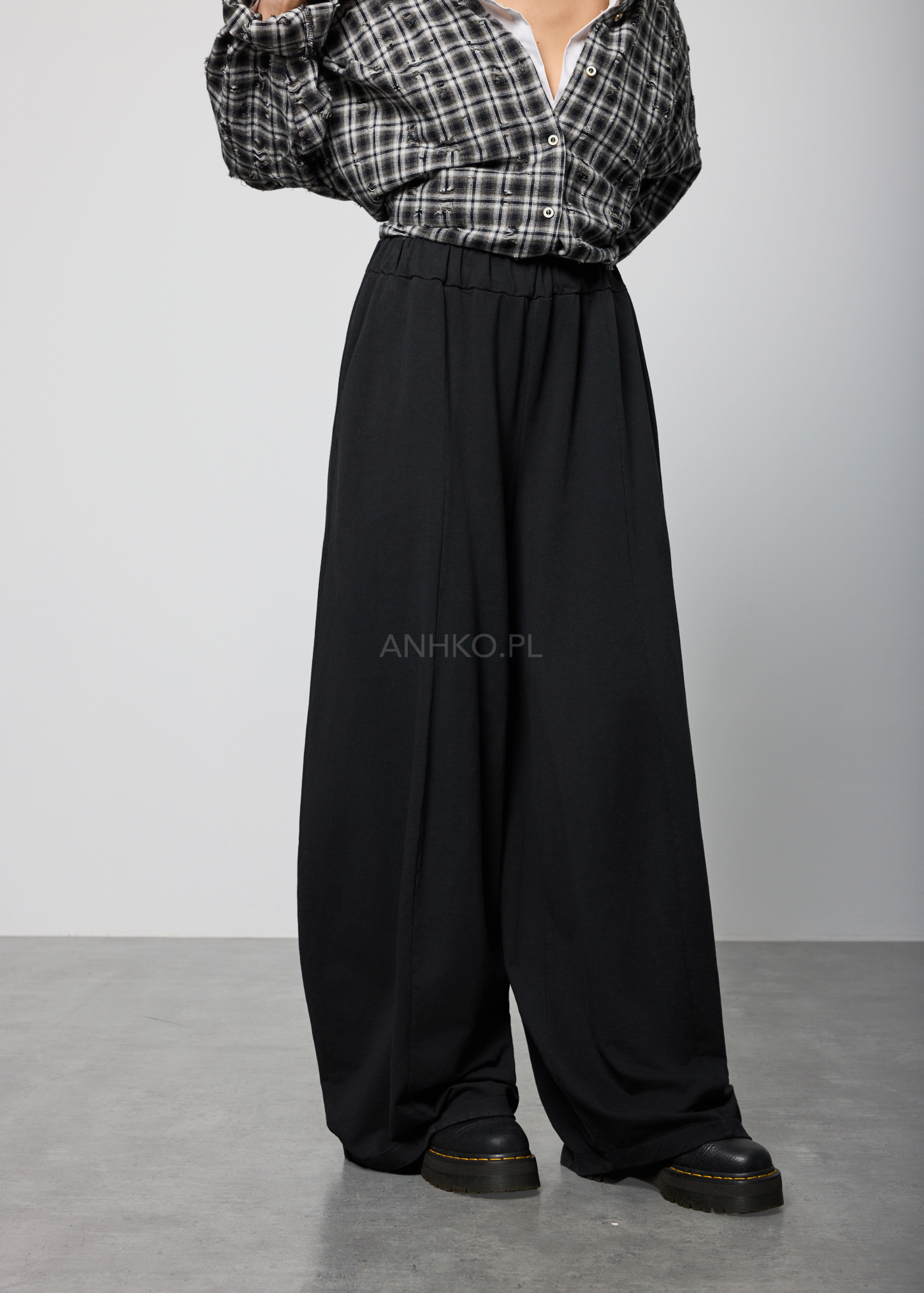 Te spodnie z wysokim stanem charakteryzują się szerokimi nogawkami, które miękko opadają wzdłuż sylwetki, tworząc płynną i wydłużoną linię nóg. Elastyczna talia delikatnie dopasowuje się do figury, zapewniając komfort noszenia bez uczucia ucisku.