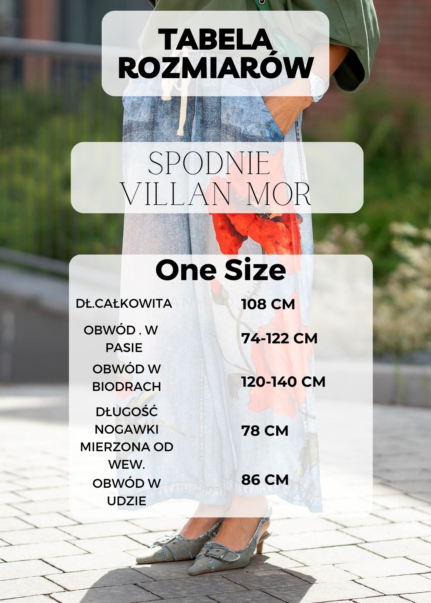 - Fason: Szerokie nogawki optycznie wydłużające sylwetkę.