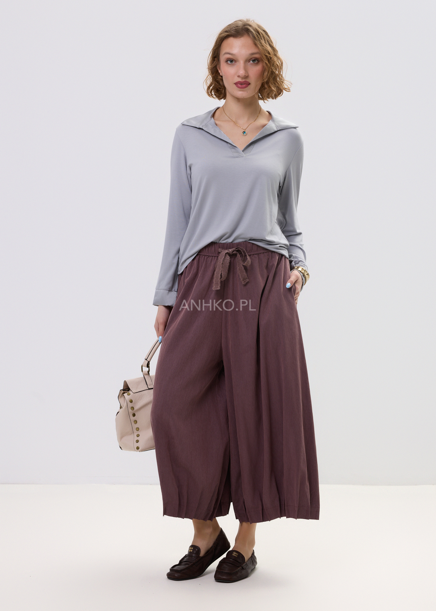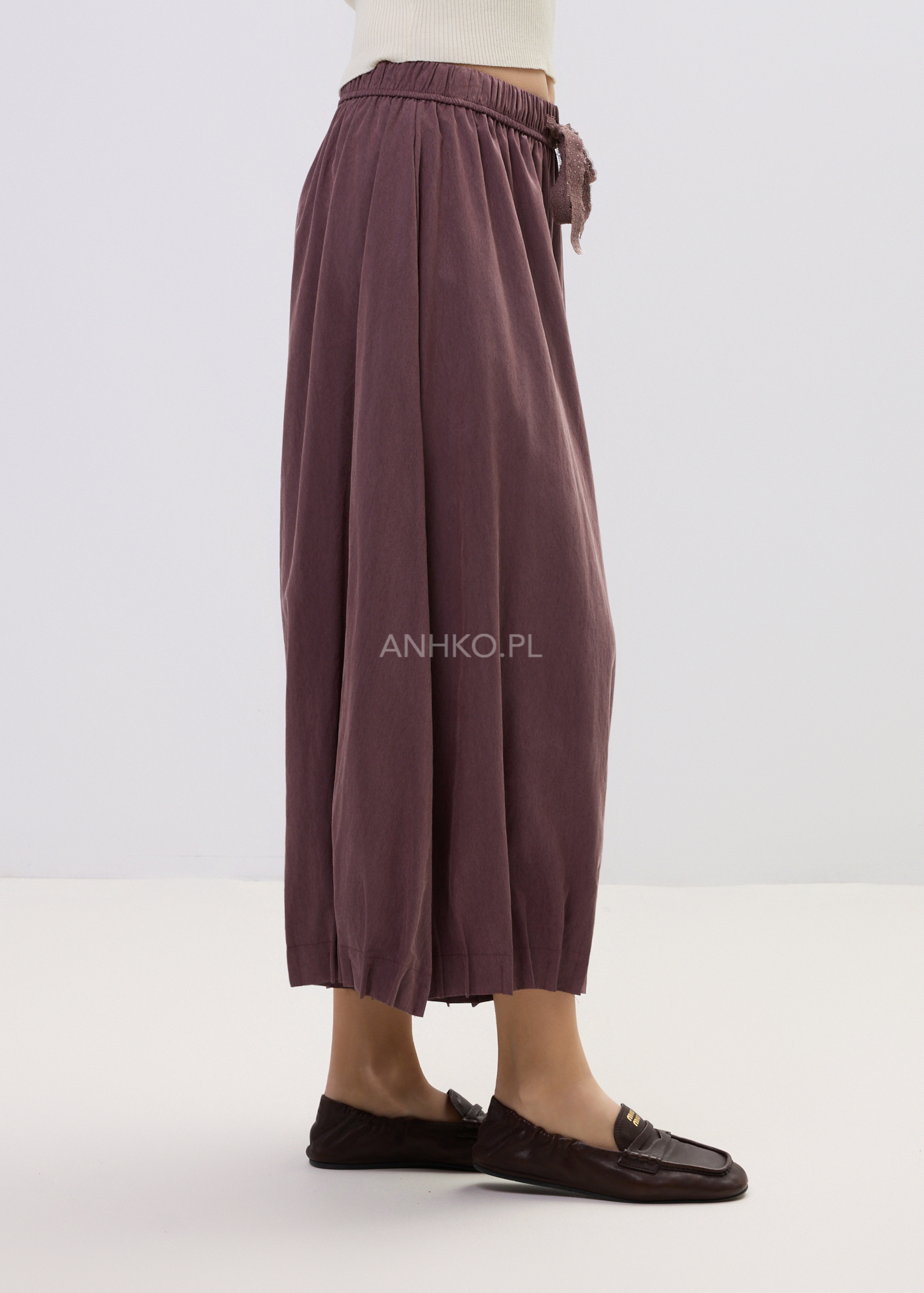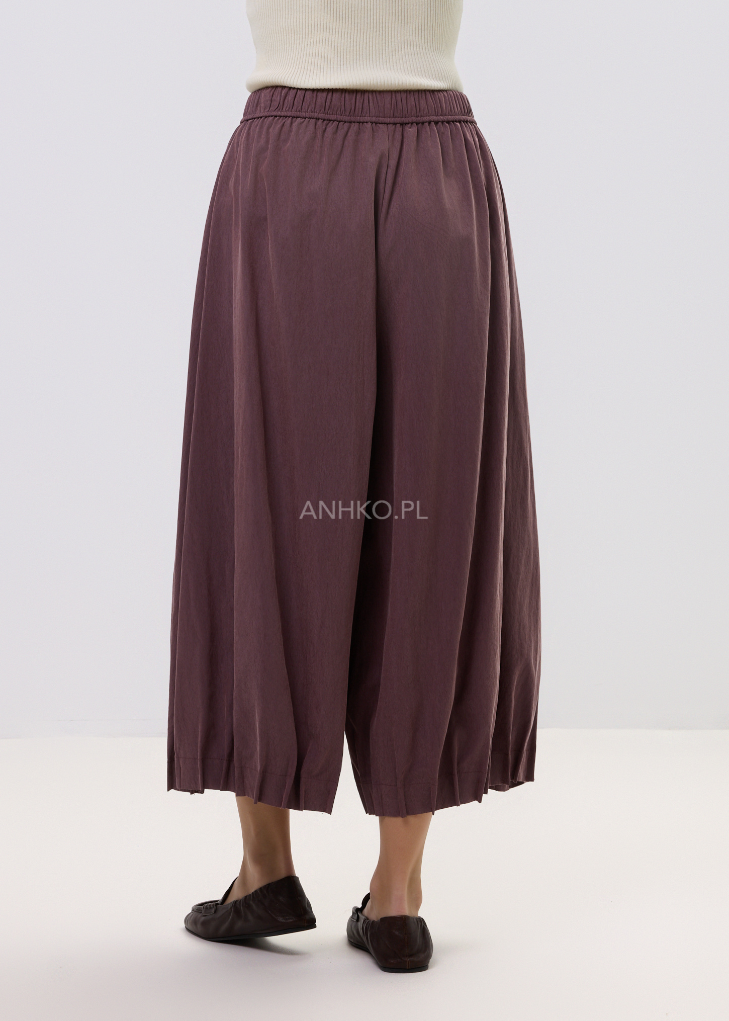 Te spodnie damskie o szerokim kroju łączą komfort noszenia z nowoczesnym wyglądem. Luźny fason sprawia, że podczas ruchu materiał układa się niemal jak spódnica, tworząc efekt lekkiej, płynnej sylwetki. Miękka tkanina pięknie pracuje w ruchu, a głęboki winny odcień dodaje stylizacji charakteru i elegancji.