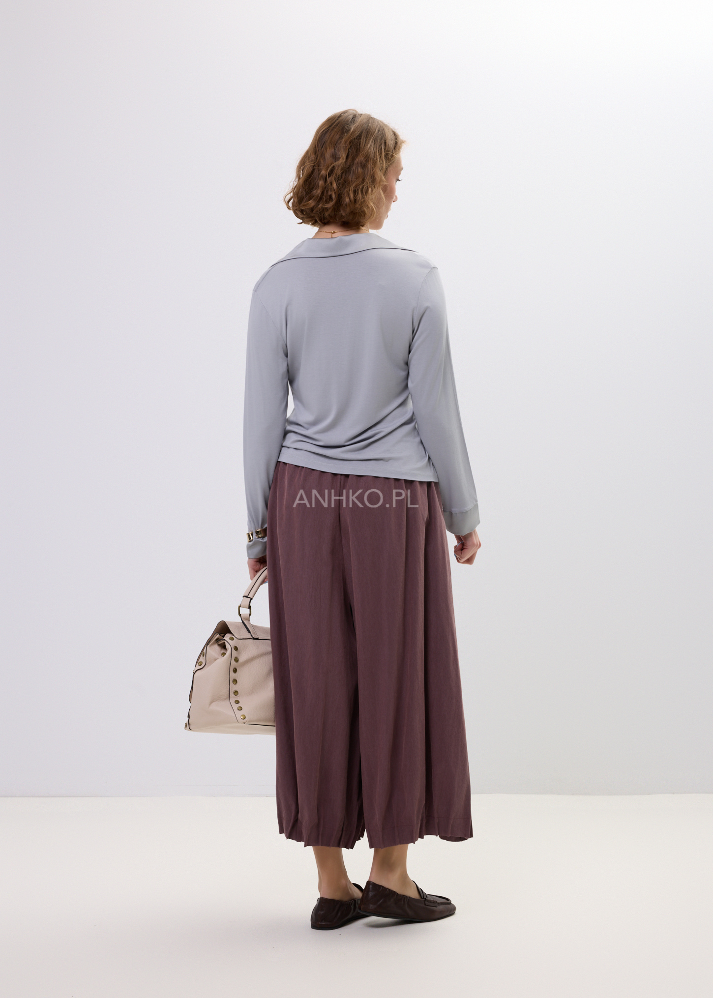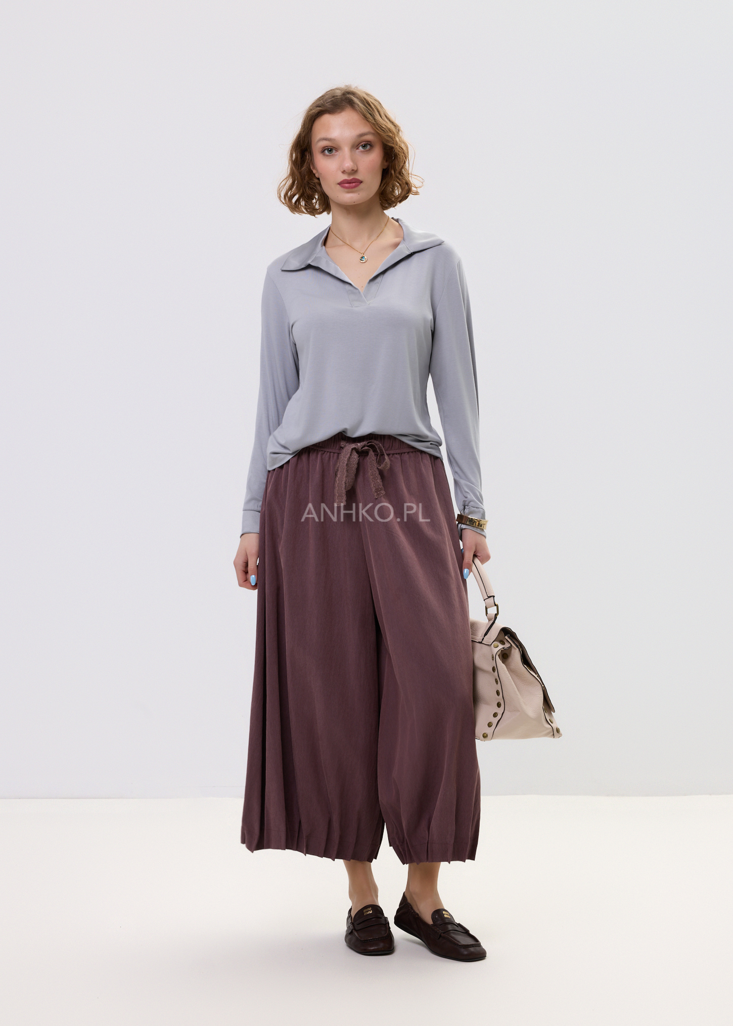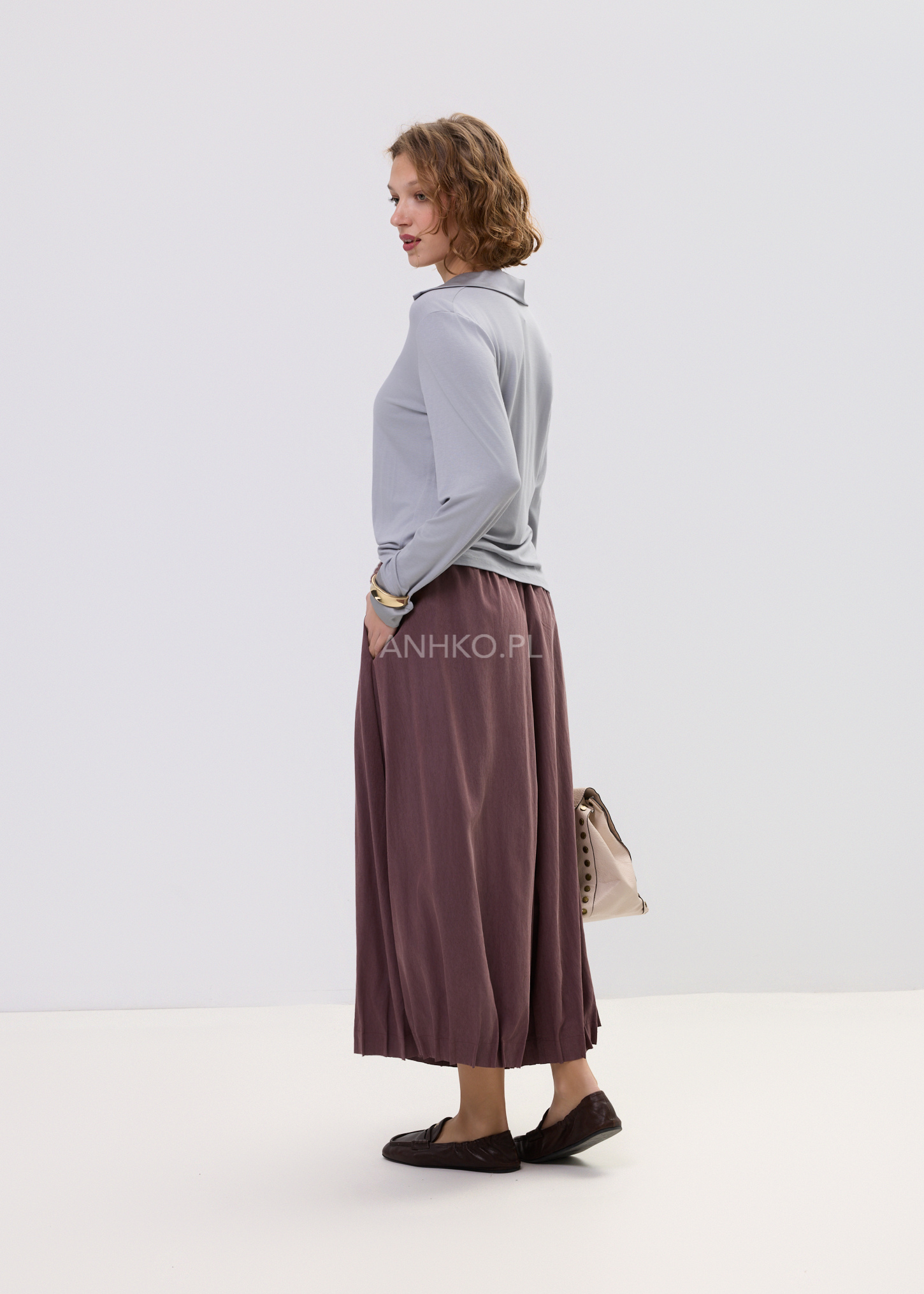 Te spodnie damskie o szerokim kroju łączą komfort noszenia z nowoczesnym wyglądem. Luźny fason sprawia, że podczas ruchu materiał układa się niemal jak spódnica, tworząc efekt lekkiej, płynnej sylwetki. Miękka tkanina pięknie pracuje w ruchu, a głęboki winny odcień dodaje stylizacji charakteru i elegancji.