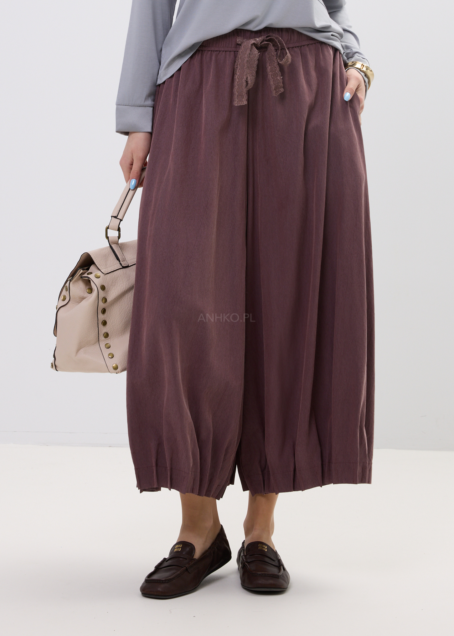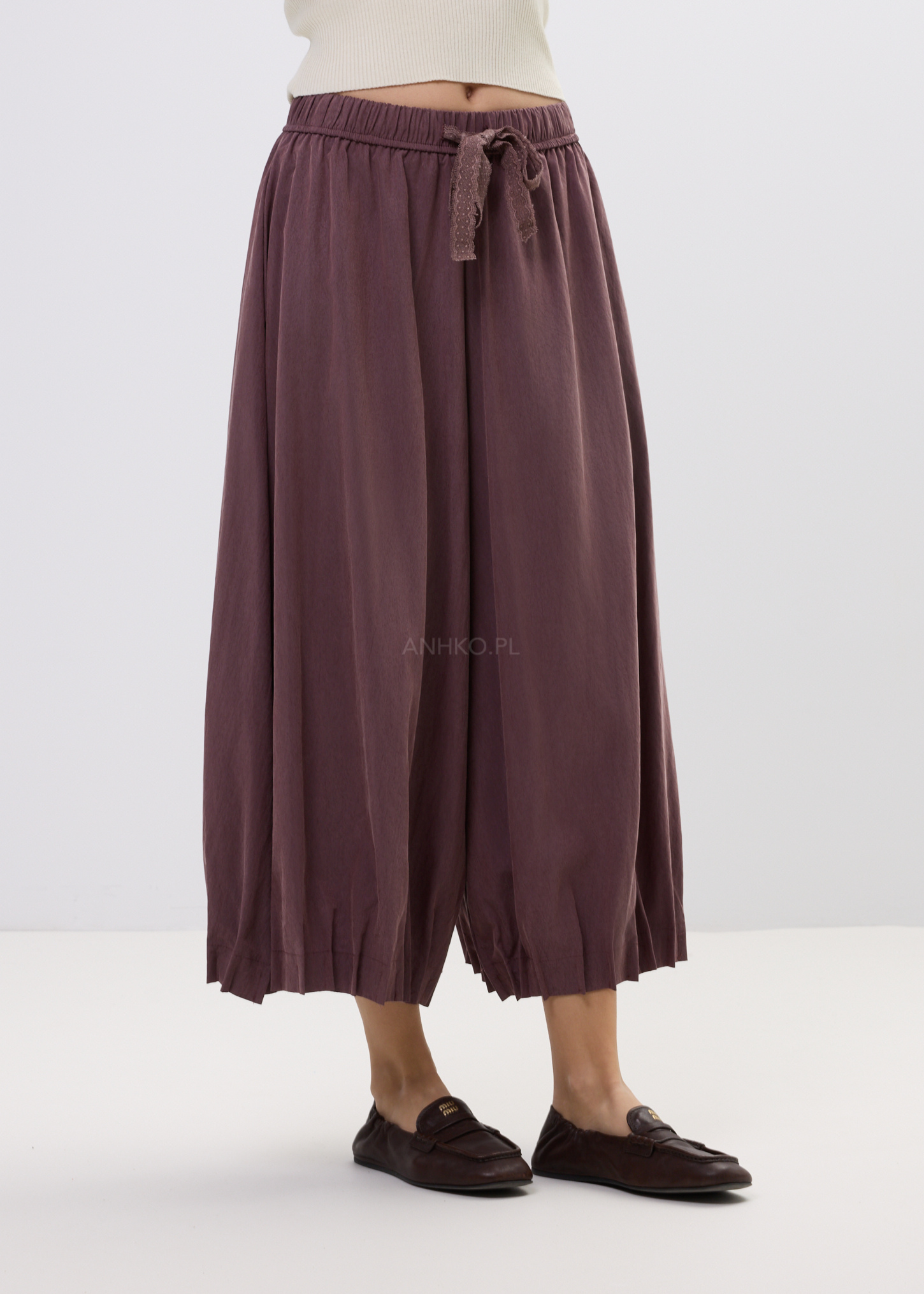 Model posiada elastyczny pas dopasowujący się do sylwetki oraz ozdobne wiązanie z koronki, które subtelnie podkreśla talię. Szerokie nogawki w stylu kulotów zakończone lekko balonowym dołem nadają całości modowego charakteru, a kieszenie po bokach zwiększają funkcjonalność. To model, który świetnie sprawdzi się zarówno w minimalistycznych stylizacjach, jak i bardziej wyrazistych zestawach.