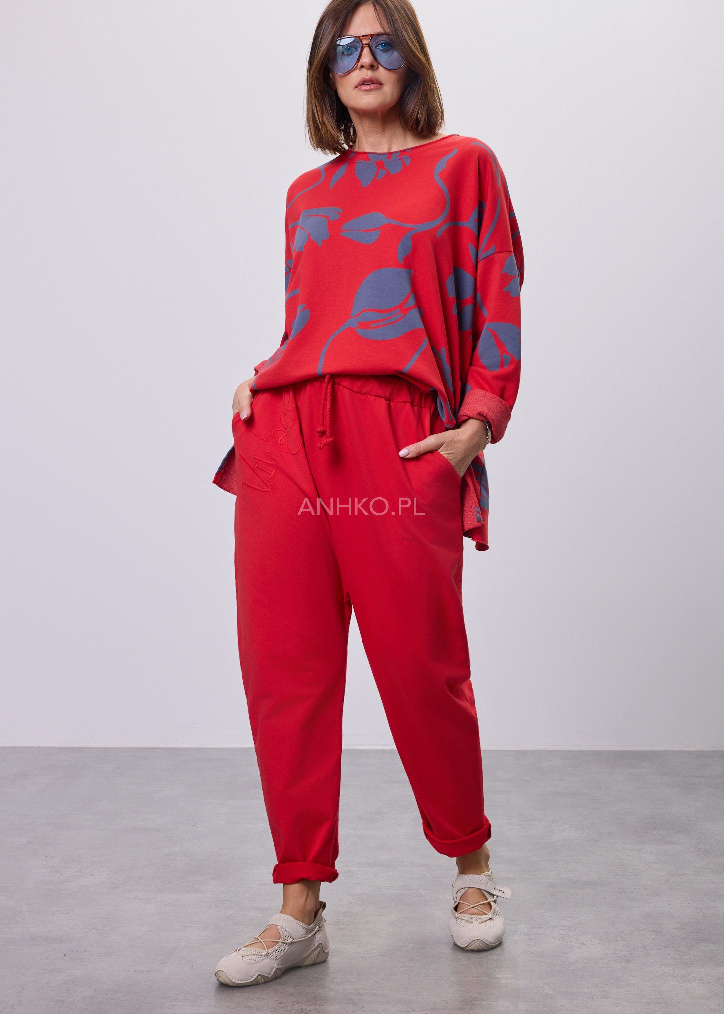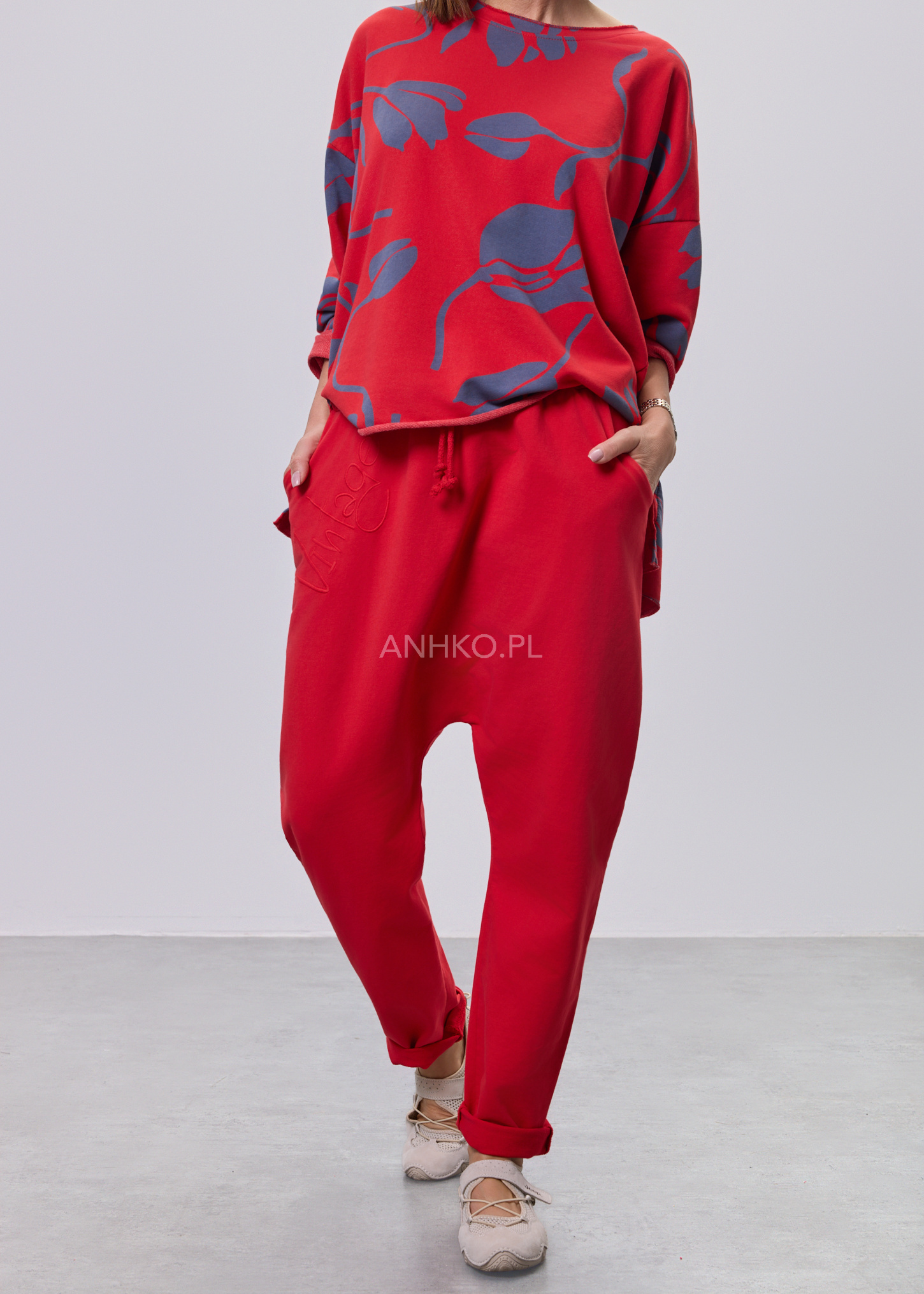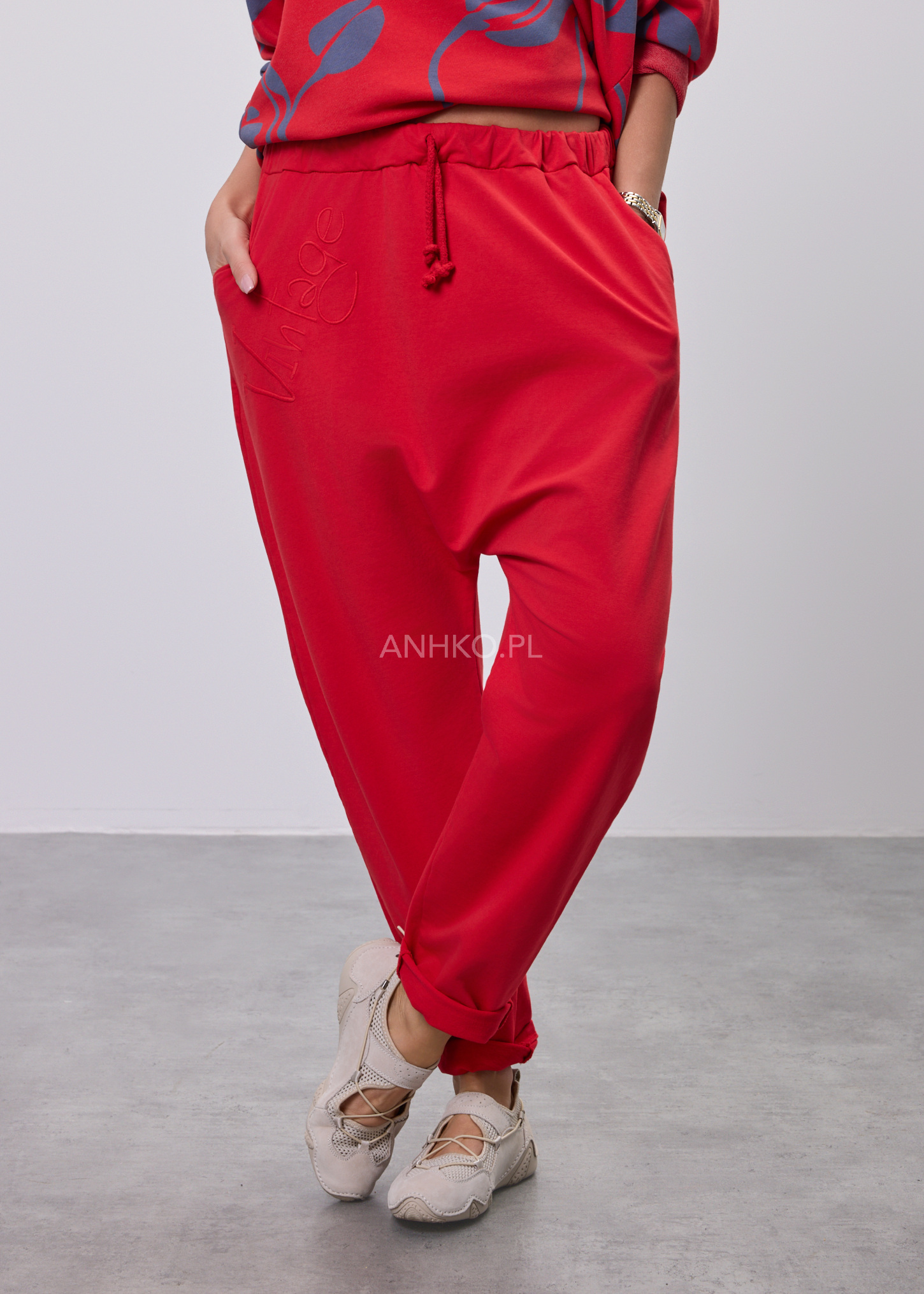 Intensywny czerwony kolor przyciąga uwagę i nadaje stylizacji energii, a zwężane nogawki balansują proporcje sylwetki. Regulowane wiązanie, praktyczne kieszenie i lekko oversize’owy fason sprawiają, że spodnie są nie tylko stylowe, ale też funkcjonalne. Idealne do zestawów z bluzką, t-shirtem lub oversize’ową górą.