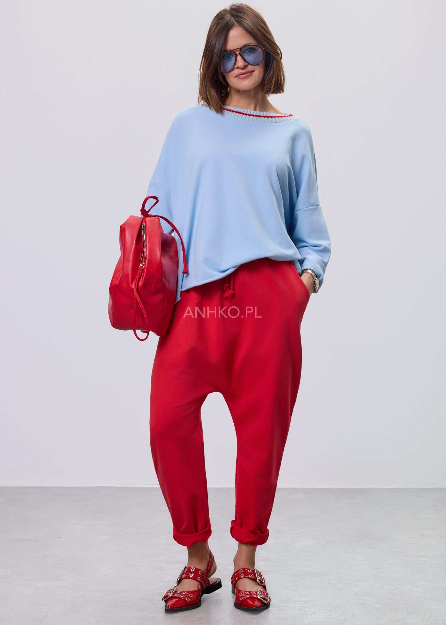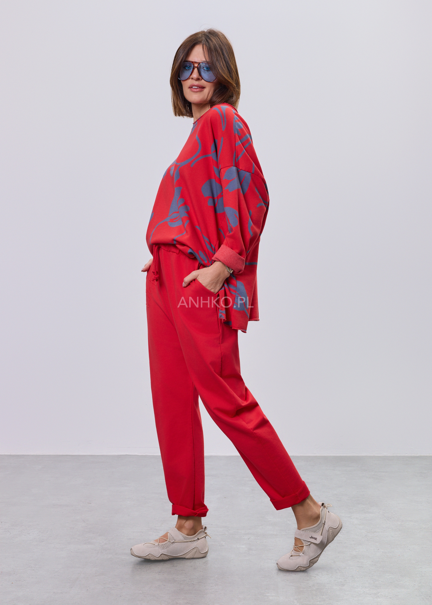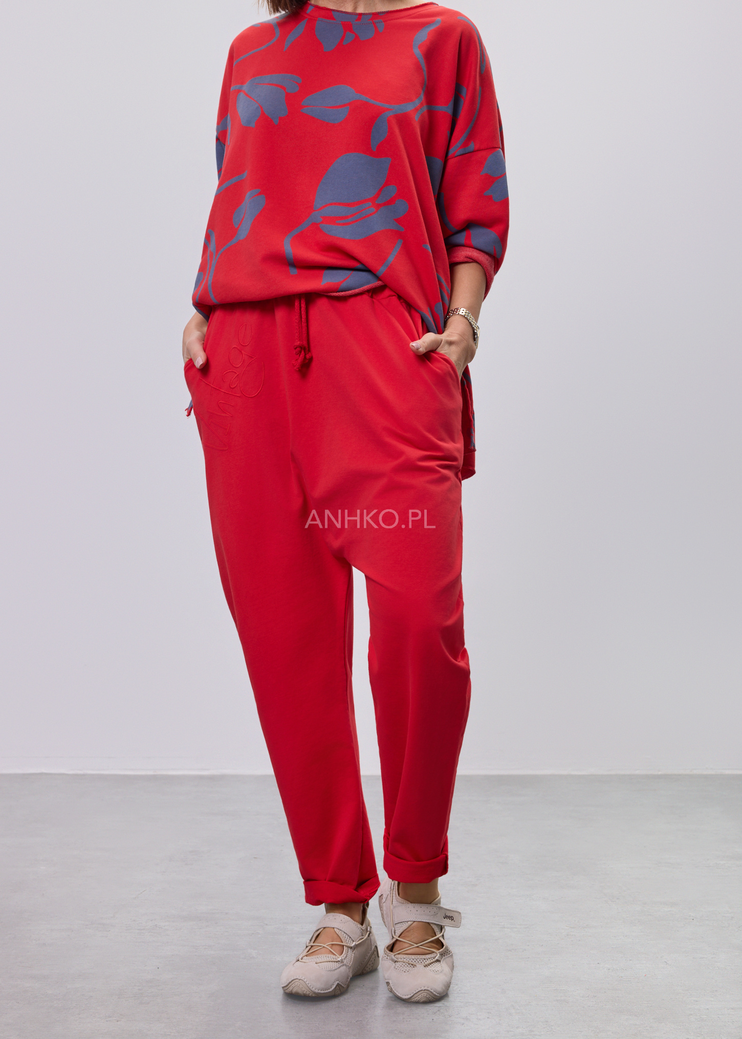 Intensywny czerwony kolor przyciąga uwagę i nadaje stylizacji energii, a zwężane nogawki balansują proporcje sylwetki. Regulowane wiązanie, praktyczne kieszenie i lekko oversize’owy fason sprawiają, że spodnie są nie tylko stylowe, ale też funkcjonalne. Idealne do zestawów z bluzką, t-shirtem lub oversize’ową górą.