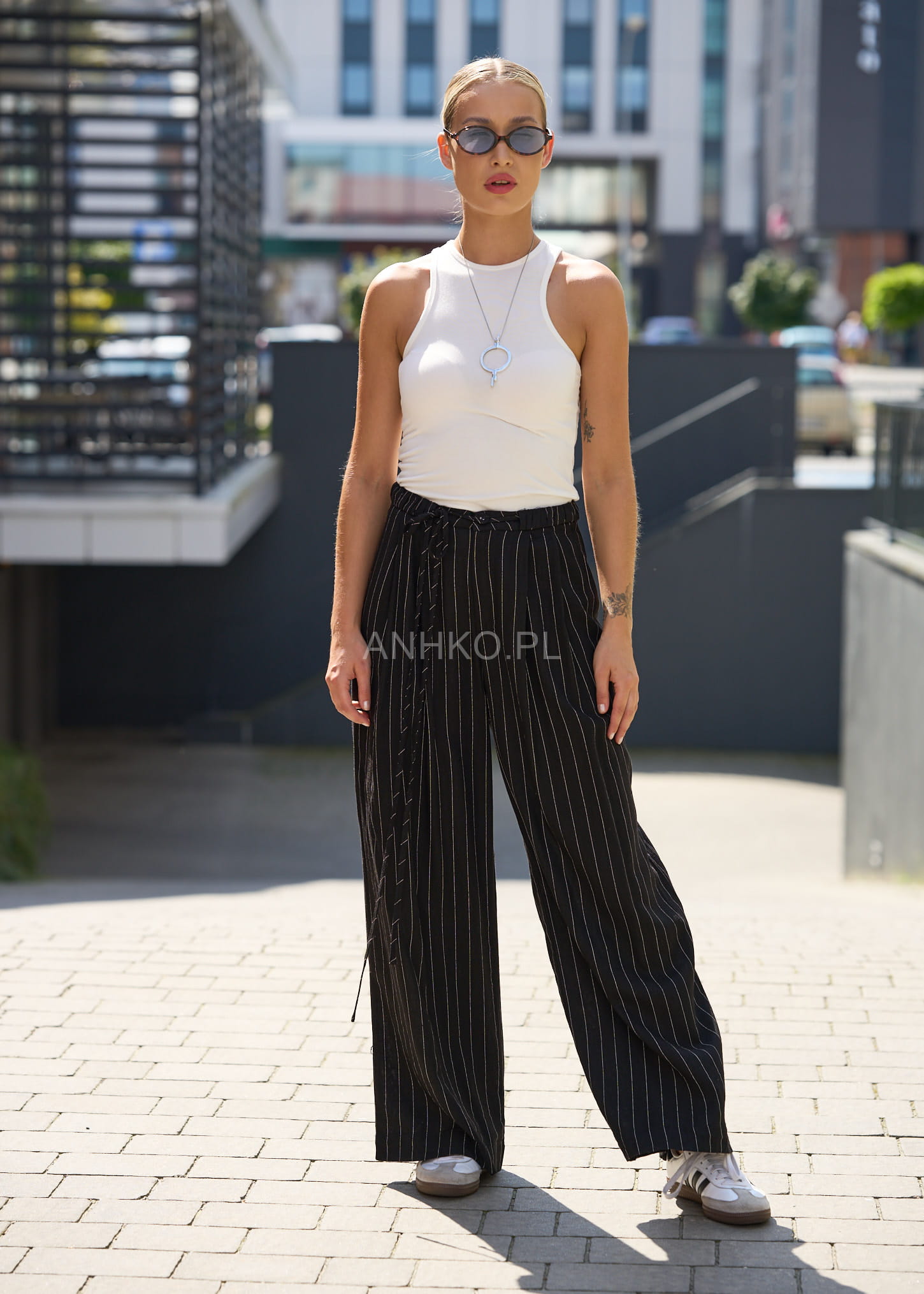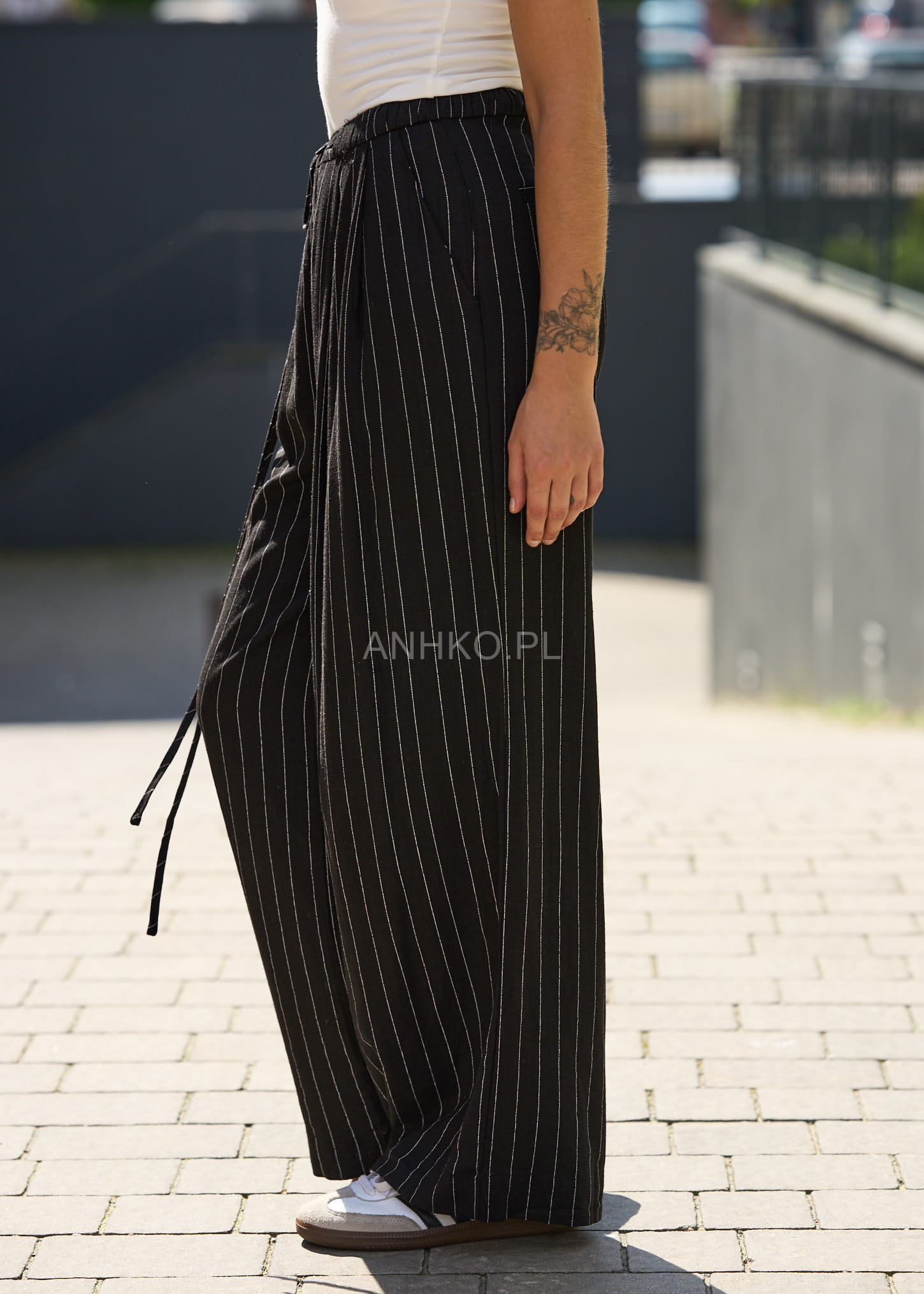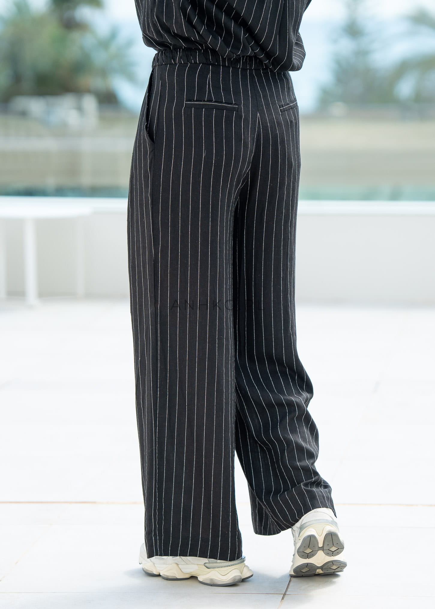 To stylowe spodnie o luźnym kroju, które doskonale sprawdzą się w każdej garderobie. Wykonane z lekkiego, przewiewnego materiału z domieszką lnu, zapewniają komfort przez cały dzień – niezależnie od pogody. Subtelny wzór w prążki nadaje im ponadczasowego szyku, dzięki czemu świetnie pasują zarówno do eleganckiej koszuli, jak i luźnego T-shirtu. Idealne do biura, na spotkania, a także casualowe wyjścia. Spodnie posiadają kieszenie boczne oraz imitacje kieszeni z tyłu, co dodaje im klasy. Elastyczny pas z guzikiem gwarantuje wygodne dopasowanie.