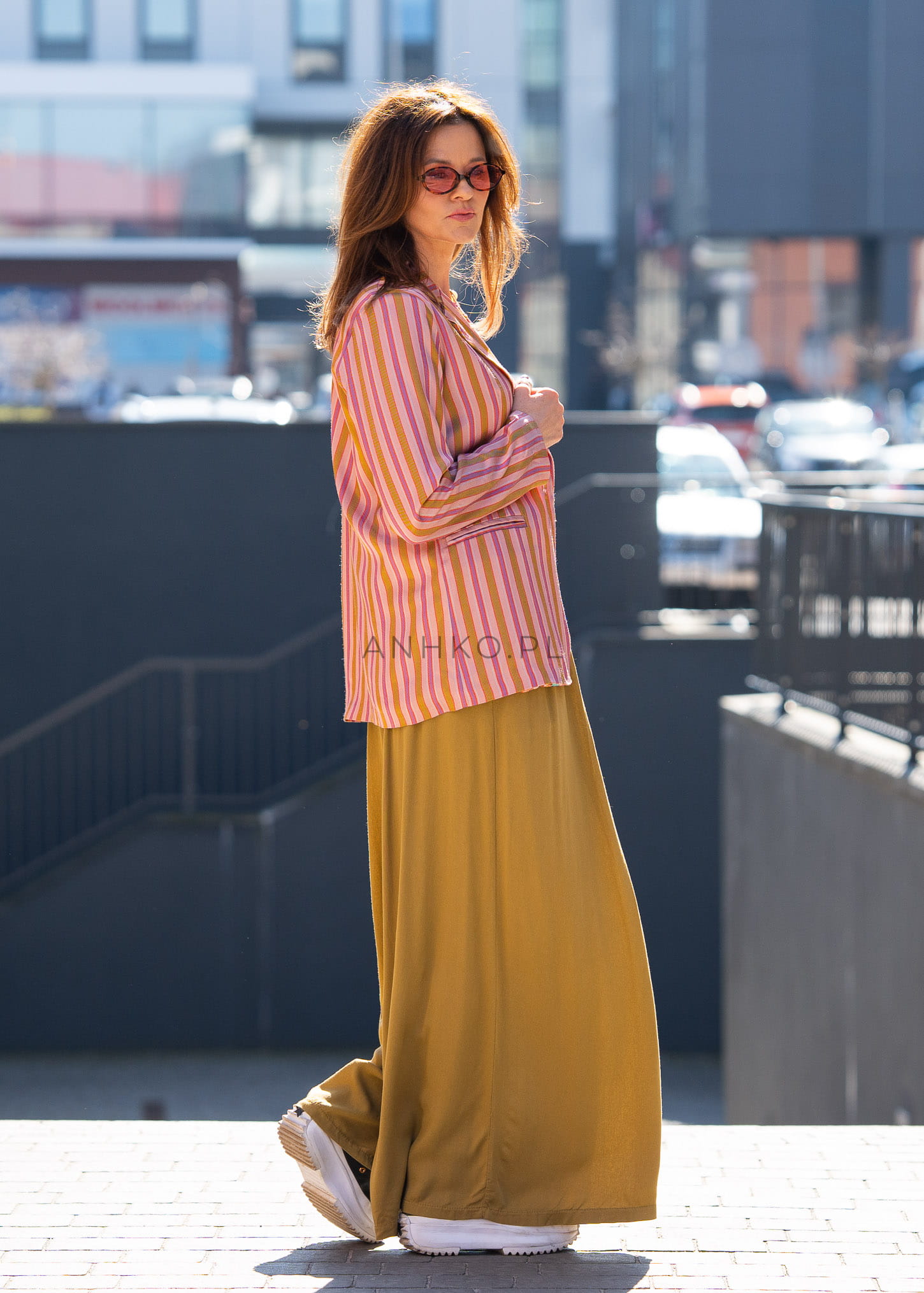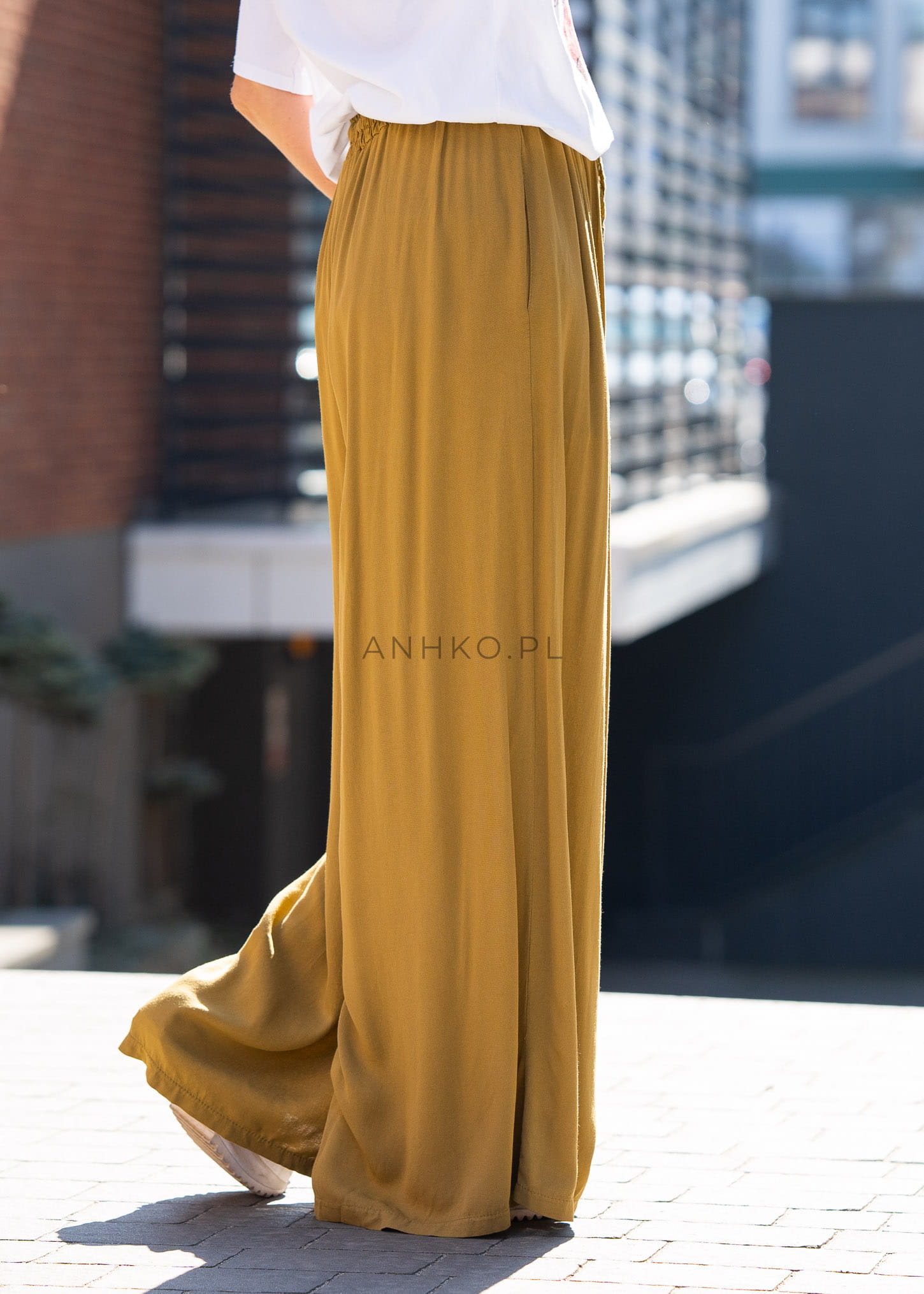 Te spodnie z szeroką nogawką w odcieniu musztardowym przyciągają uwagę już od pierwszego spojrzenia. Lejąca tkanina miękko układa się na sylwetce, tworząc efekt płynnego ruchu przy każdym kroku. Szeroki fason oversize zapewnia swobodę i komfort, a subtelne marszczenia w pasie nadają całości lekkości i modowego charakteru.