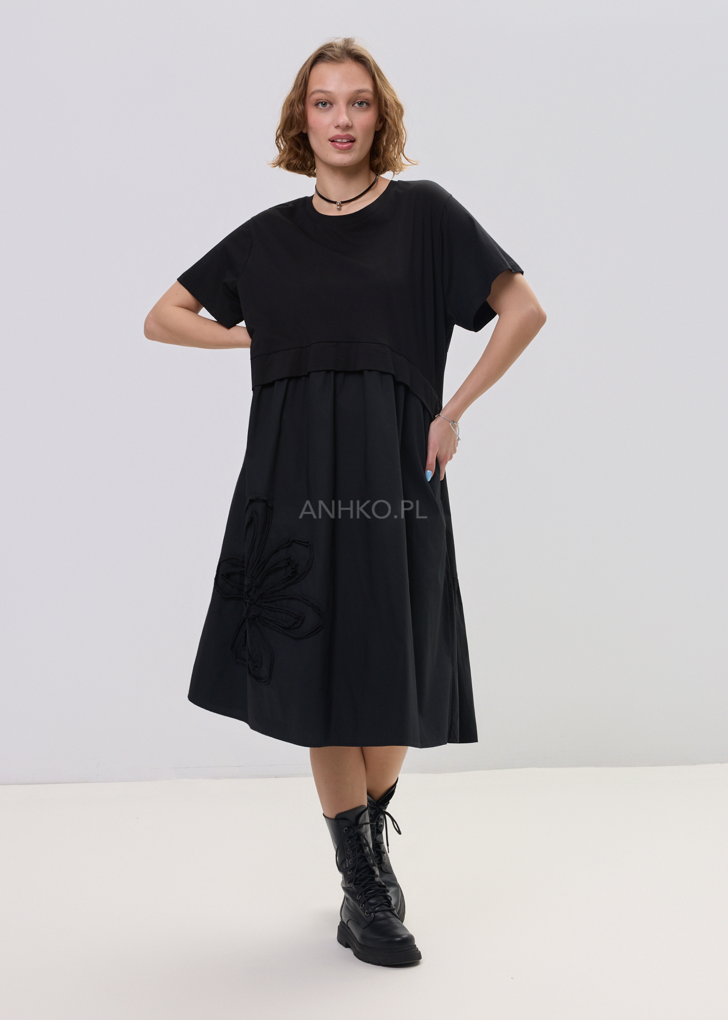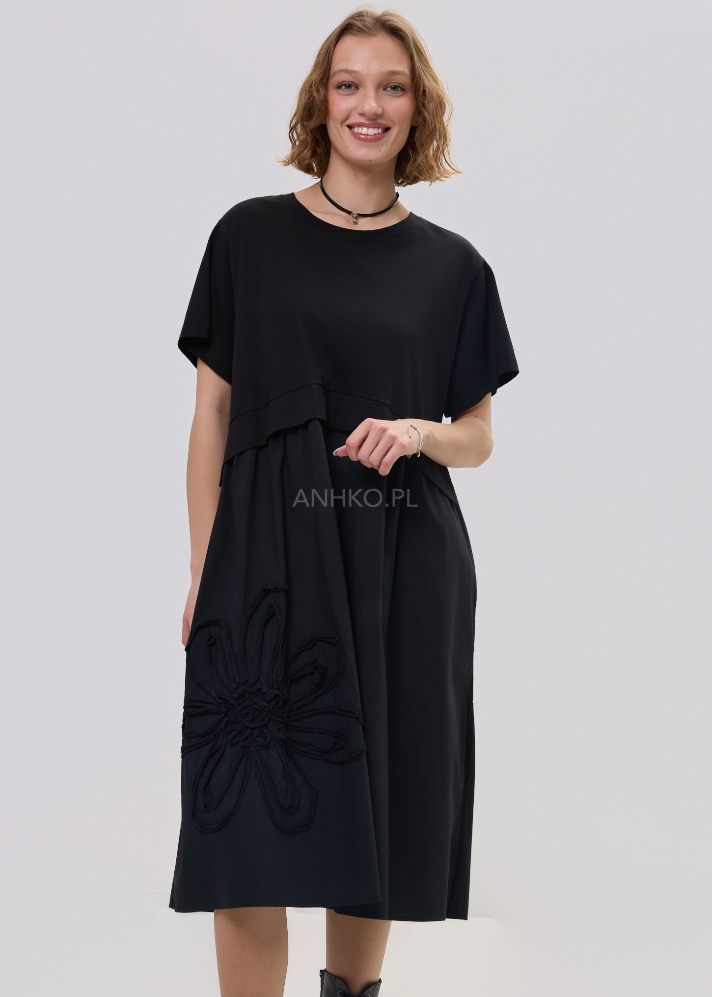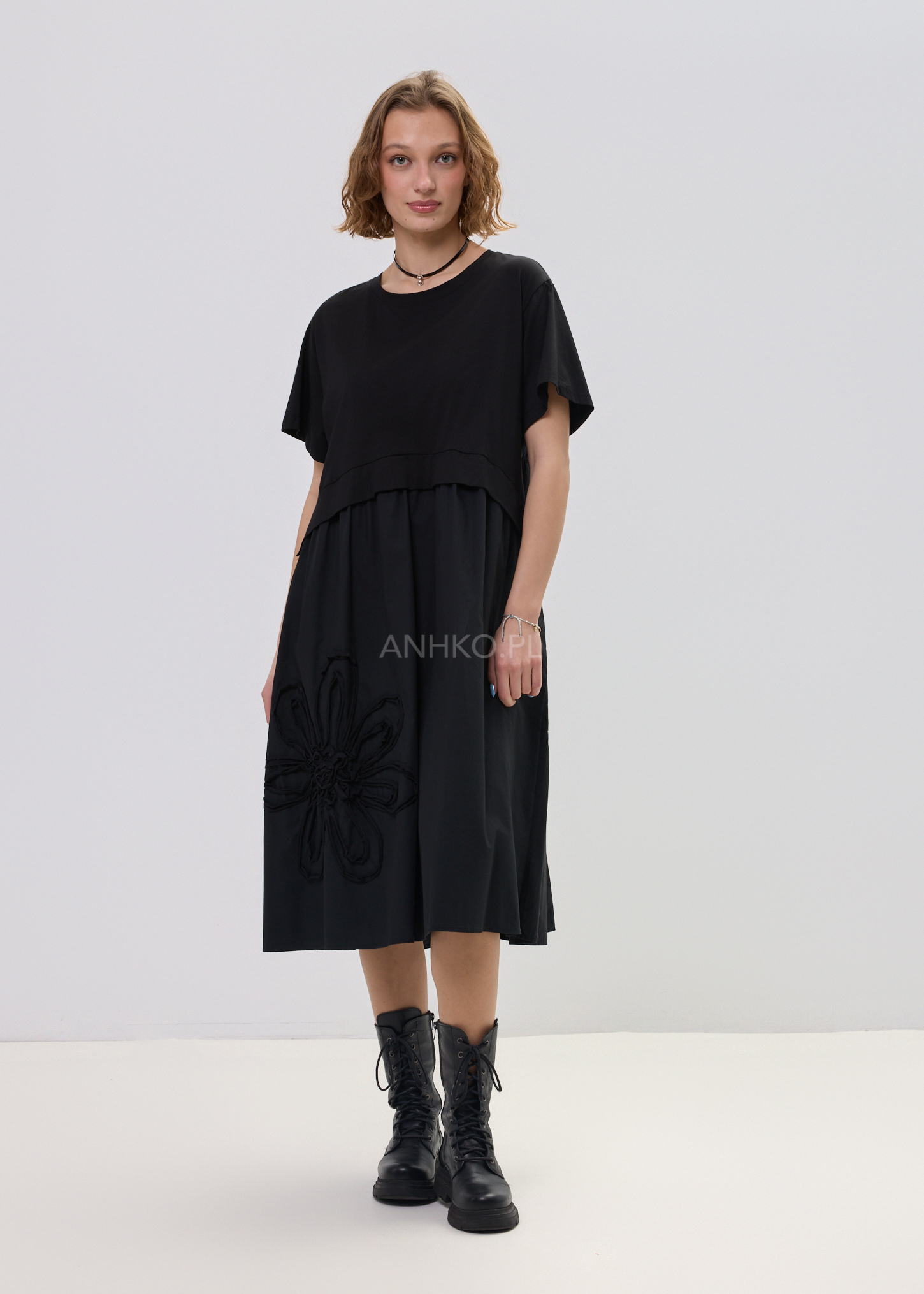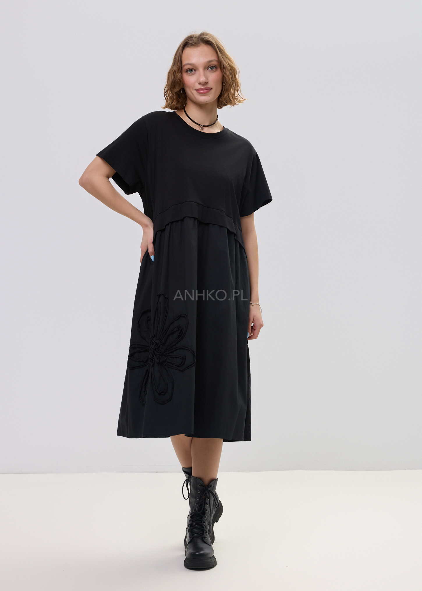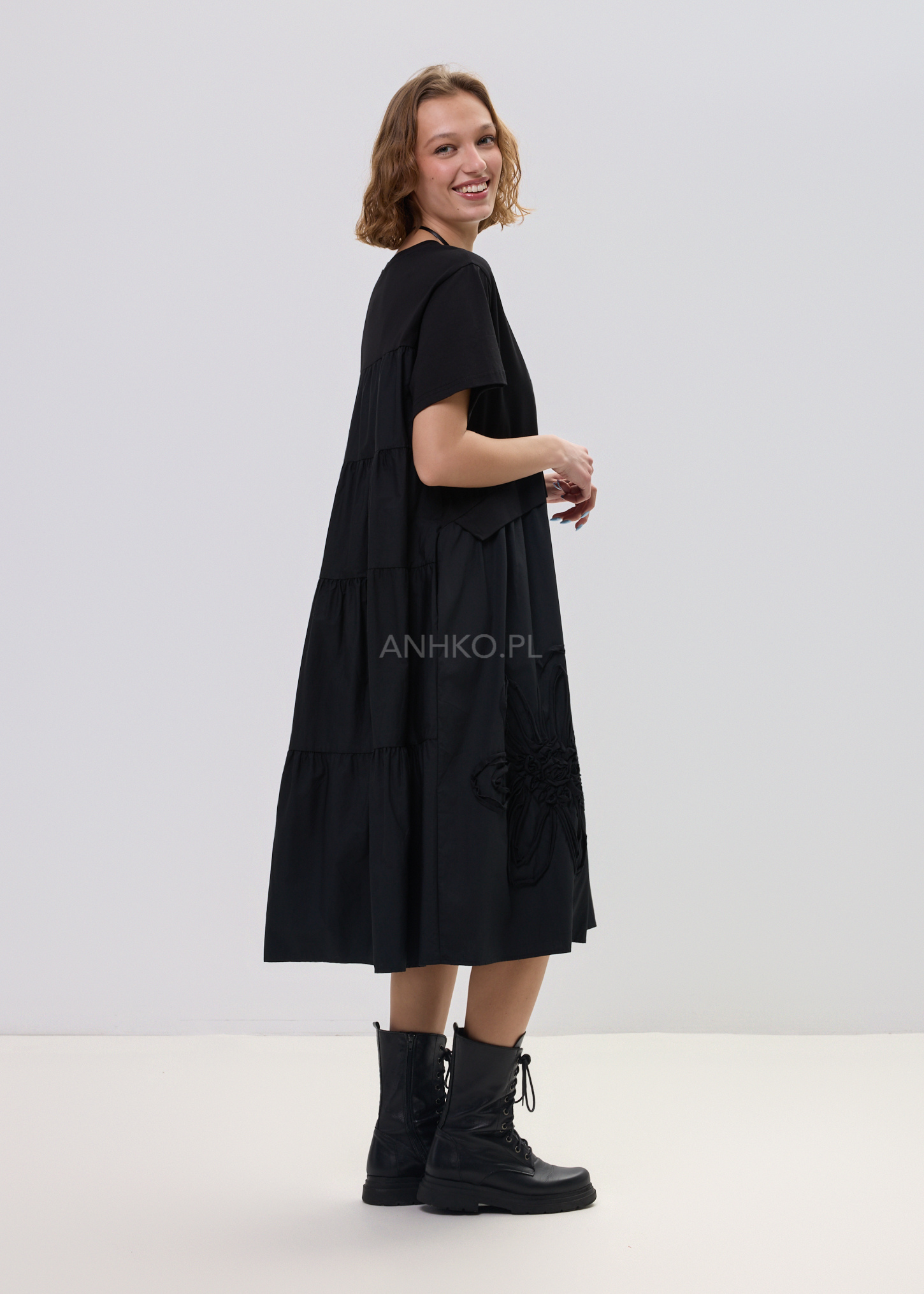 Największym wyróżnikiem jest aplikacja kwiatu 3D, która przyciąga spojrzenia i nadaje całości artystycznego wyrazu. To model, który bez wysiłku buduje stylizację – wystarczy dodać sneakersy lub cięższe buty, aby uzyskać zupełnie różne efekty. Świetnie sprawdzi się zarówno w miejskich zestawach, jak i bardziej wyrazistych lookach.