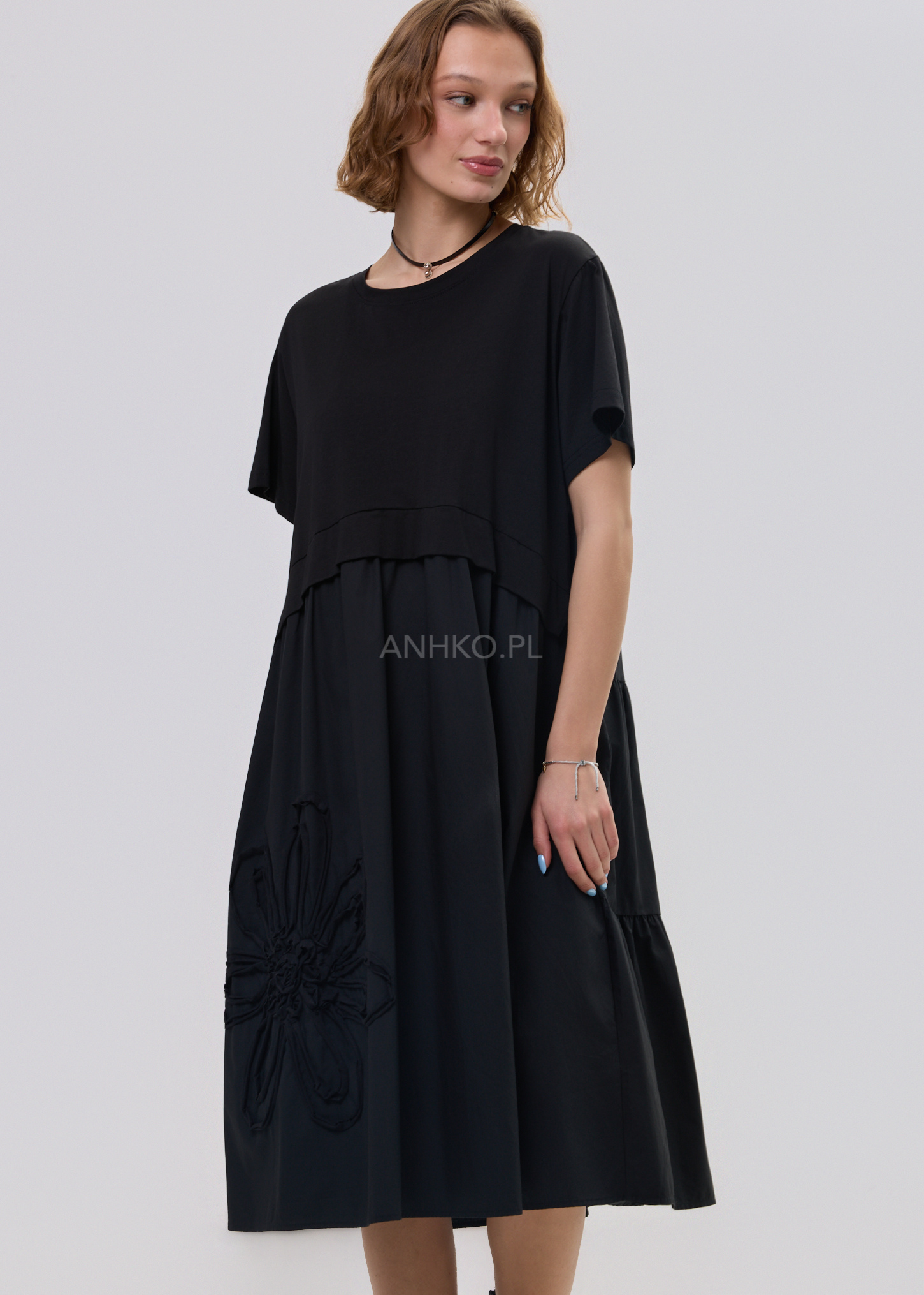Ta sukienka maxi o luźnym, oversize’owym kroju miękko opływa sylwetkę, zapewniając pełną swobodę ruchu i naturalny efekt układania się materiału. Góra w stylu basic równoważy rozkloszowany dół, który delikatnie pracuje przy każdym kroku, tworząc lekkość i płynność formy. Okrągły dekolt oraz krótki rękaw nadają całości uniwersalnego charakteru, idealnego do codziennych stylizacji.