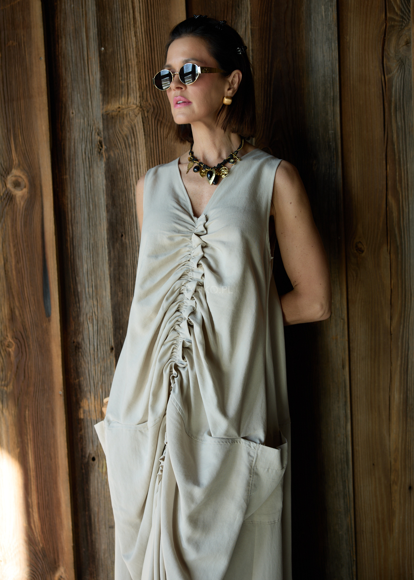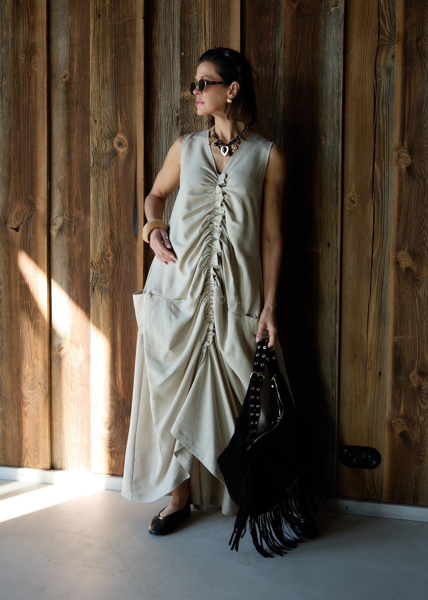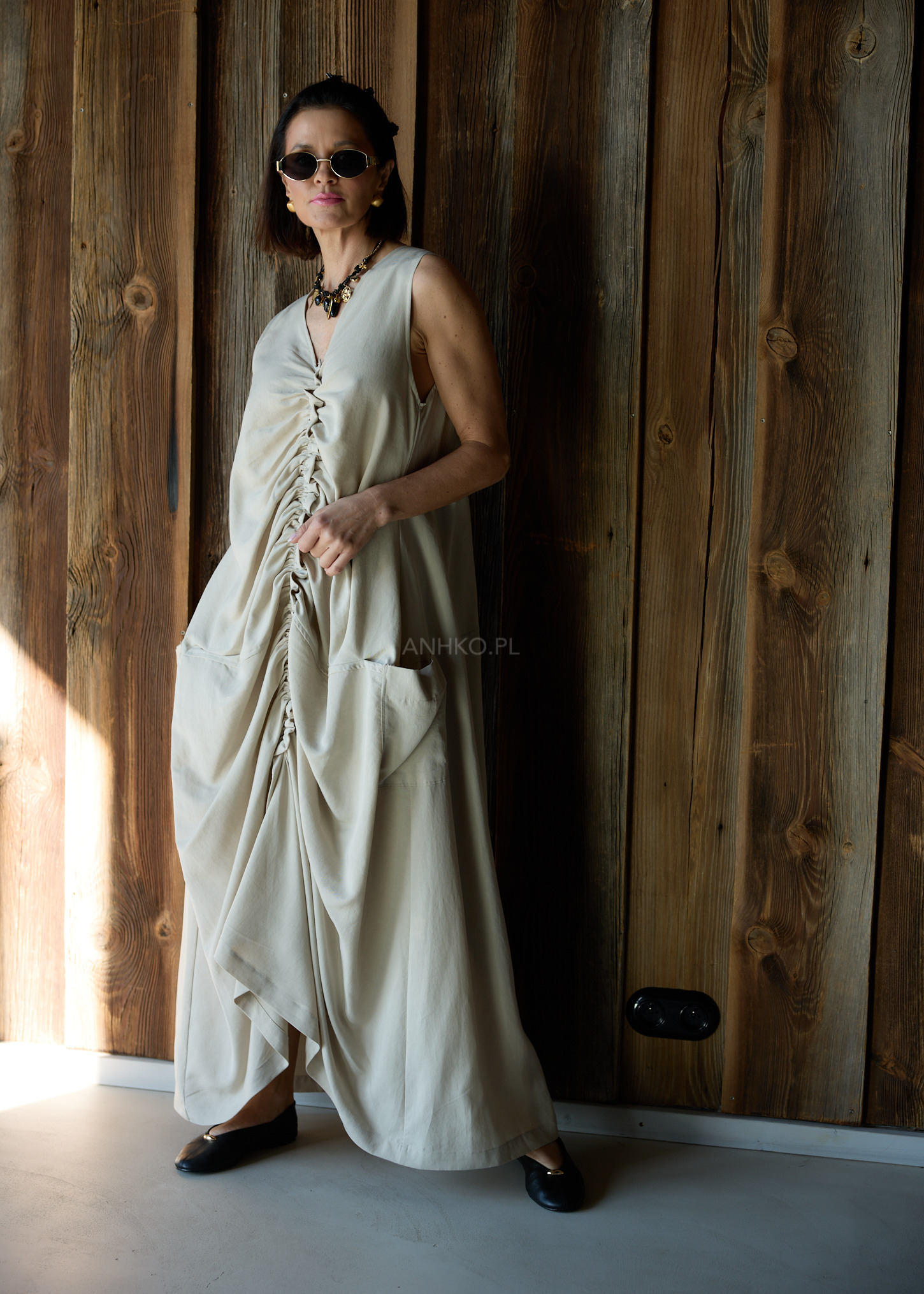 Ta sukienka maxi wyróżnia się nowoczesnym fasonem, który swobodnie układa się na sylwetce i tworzy efekt lekkiej, płynnej linii podczas ruchu. Luźny krój oversize zapewnia komfort noszenia, a centralne marszczenie biegnące przez całą długość przodu nadaje modelowi rzeźbiarskiego charakteru i przyciąga uwagę.