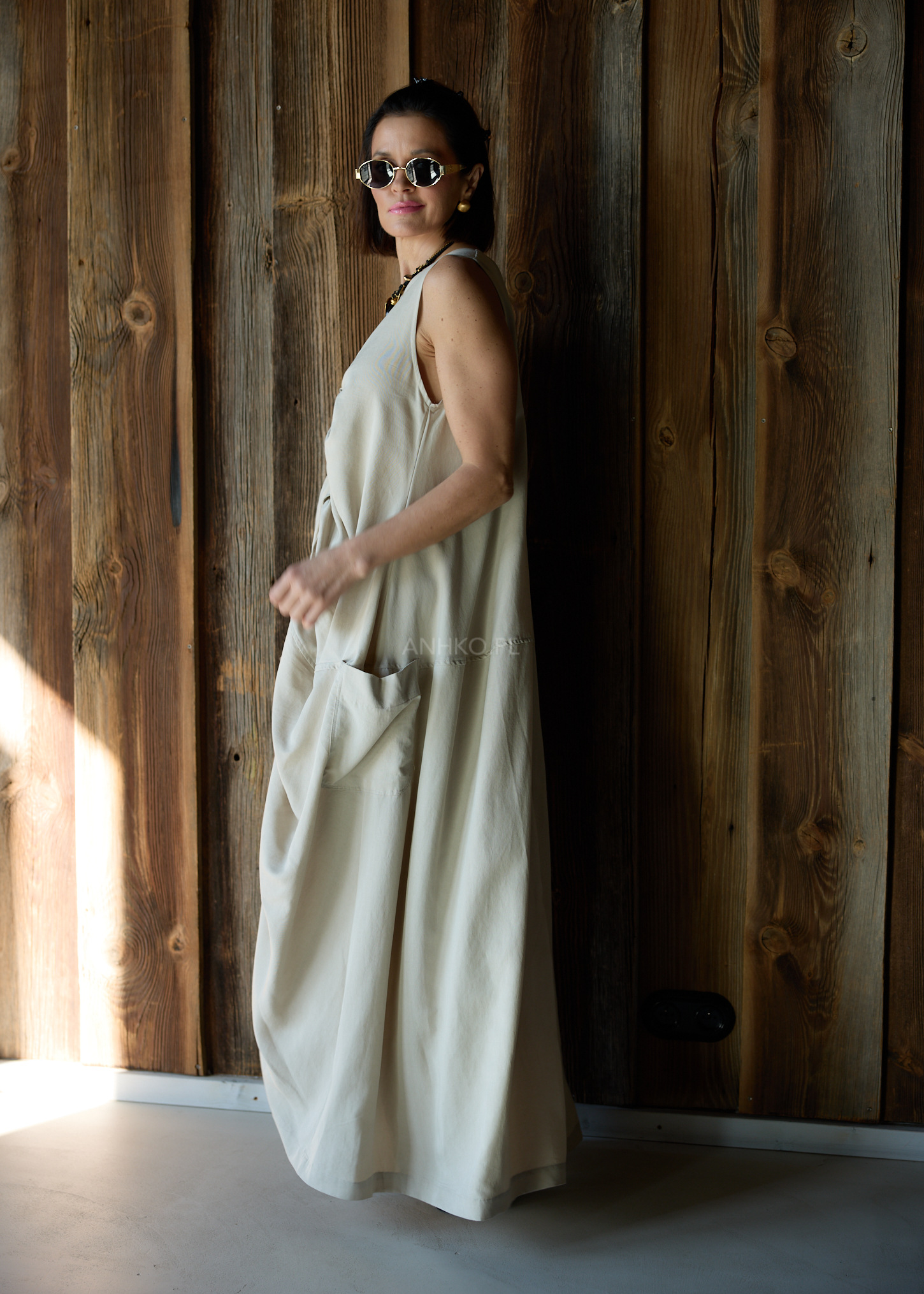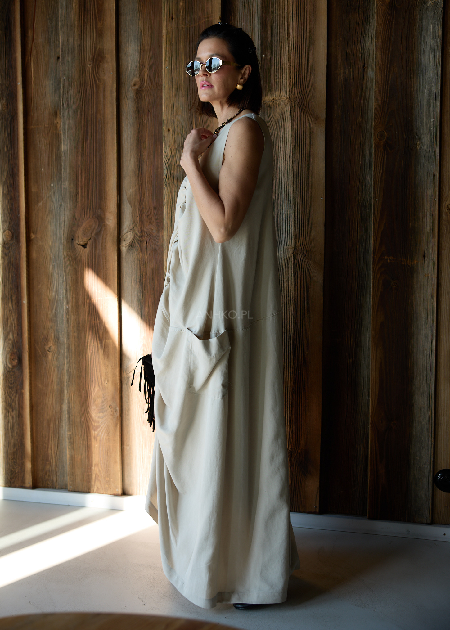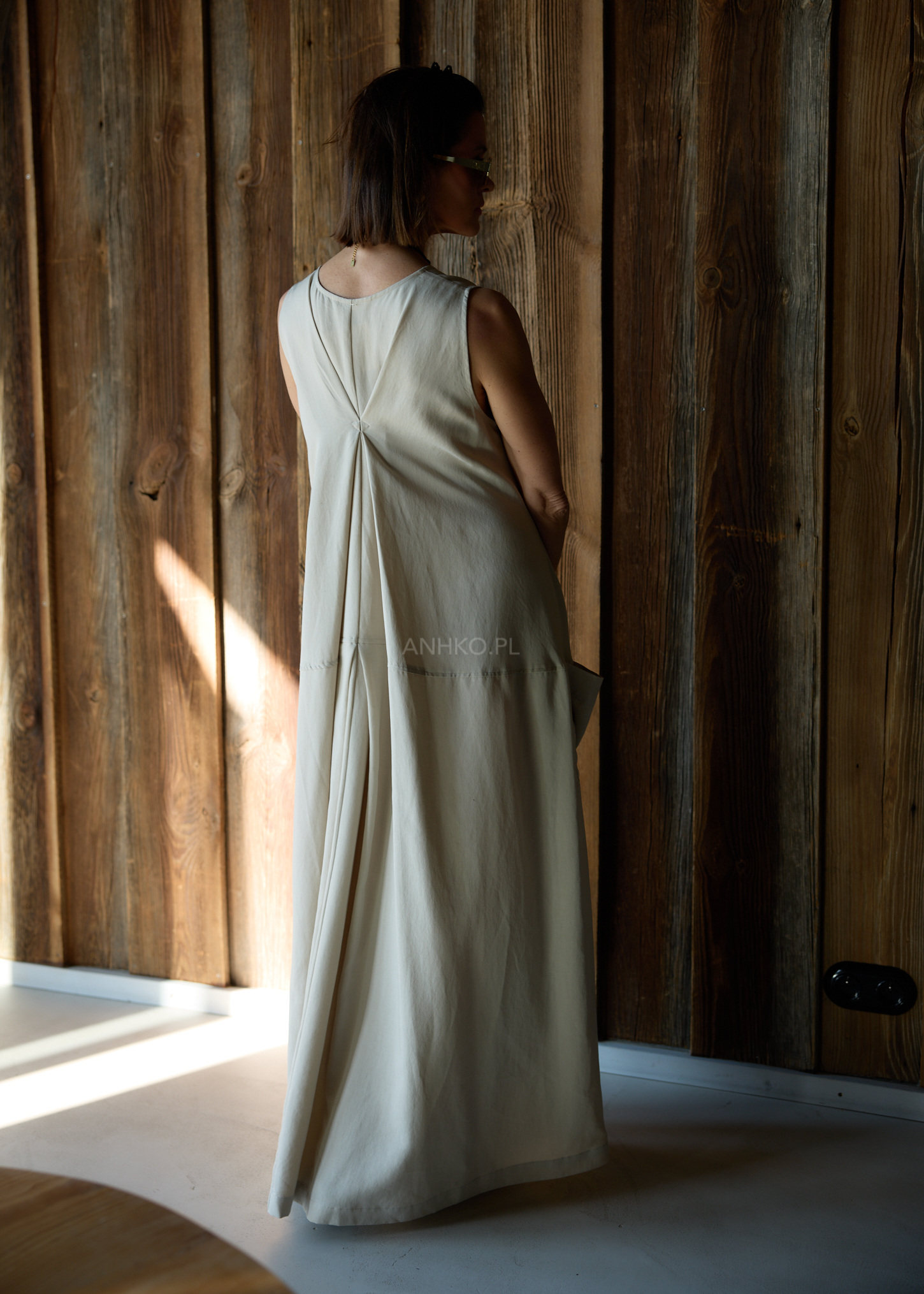 Model posiada okrągły dekolt z przodu oraz głębszy dekolt w kształcie V na plecach, dzięki czemu całość prezentuje się nowocześnie i kobieco. Długość maxi oraz praktyczne kieszenie po bokach sprawiają, że sukienka doskonale sprawdzi się zarówno w minimalistycznych stylizacjach, jak i bardziej wyrazistych zestawach z biżuterią lub cięższymi butami.
