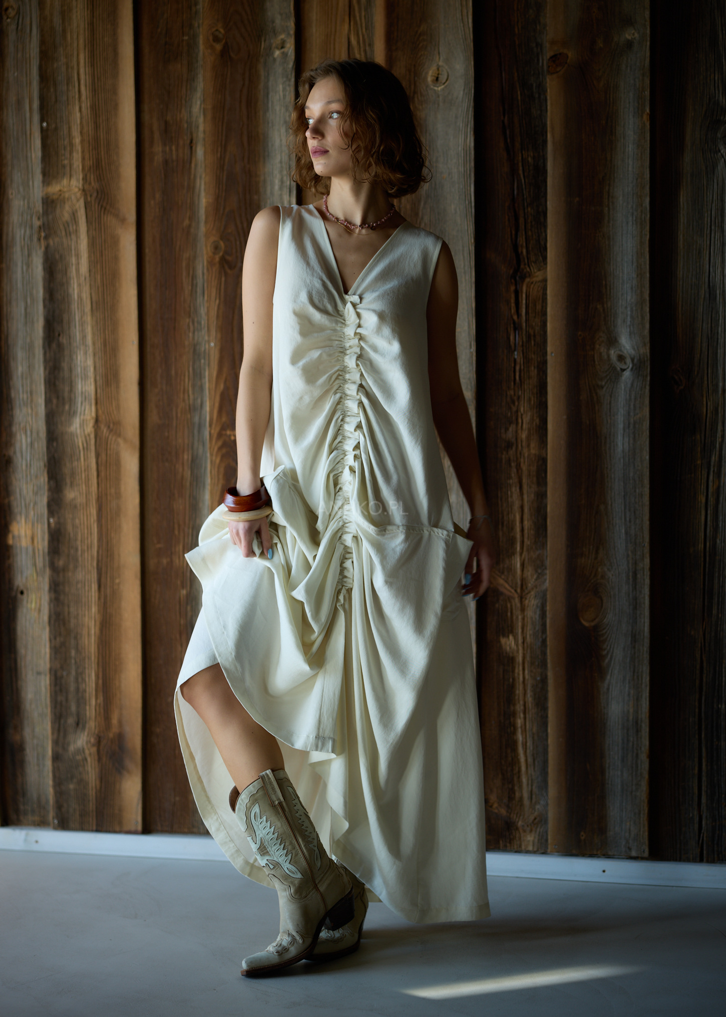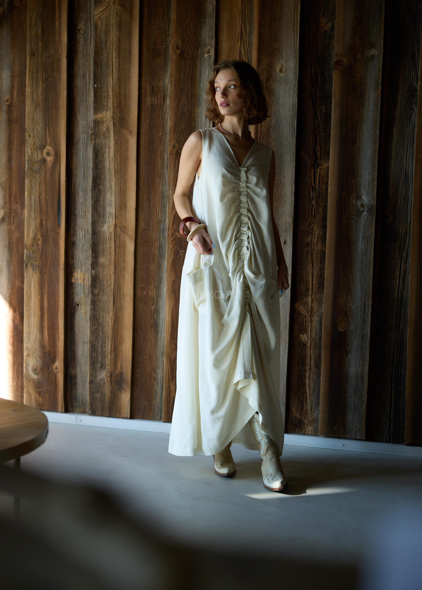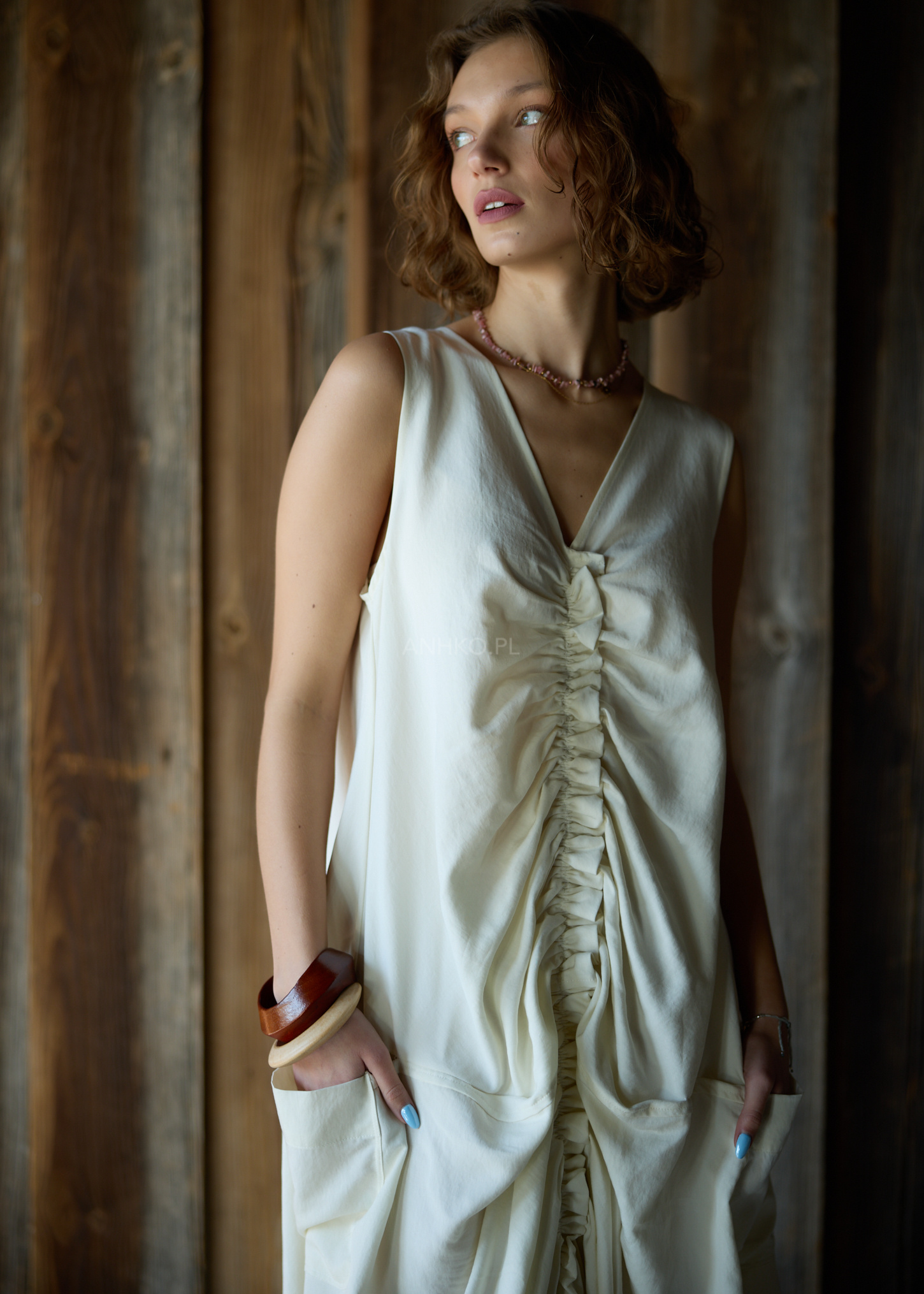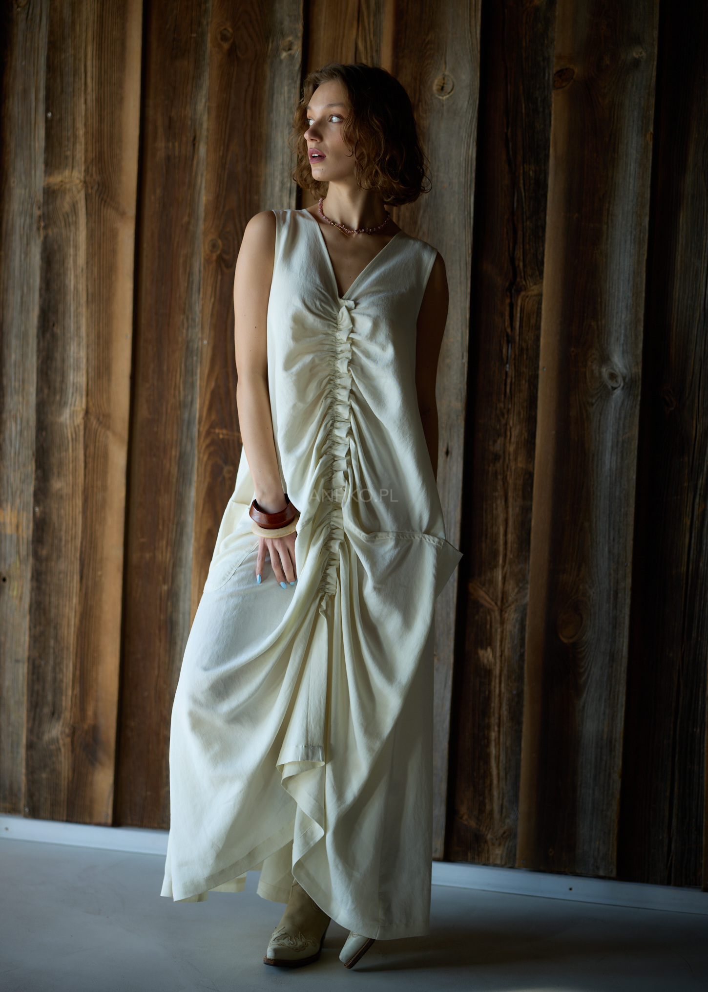 Ta sukienka maxi wyróżnia się nowoczesnym fasonem, który swobodnie układa się na sylwetce i tworzy efekt lekkiej, płynnej linii podczas ruchu. Luźny krój oversize zapewnia komfort noszenia, a centralne marszczenie biegnące przez całą długość przodu nadaje modelowi rzeźbiarskiego charakteru i przyciąga uwagę.