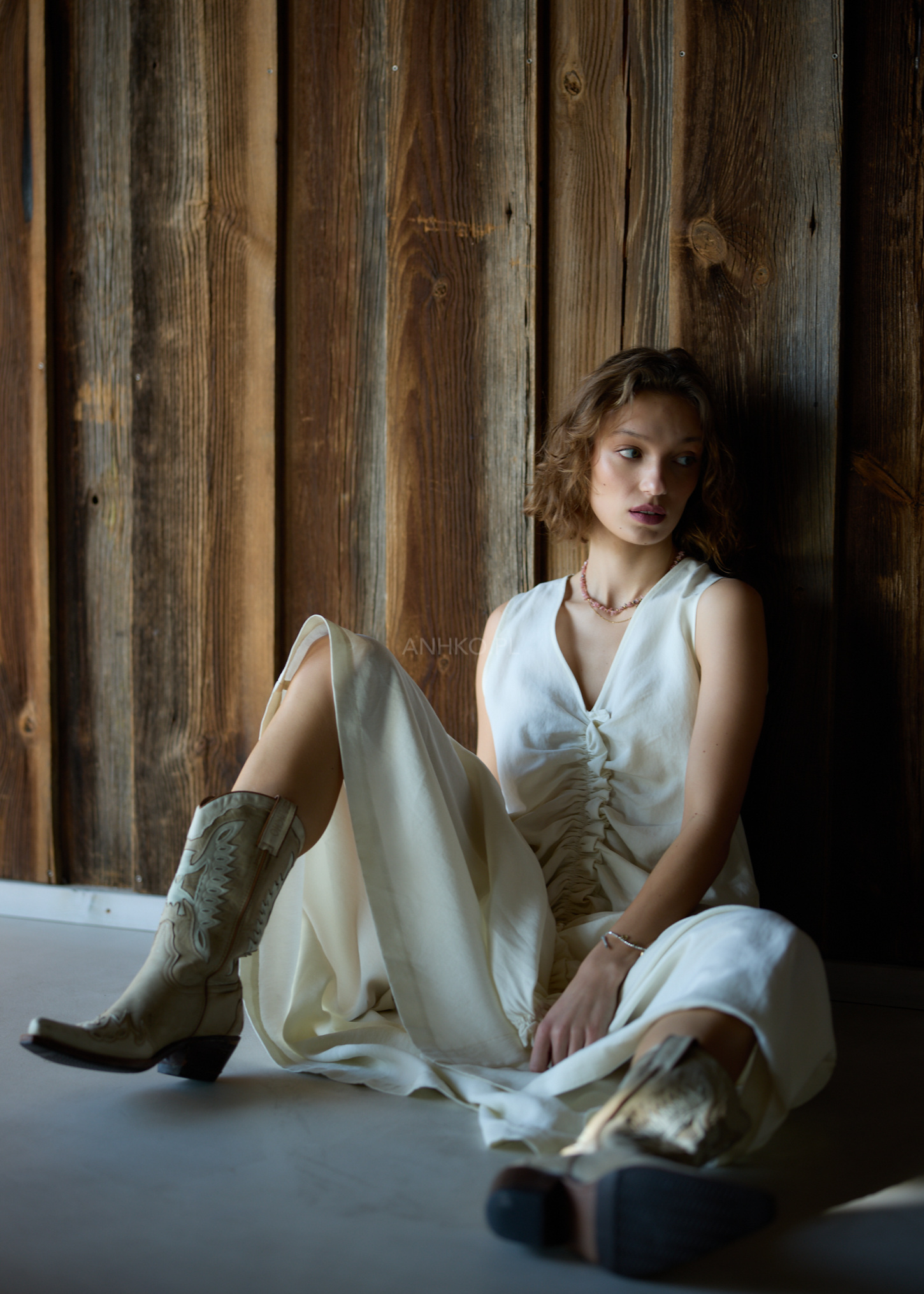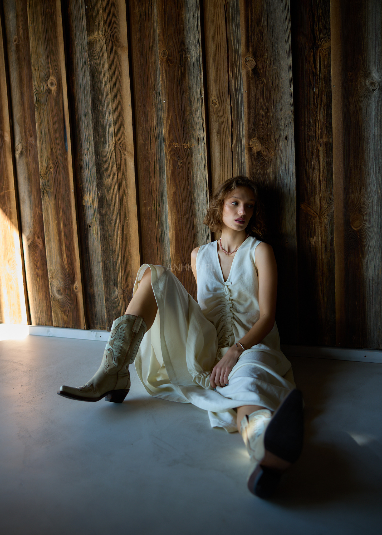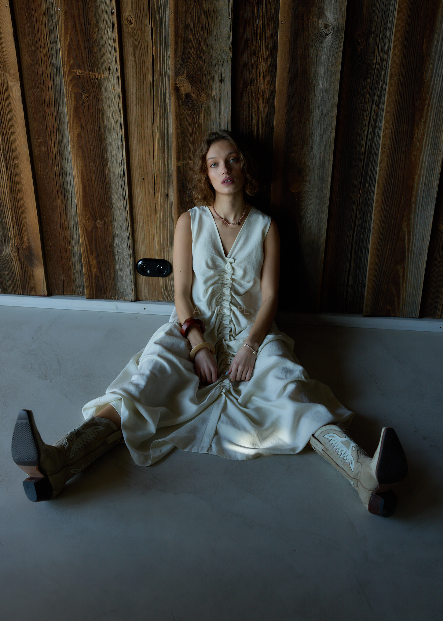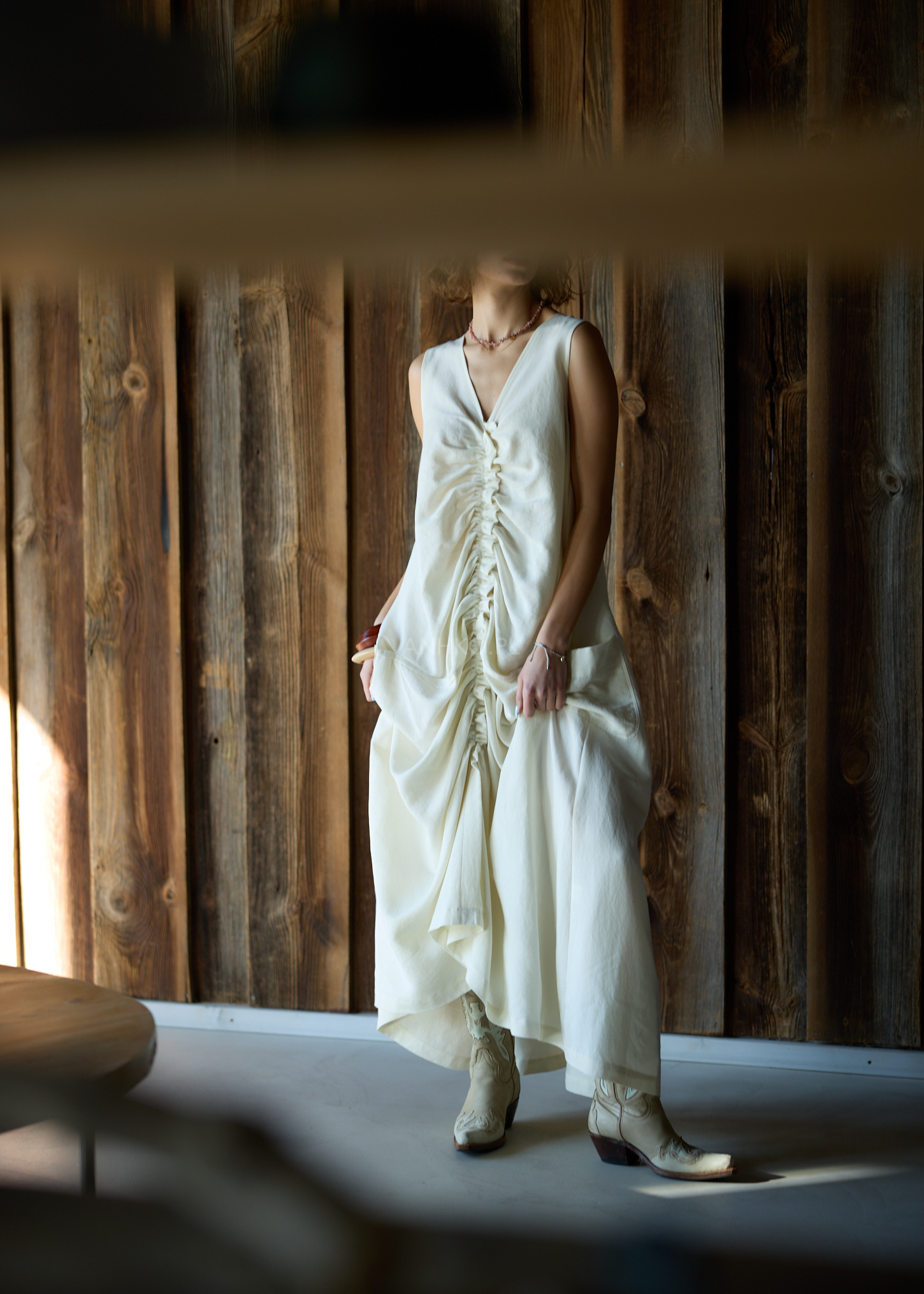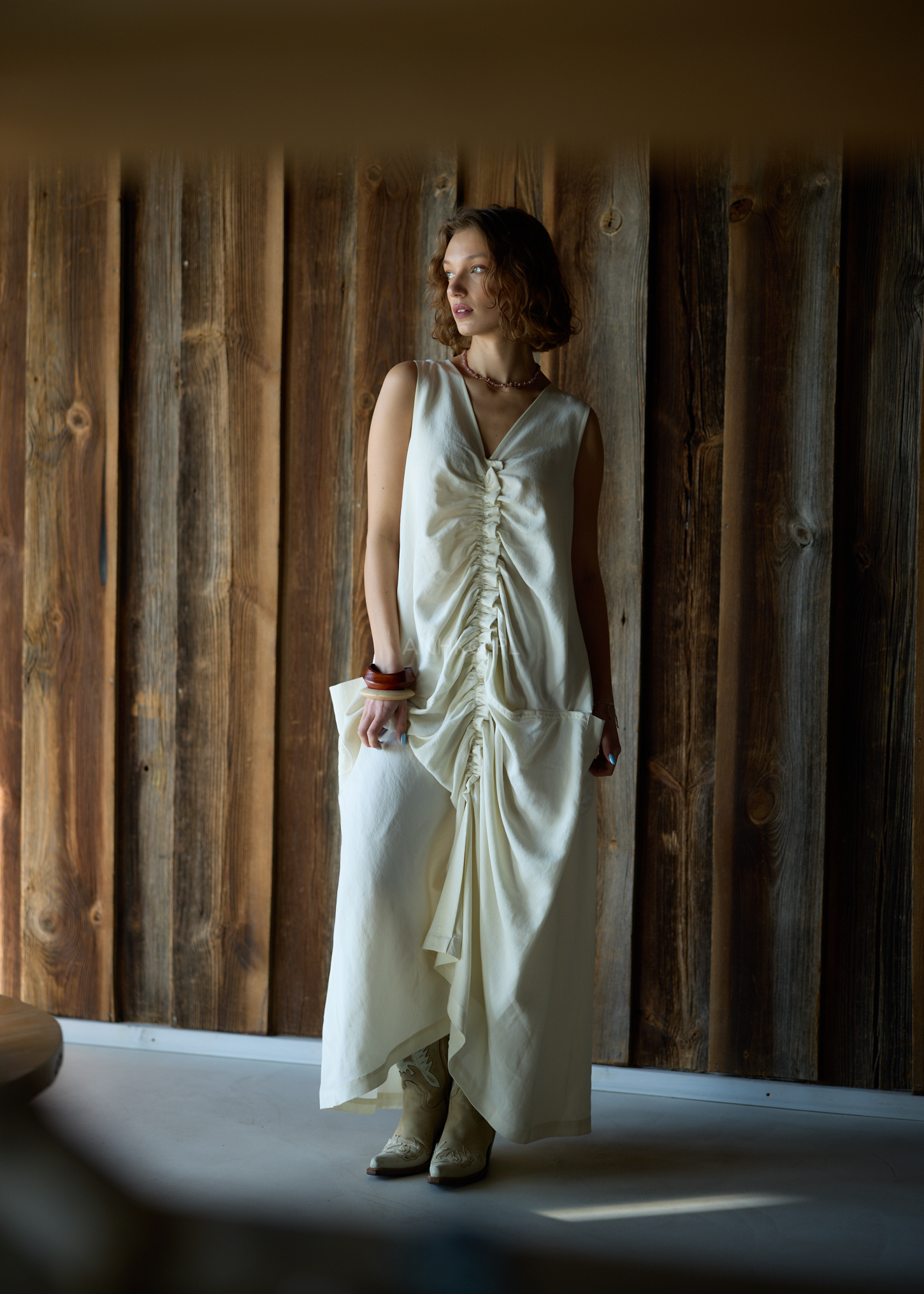 Ta sukienka maxi wyróżnia się nowoczesnym fasonem, który swobodnie układa się na sylwetce i tworzy efekt lekkiej, płynnej linii podczas ruchu. Luźny krój oversize zapewnia komfort noszenia, a centralne marszczenie biegnące przez całą długość przodu nadaje modelowi rzeźbiarskiego charakteru i przyciąga uwagę.