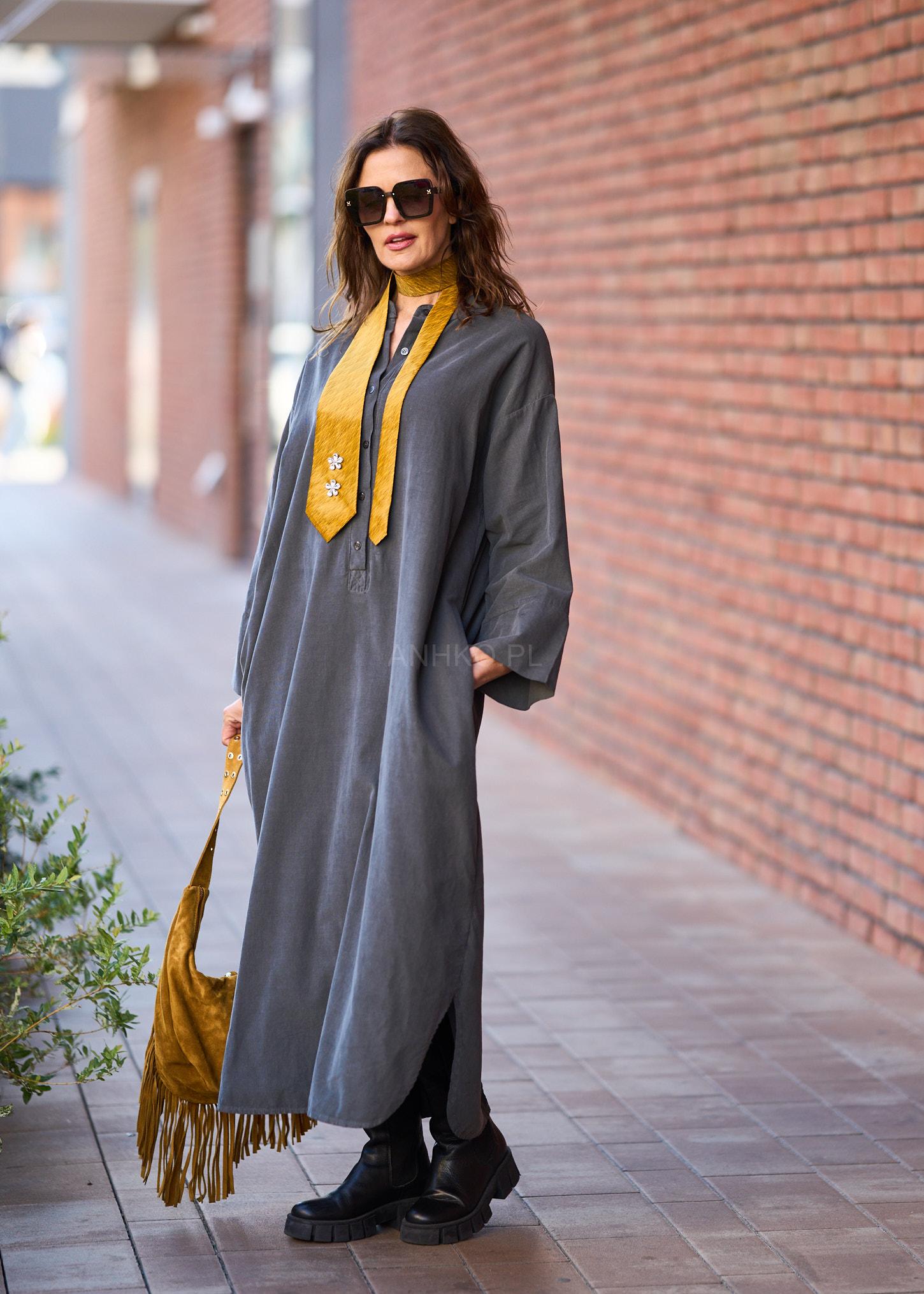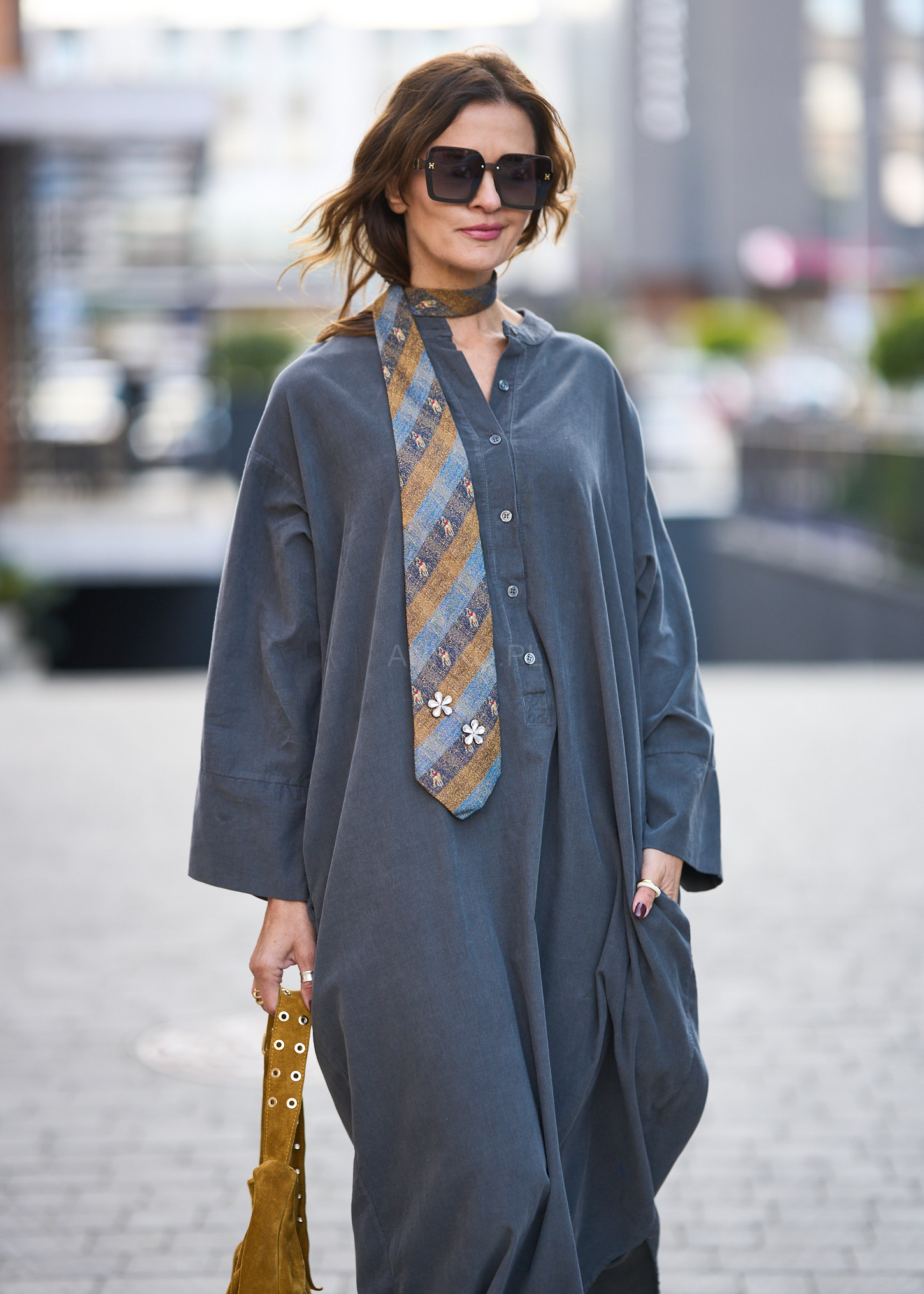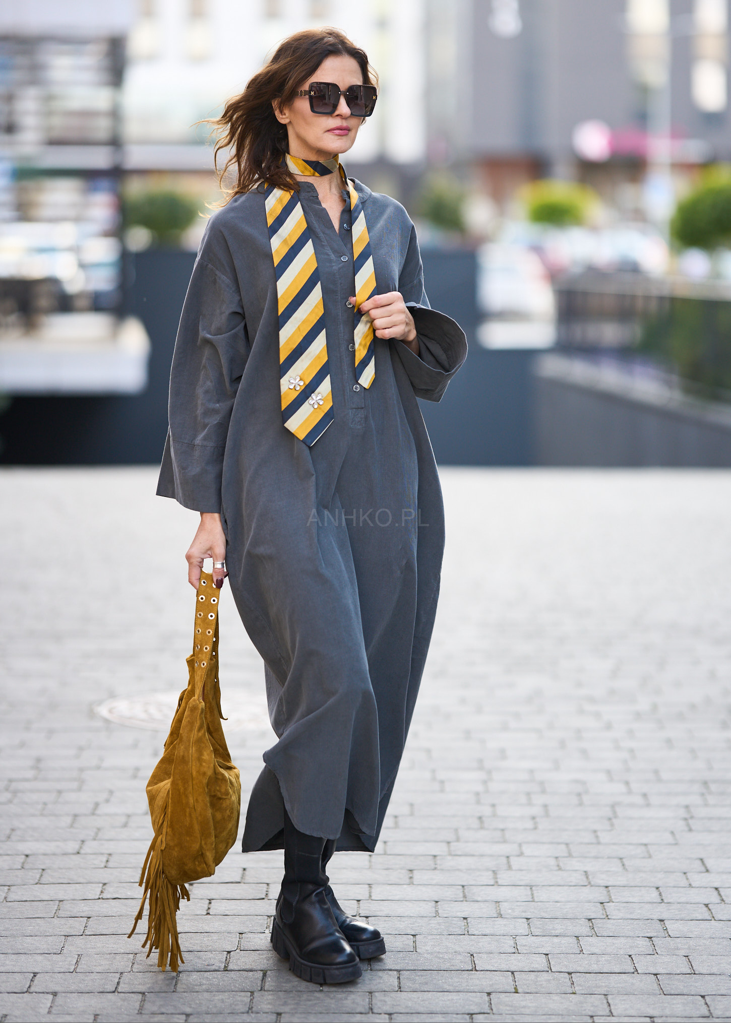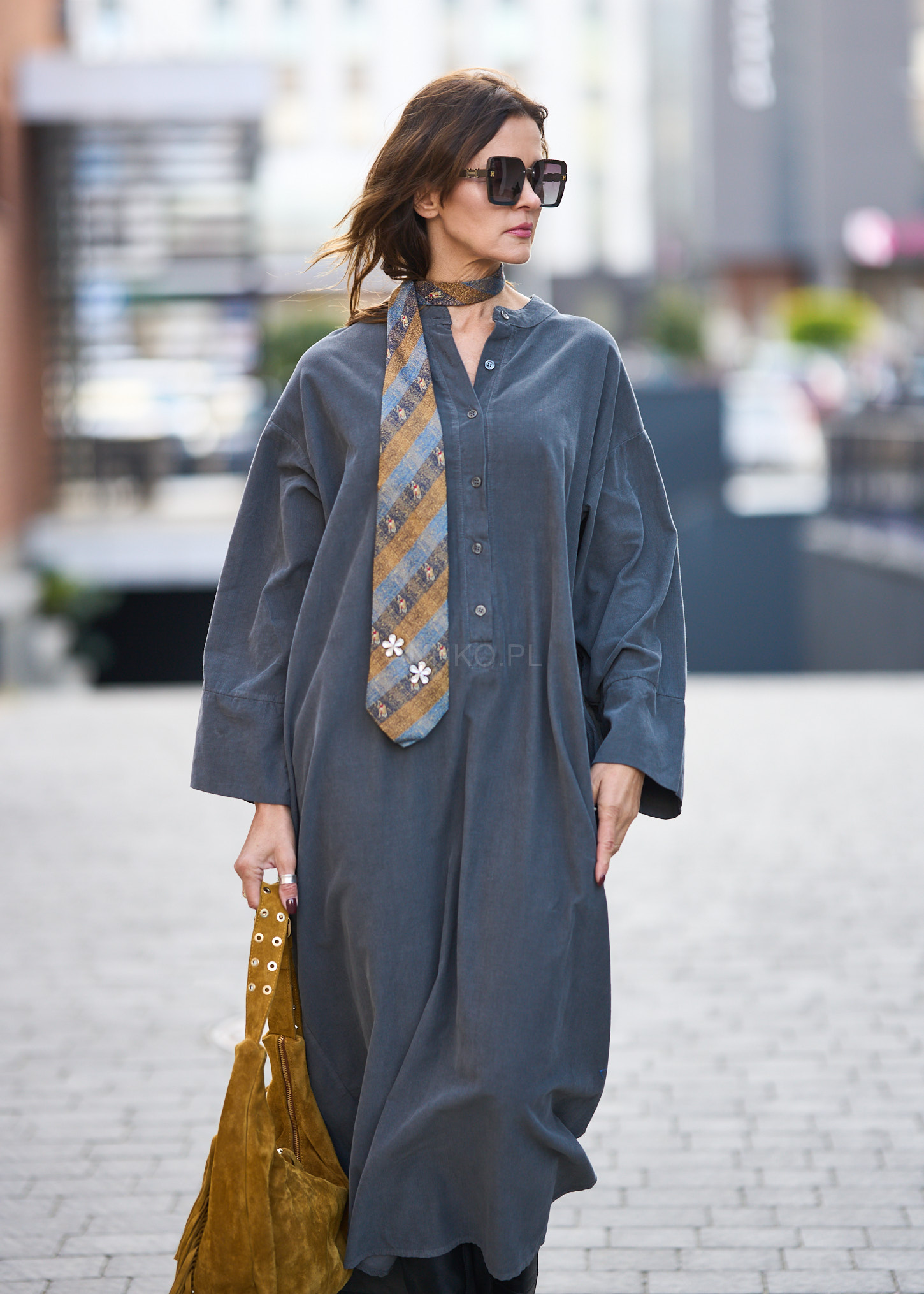 To połączenie włoskiego minimalizmu i naturalnego komfortu. Wykonana w 100% z cienkiego, miękkiego sztruksu z bawełny, doskonale układa się na sylwetce i zapewnia przewiewność oraz przyjemne ciepło. Luźny fason o koszulowym kroju, zapinany na guziki, sprawia, że model jest niezwykle uniwersalny. Okrągły kołnierzyk i obniżona linia ramion nadają jej subtelnego charakteru, a boczne kieszenie zwiększają funkcjonalność. Sukienka sprawdzi się w codziennych stylizacjach – do botków, trampek lub kozaków. Idealna do pracy, na spacer lub spotkanie w mieście. Stworzona z myślą o kobietach, które cenią prostotę, wygodę i ponadczasowy styl.