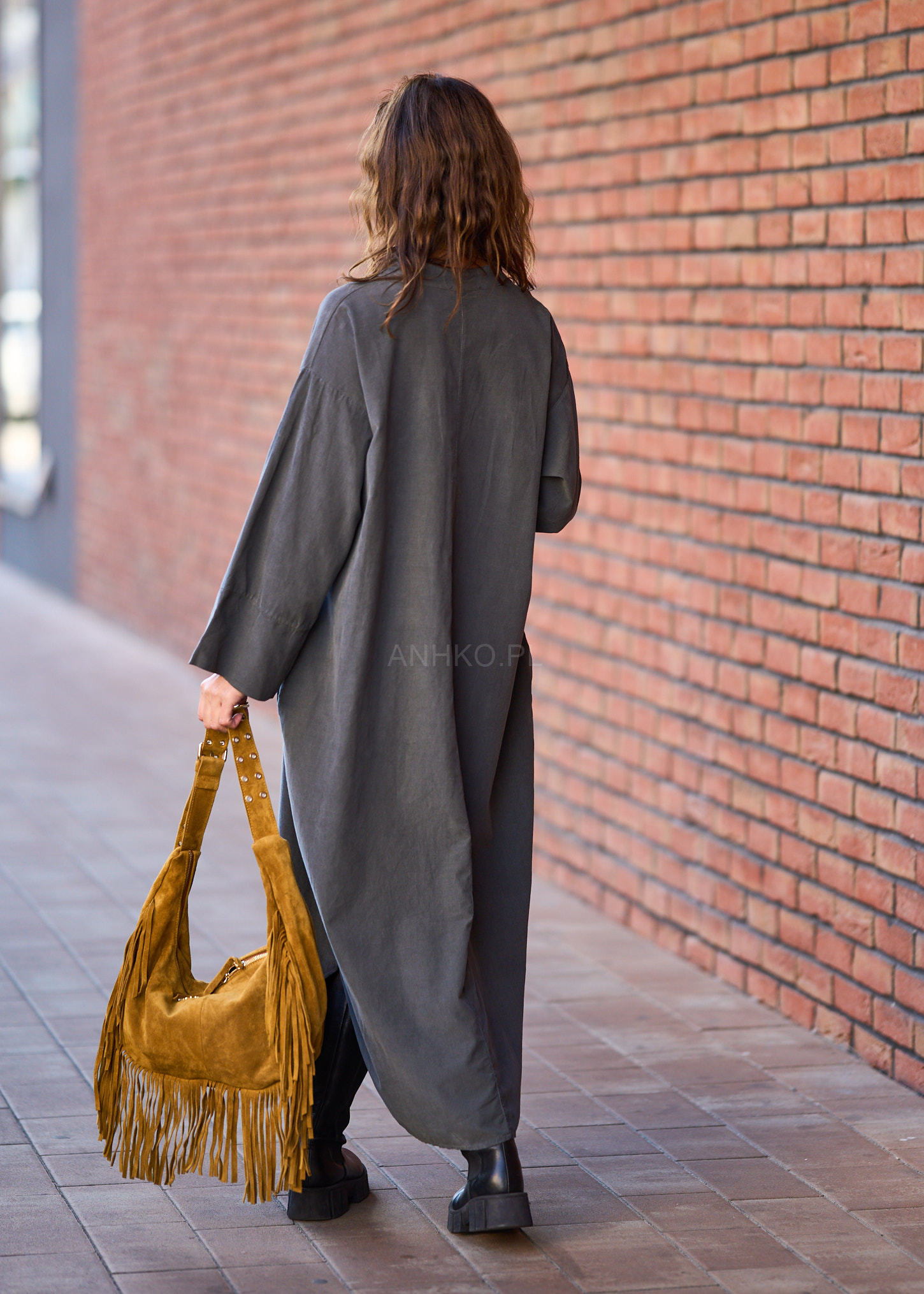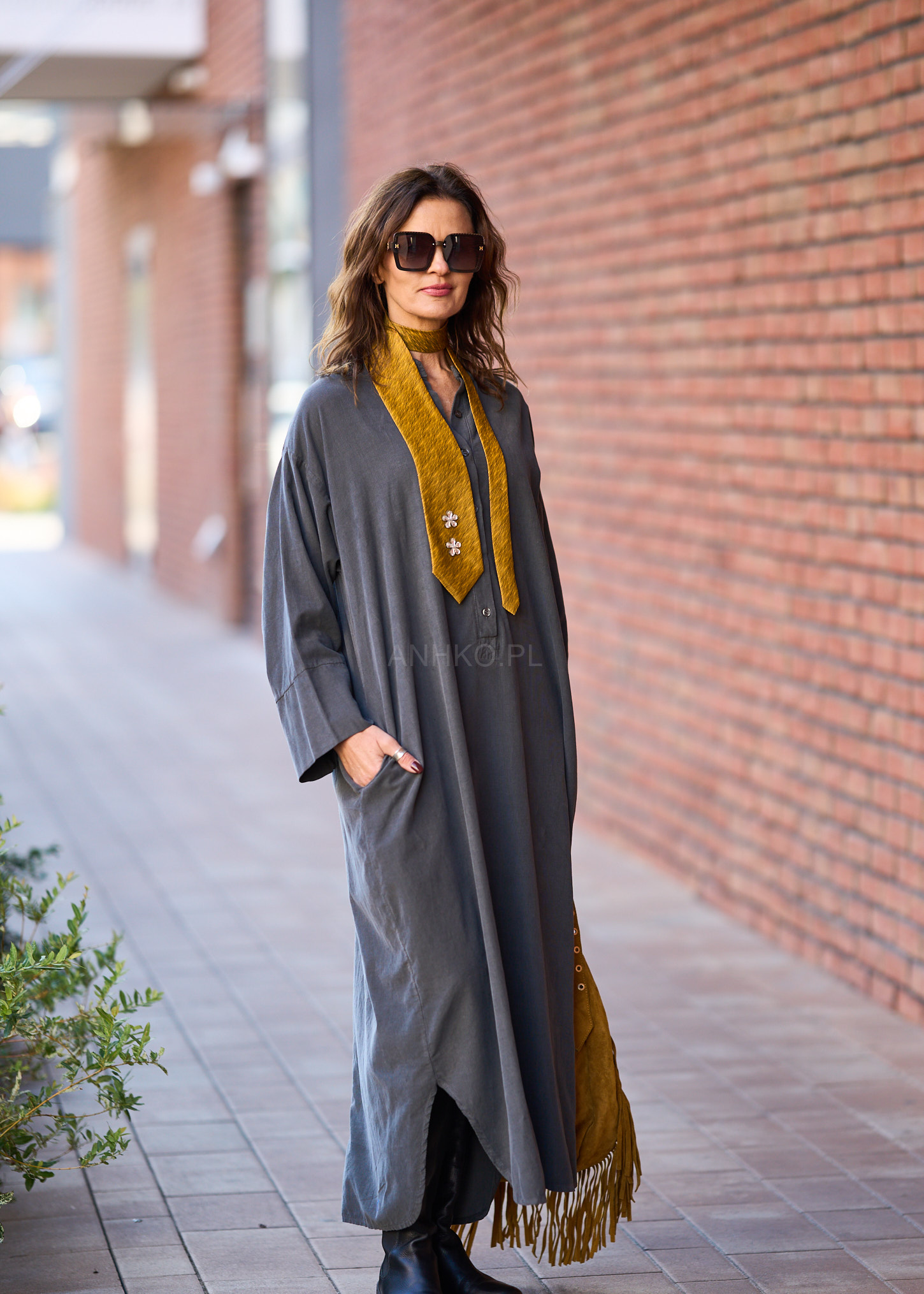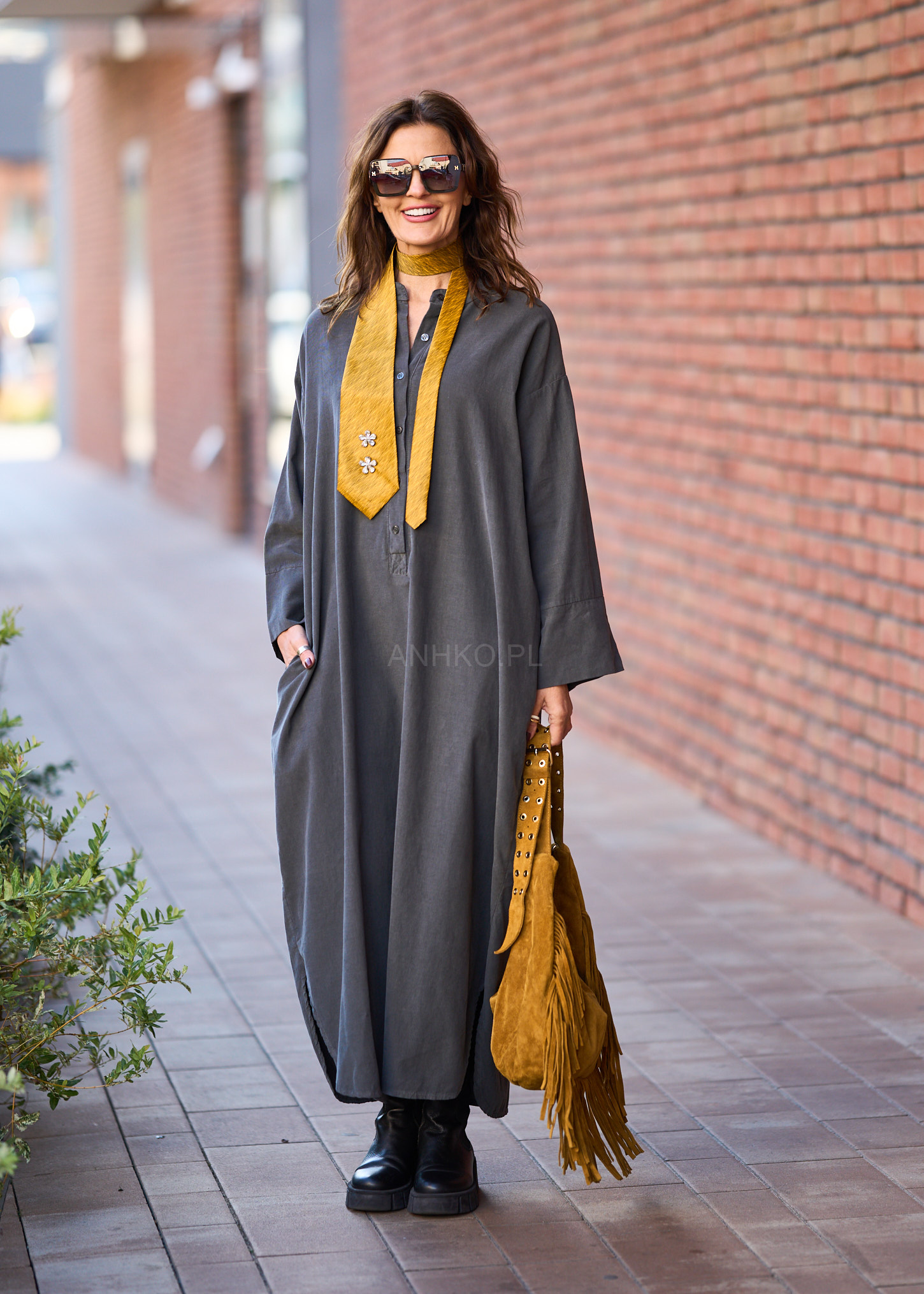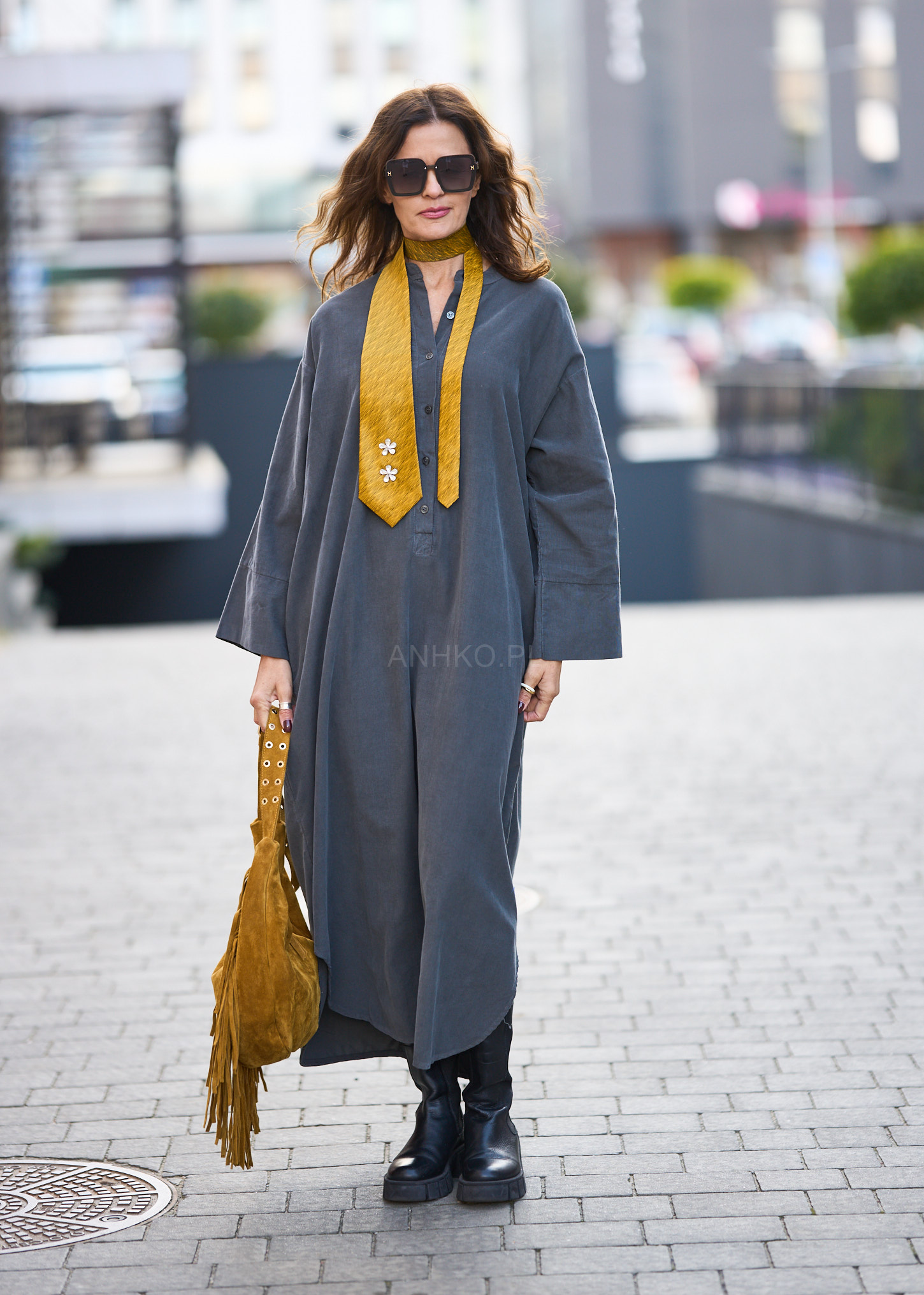 To połączenie włoskiego minimalizmu i naturalnego komfortu. Wykonana w 100% z cienkiego, miękkiego sztruksu z bawełny, doskonale układa się na sylwetce i zapewnia przewiewność oraz przyjemne ciepło. Luźny fason o koszulowym kroju, zapinany na guziki, sprawia, że model jest niezwykle uniwersalny. Okrągły kołnierzyk i obniżona linia ramion nadają jej subtelnego charakteru, a boczne kieszenie zwiększają funkcjonalność. Sukienka sprawdzi się w codziennych stylizacjach – do botków, trampek lub kozaków. Idealna do pracy, na spacer lub spotkanie w mieście. Stworzona z myślą o kobietach, które cenią prostotę, wygodę i ponadczasowy styl.