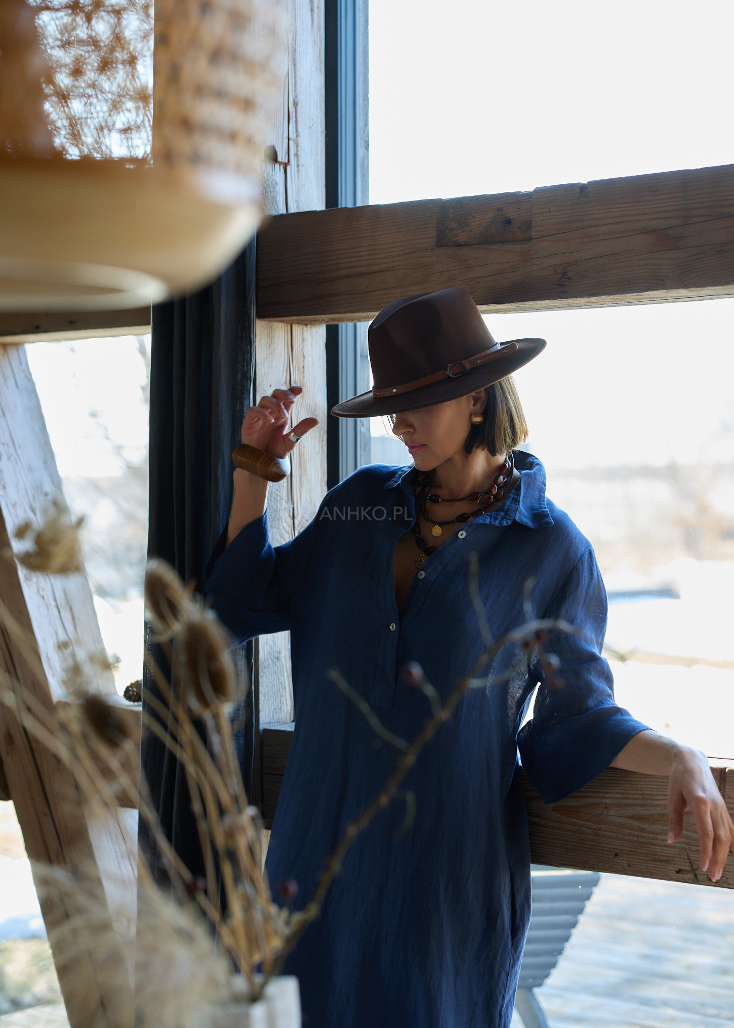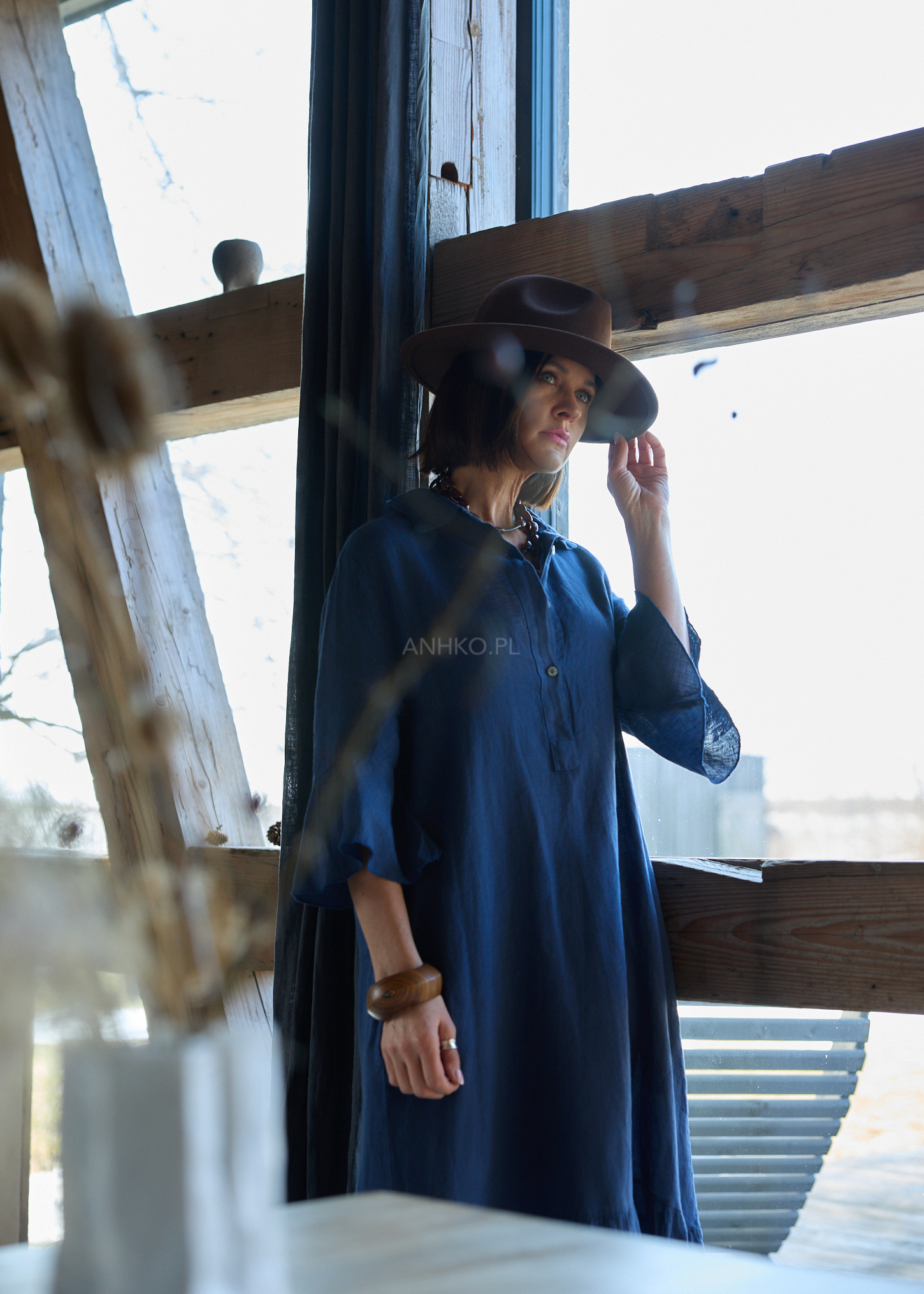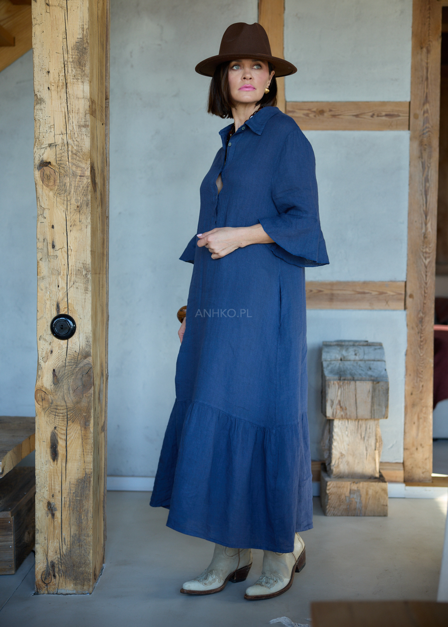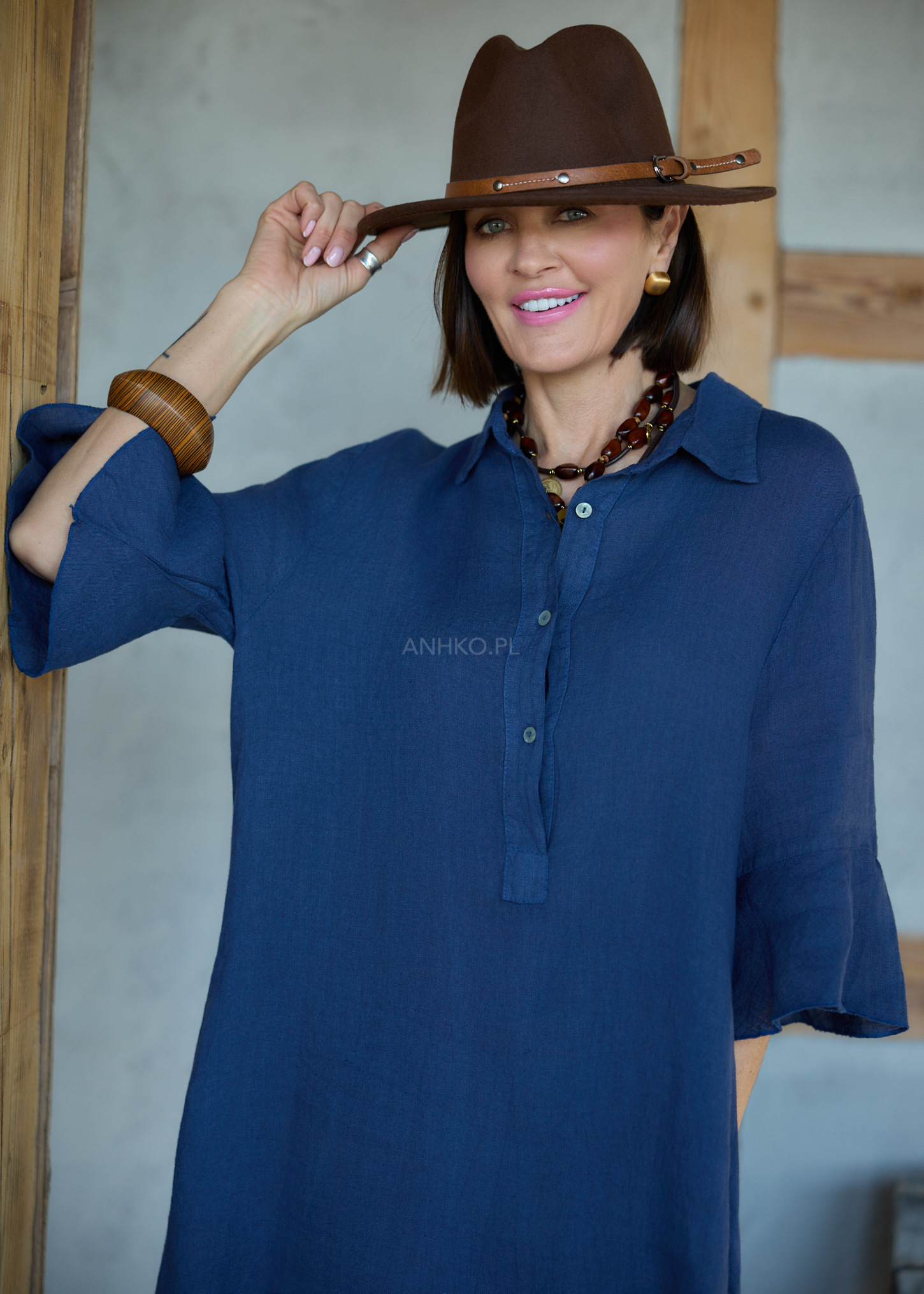 Granatowy odcień przyciąga uwagę i dodaje energii stylizacji, podkreślając jej świeżość i nowoczesność. Szerokie rękawy z falowanym wykończeniem nadają sylwetce lekkości, a naturalny len zapewnia komfort noszenia zarówno w ciągu dnia, jak i w bardziej wymagających warunkach. To model, który sprawdzi się w miejskich stylizacjach, podczas wyjazdów i wszędzie tam, gdzie liczy się styl bez wysiłku.