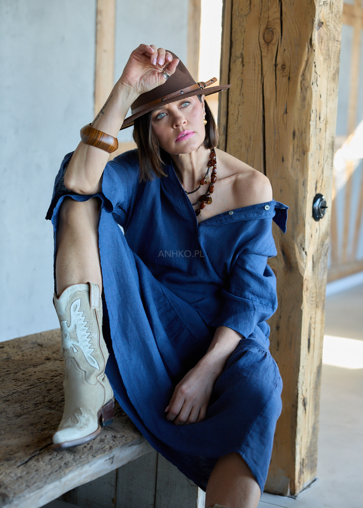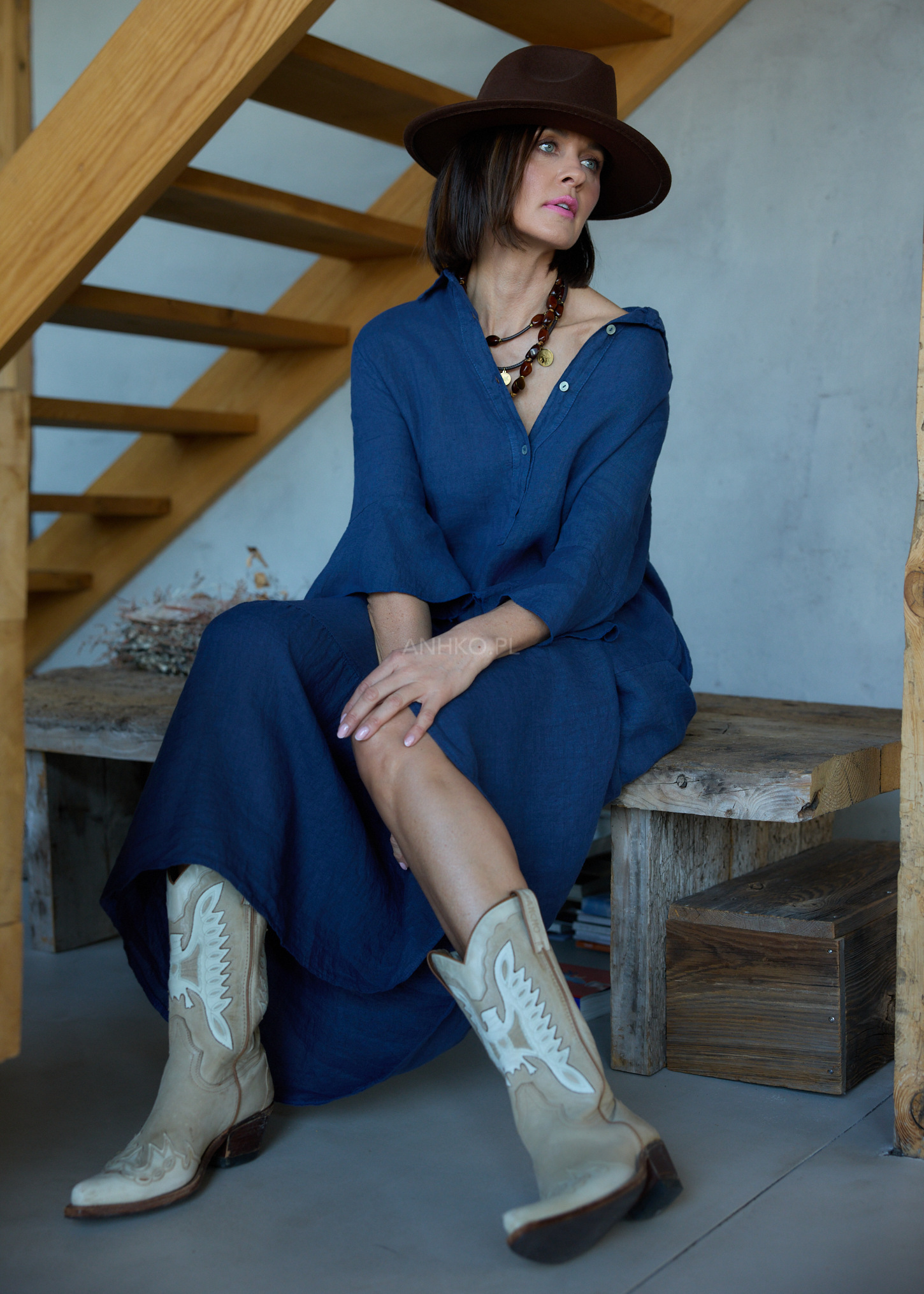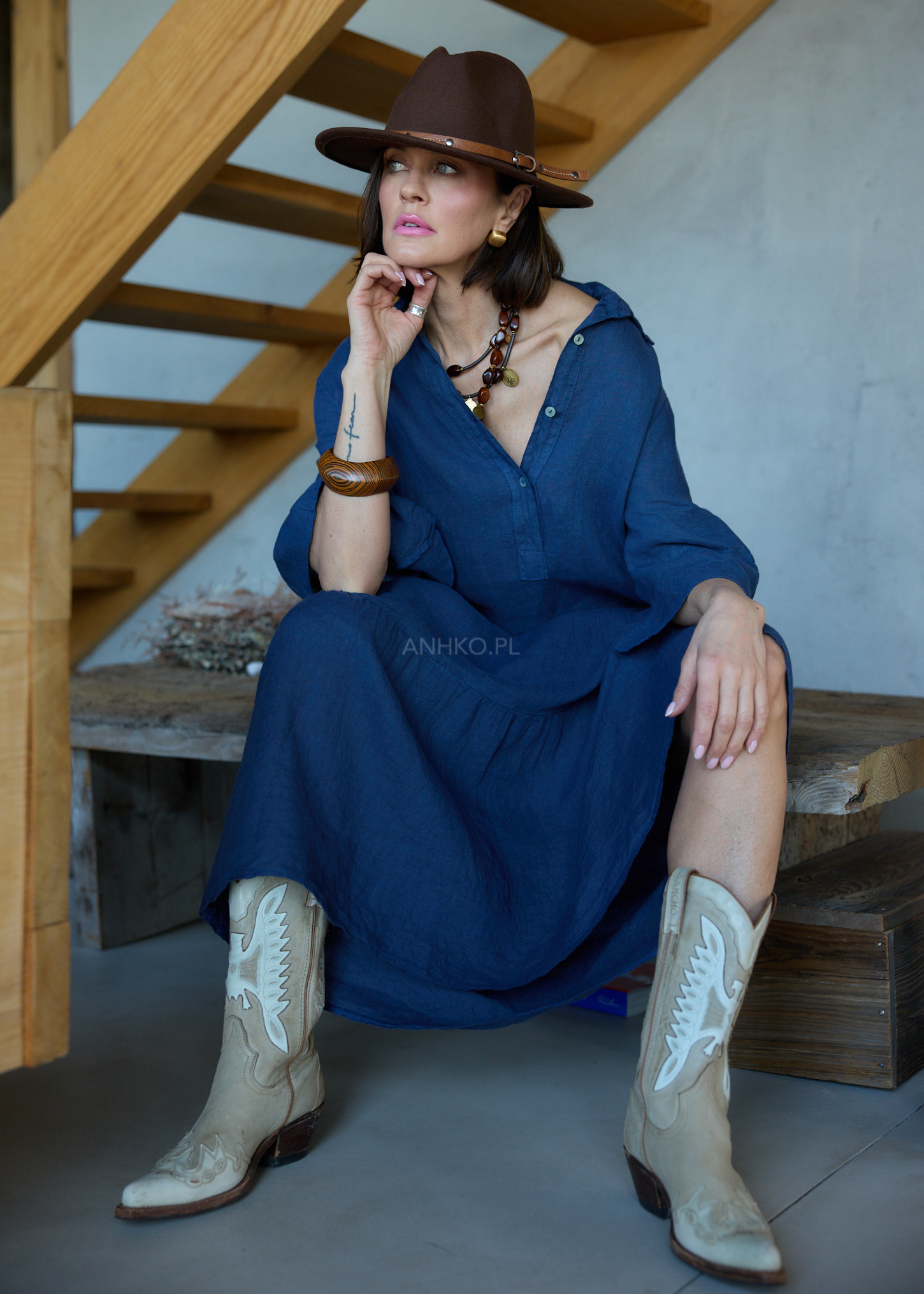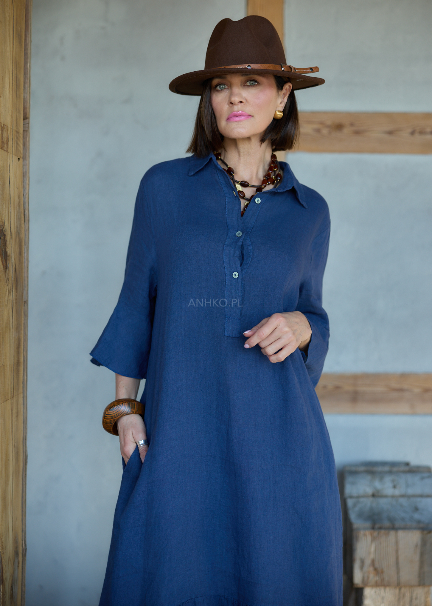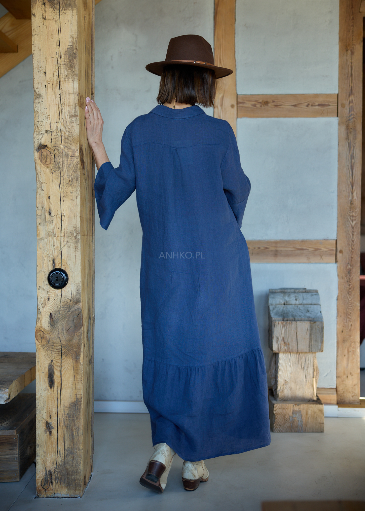 Ta lniana sukienka midi o oversize’owym kroju miękko układa się na sylwetce, tworząc efekt lekkości i naturalnej swobody. Luźna forma delikatnie opływa ciało, nie krępując ruchów, a falujący dół subtelnie pracuje przy każdym kroku. Koszulowa góra z kołnierzykiem wprowadza nutę uporządkowanej elegancji, która świetnie balansuje z bardziej swobodnym charakterem fasonu.