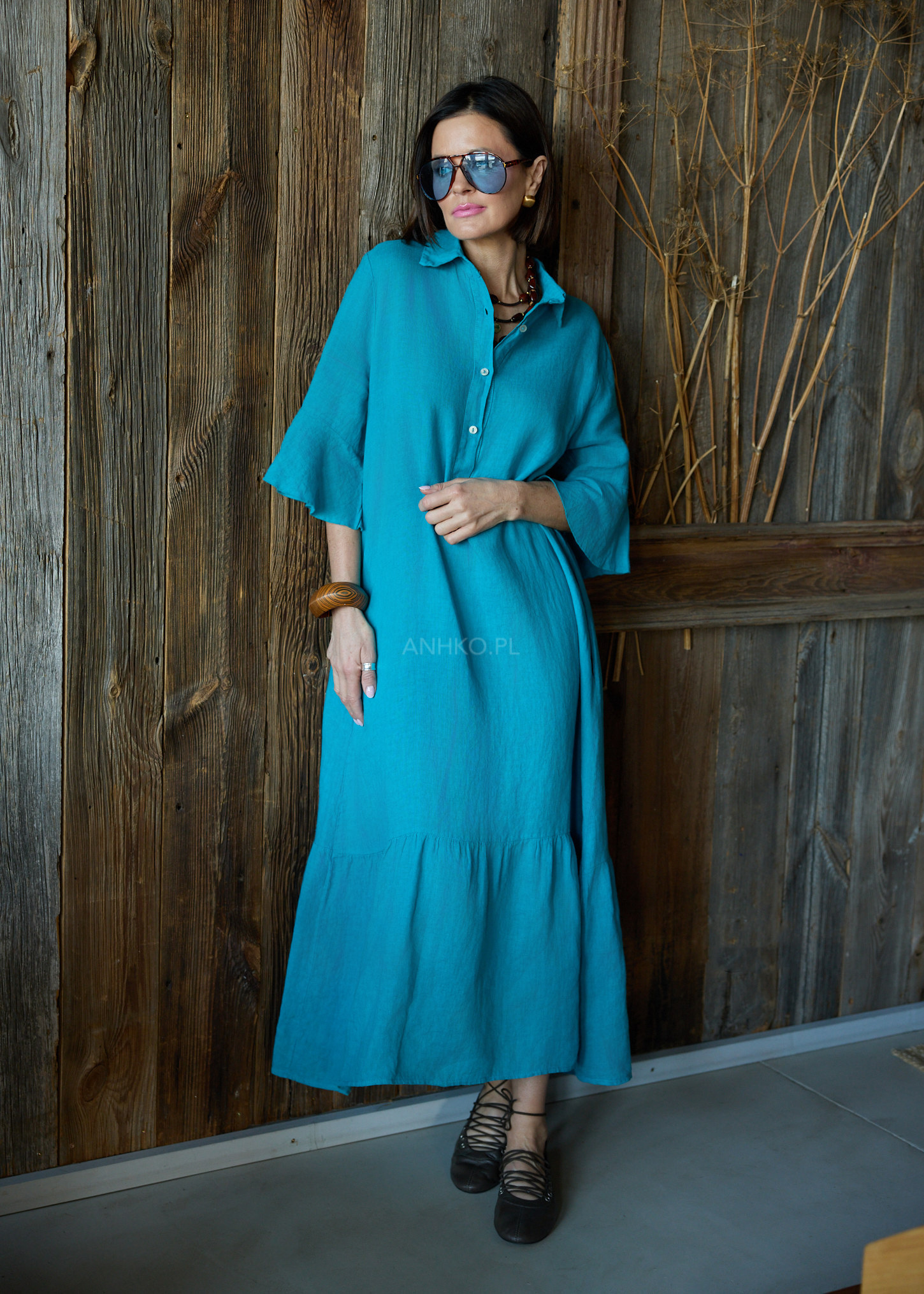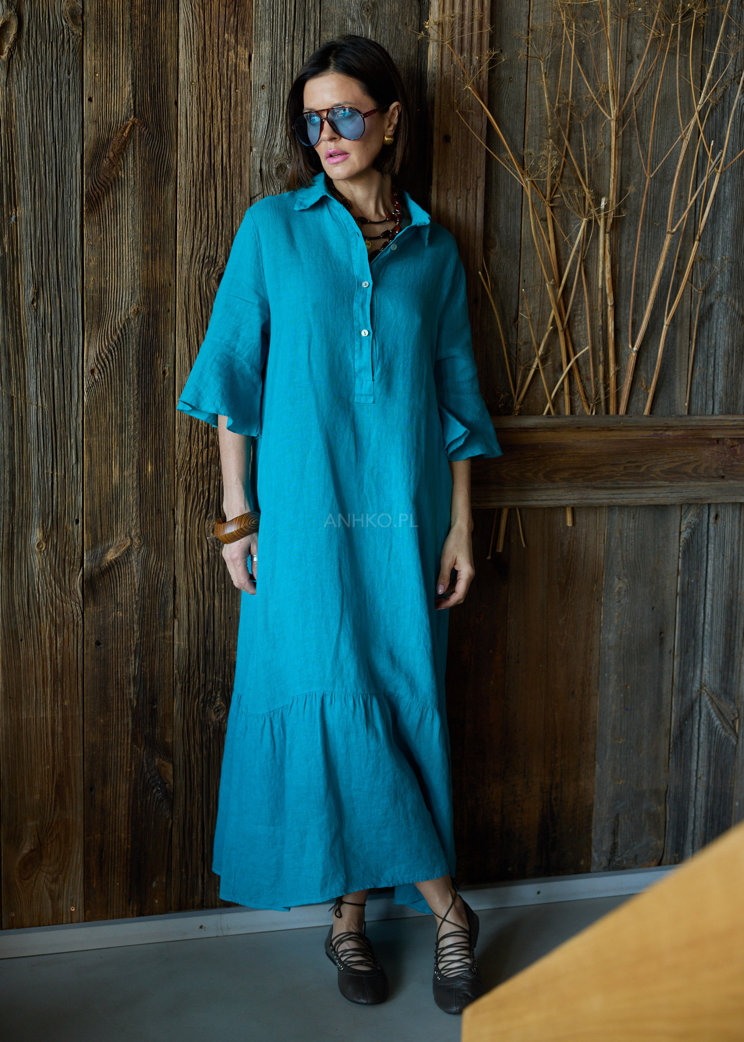Turkusowy odcień przyciąga uwagę i dodaje energii stylizacji, podkreślając jej świeżość i nowoczesność. Szerokie rękawy z falowanym wykończeniem nadają sylwetce lekkości, a naturalny len zapewnia komfort noszenia zarówno w ciągu dnia, jak i w bardziej wymagających warunkach. To model, który sprawdzi się w miejskich stylizacjach, podczas wyjazdów i wszędzie tam, gdzie liczy się styl bez wysiłku.