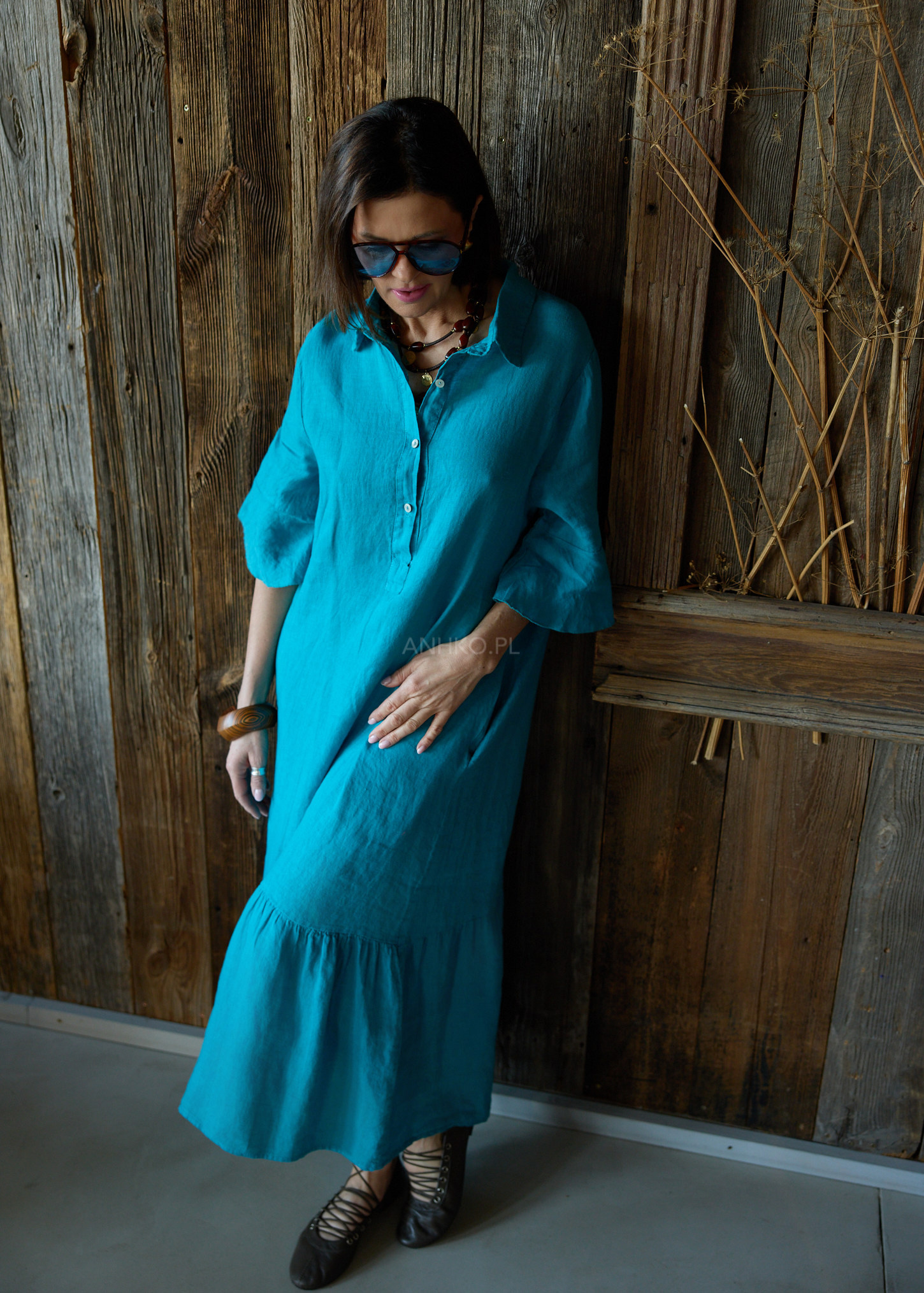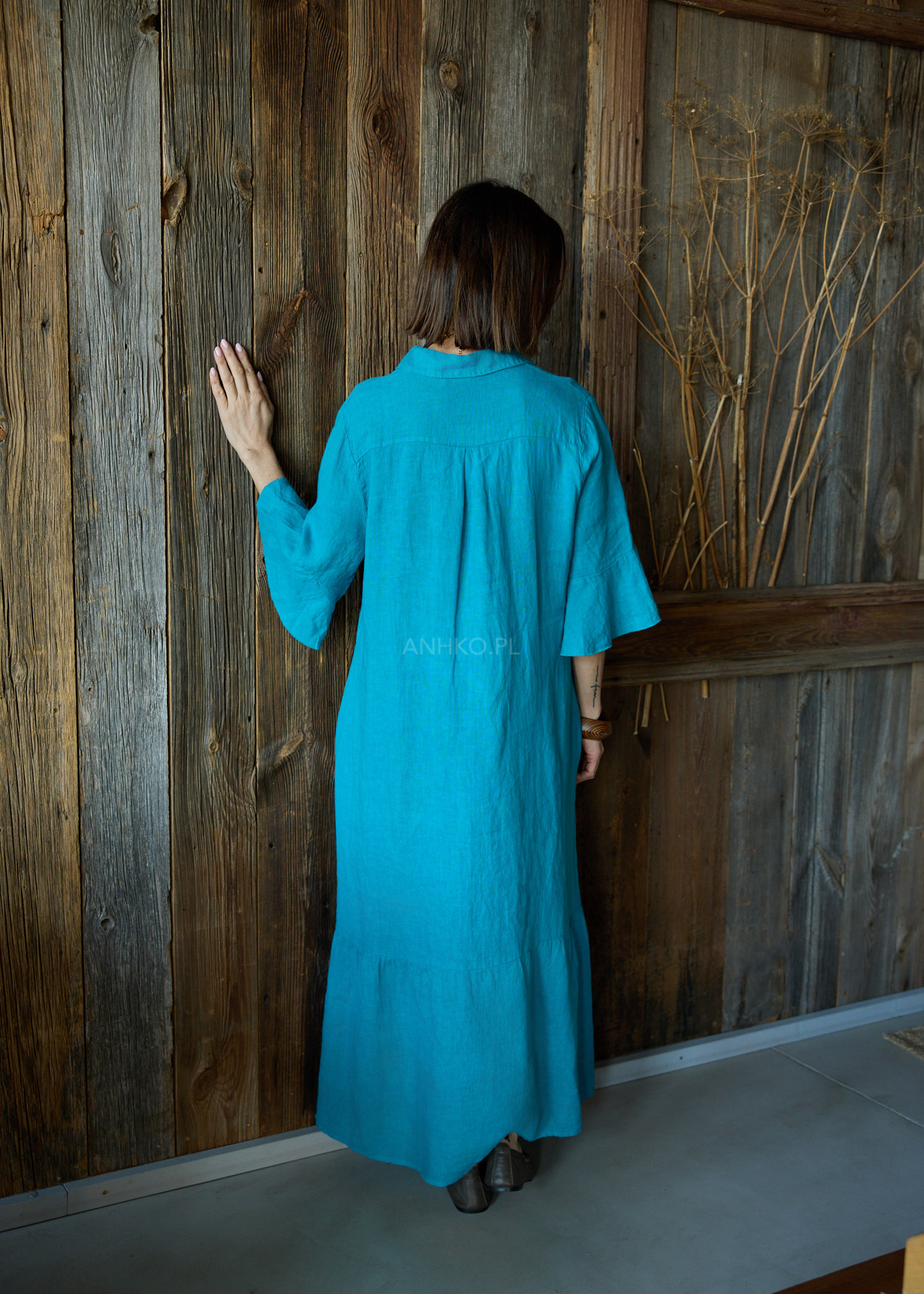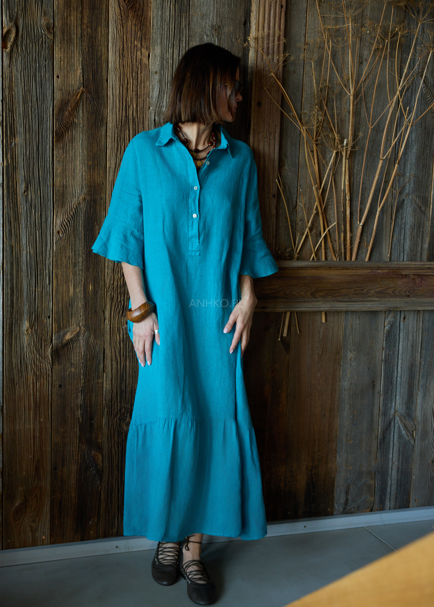 Ta lniana sukienka midi o oversize’owym kroju miękko układa się na sylwetce, tworząc efekt lekkości i naturalnej swobody. Luźna forma delikatnie opływa ciało, nie krępując ruchów, a falujący dół subtelnie pracuje przy każdym kroku. Koszulowa góra z kołnierzykiem wprowadza nutę uporządkowanej elegancji, która świetnie balansuje z bardziej swobodnym charakterem fasonu.