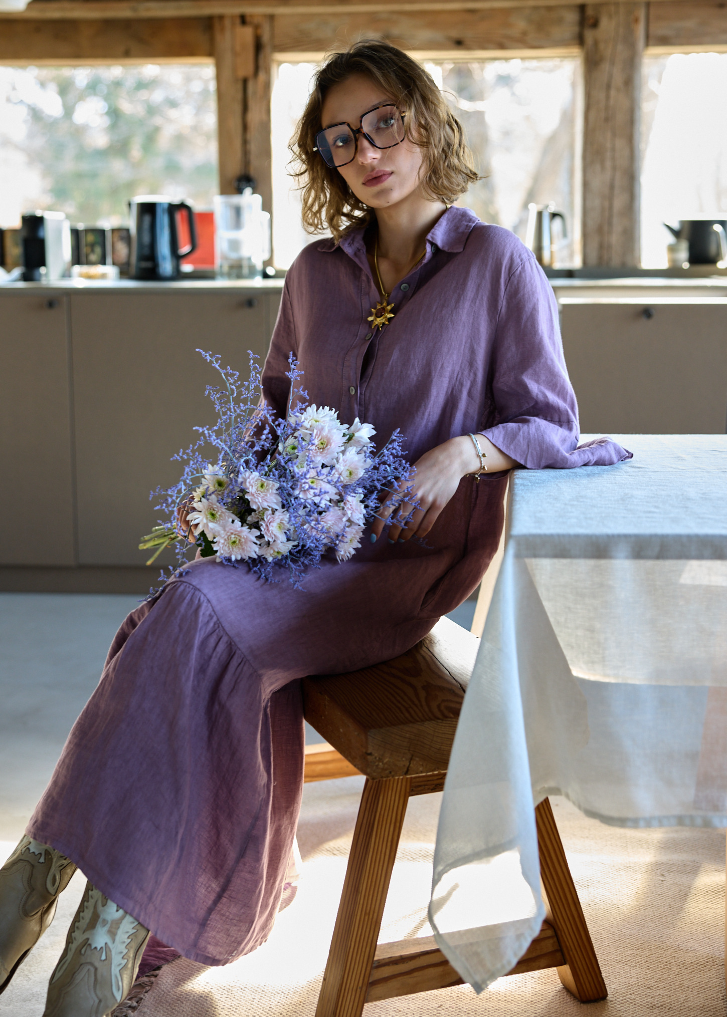 Ta lniana sukienka midi o oversize’owym kroju miękko układa się na sylwetce, tworząc efekt lekkości i naturalnej swobody. Luźna forma delikatnie opływa ciało, nie krępując ruchów, a falujący dół subtelnie pracuje przy każdym kroku. Koszulowa góra z kołnierzykiem wprowadza nutę uporządkowanej elegancji, która świetnie balansuje z bardziej swobodnym charakterem fasonu.