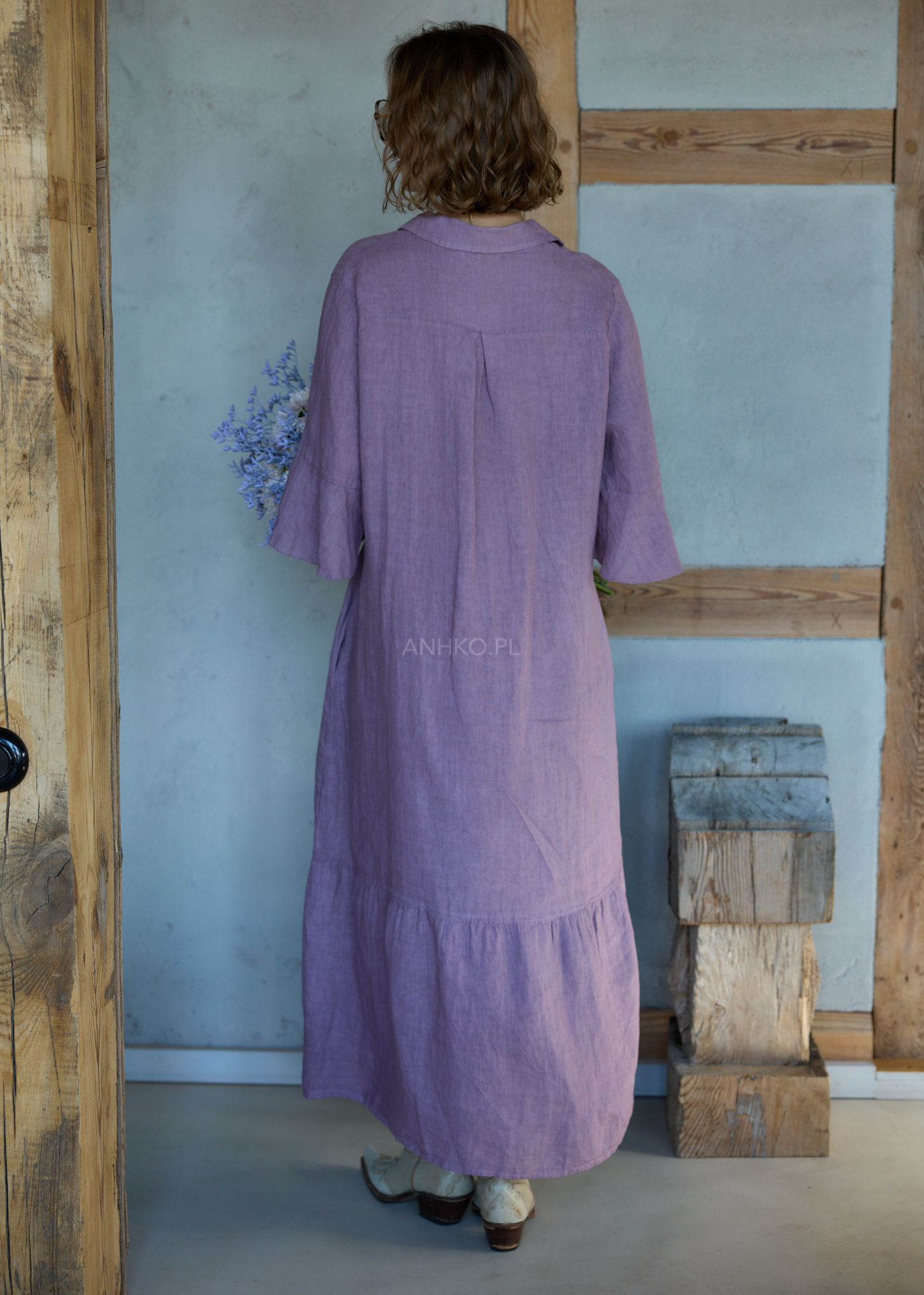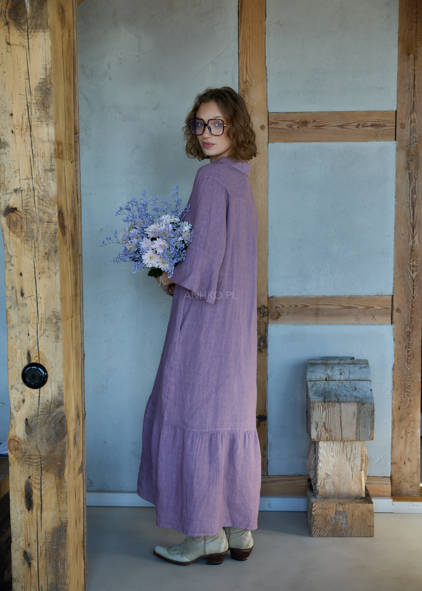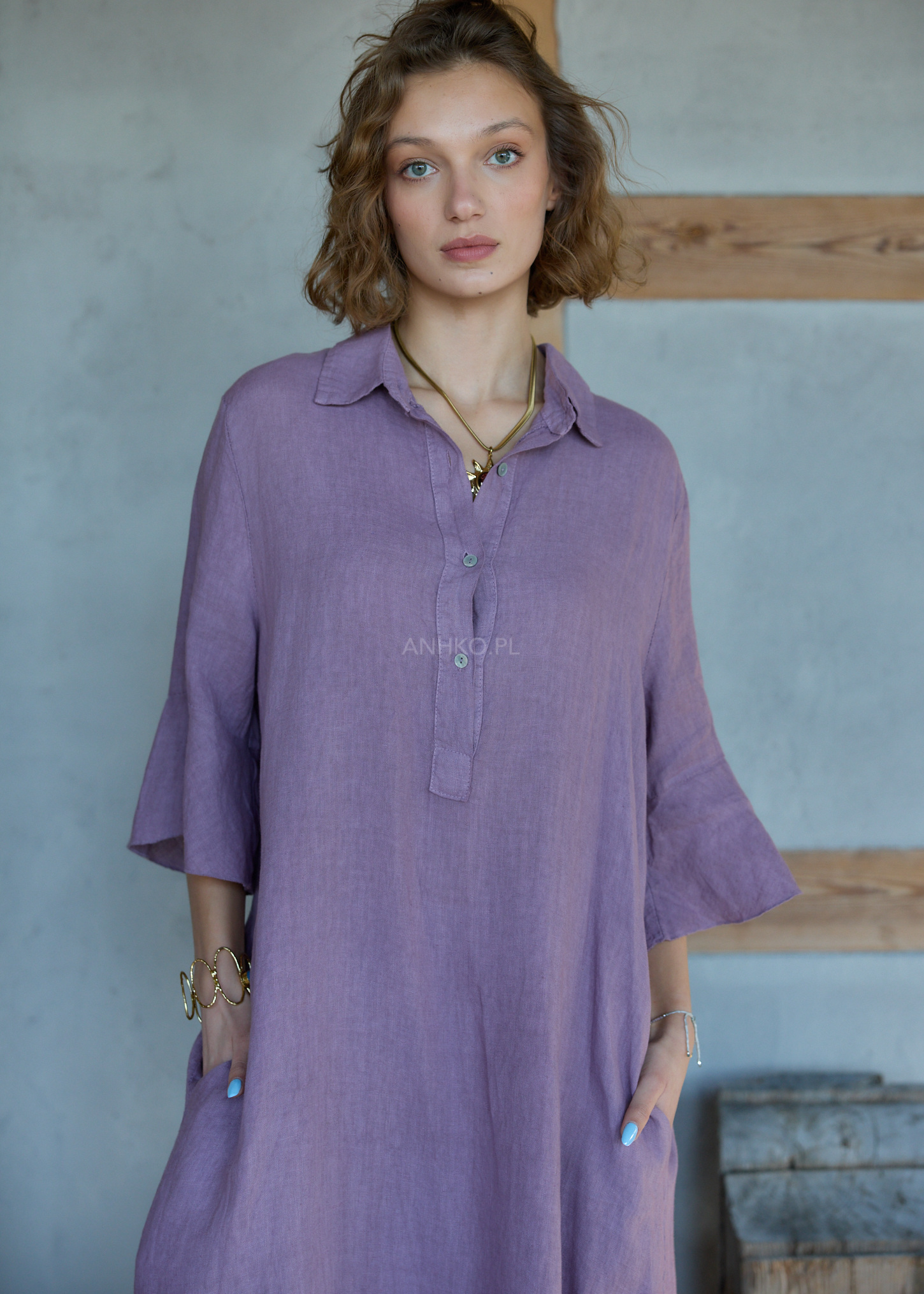 Wrzosowy odcień przyciąga uwagę i dodaje energii stylizacji, podkreślając jej świeżość i nowoczesność. Szerokie rękawy z falowanym wykończeniem nadają sylwetce lekkości, a naturalny len zapewnia komfort noszenia zarówno w ciągu dnia, jak i w bardziej wymagających warunkach. To model, który sprawdzi się w miejskich stylizacjach, podczas wyjazdów i wszędzie tam, gdzie liczy się styl bez wysiłku.