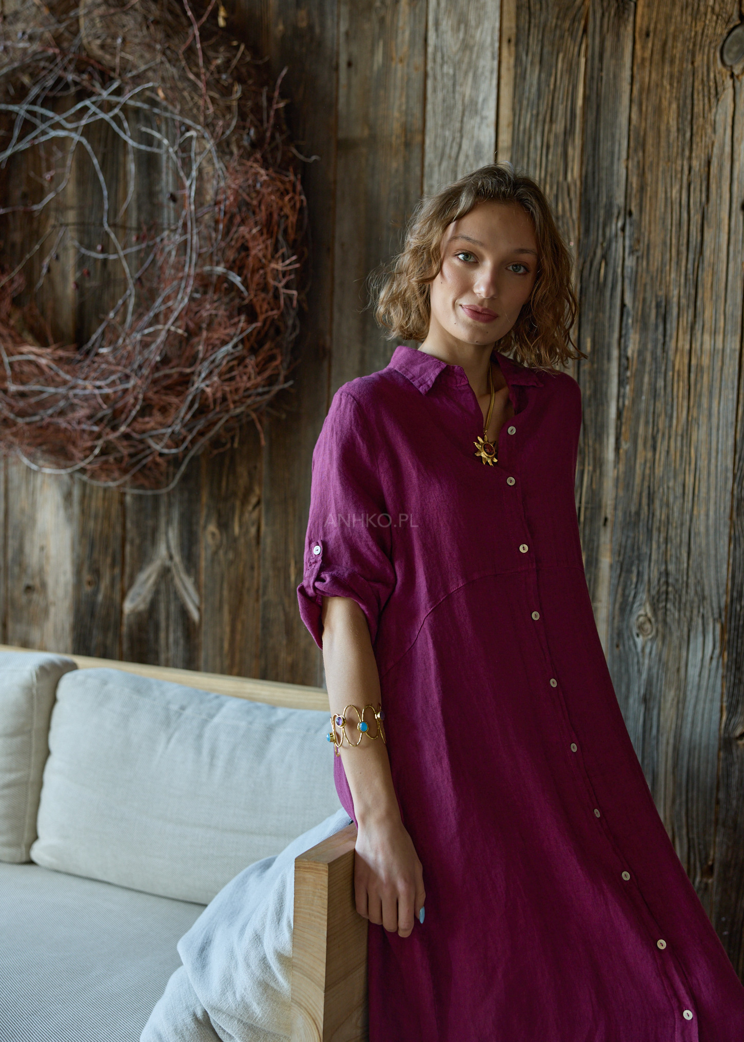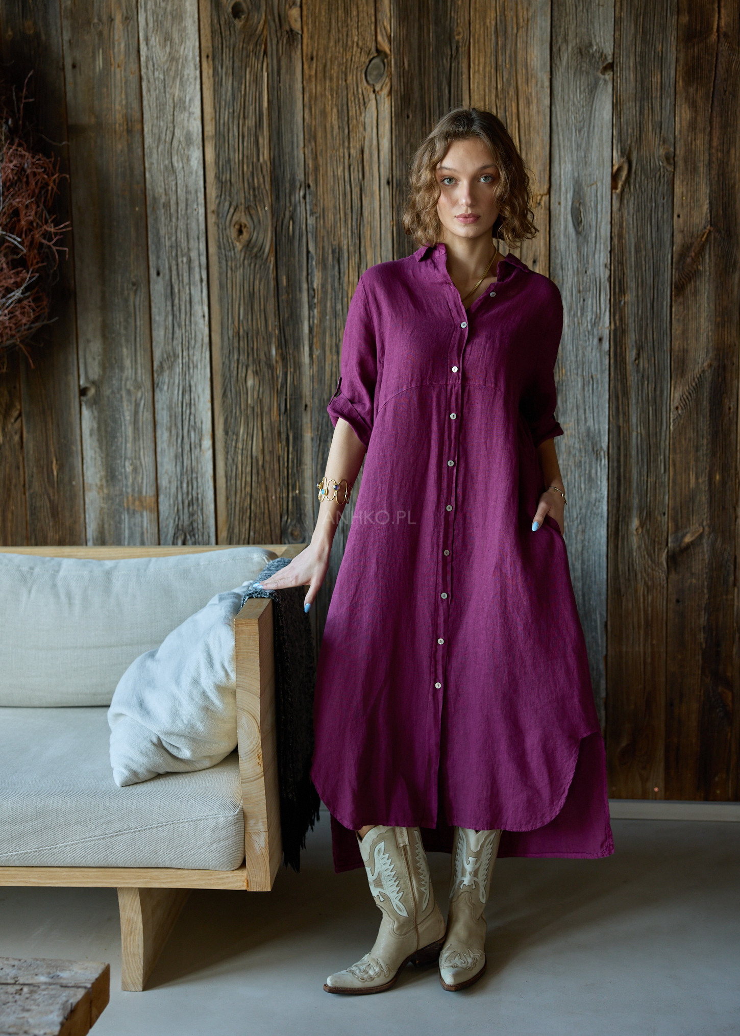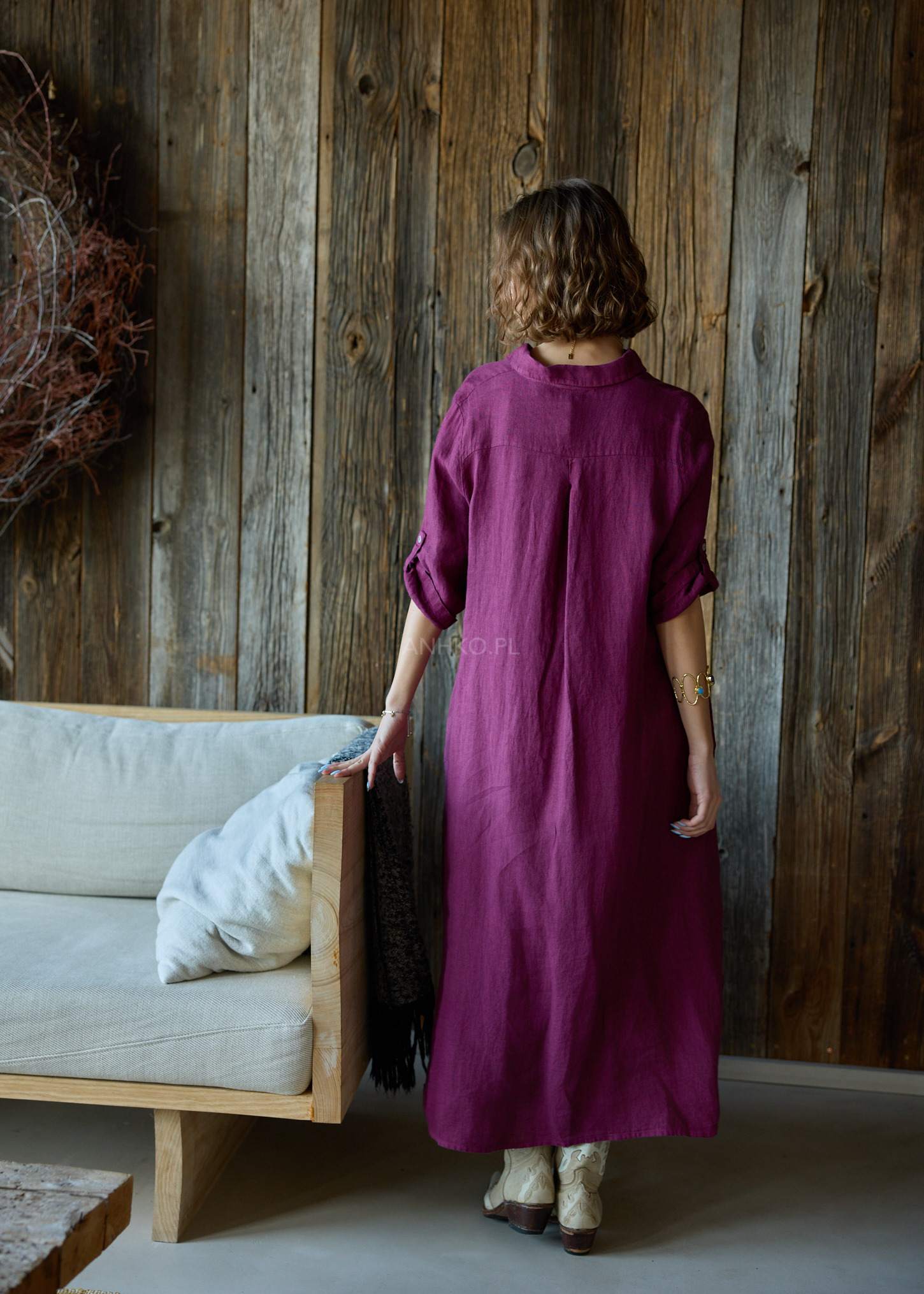 Sukienka o długości maxi jest prawdziwym połączeniem elegancji i funkcjonalności. W stylu szmizjerki, prezentuje się bardzo klasycznie i uniwersalnie. Zapinana po całości, daje możliwość regulacji dopasowania, a rękaw typu reglan dodaje jej wyjątkowego charakteru - można go podpiąć, co sprawia, że sukienka staje się jeszcze bardziej wszechstronna w zależności od okazji i nastroju. Prosta linia sukienki podkreśla sylwetkę, a przeszycie w talii dodaje subtelnej akcentuacji figury. Dwie kieszenie klasyczne nie tylko dodają praktycznego charakteru, ale także są estetycznym dodatkiem. Uszyta w 100% z lnu, ta sukienka jest nie tylko stylowa, ale również lekka i przyjemna w noszeniu, doskonała na ciepłe dni.