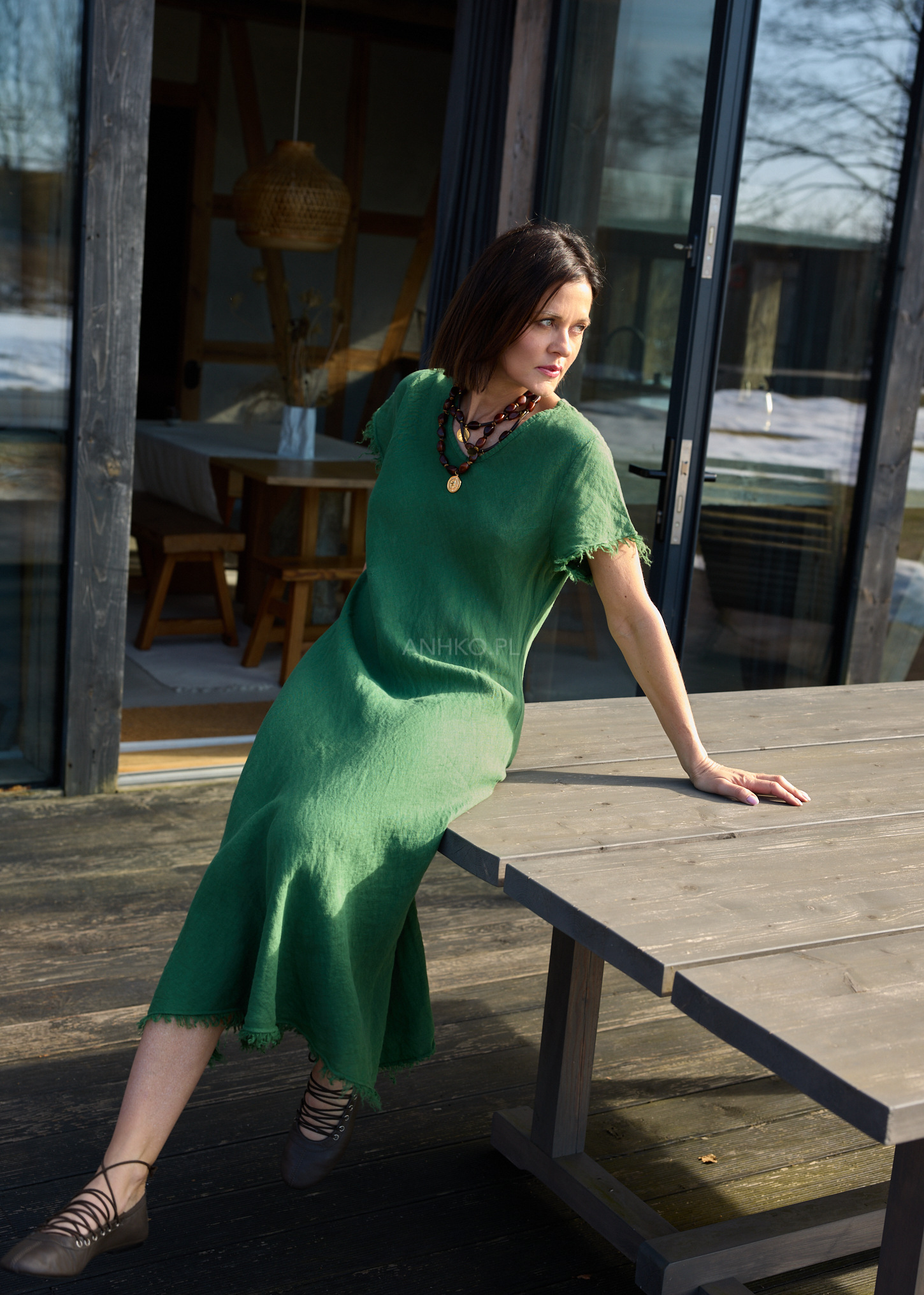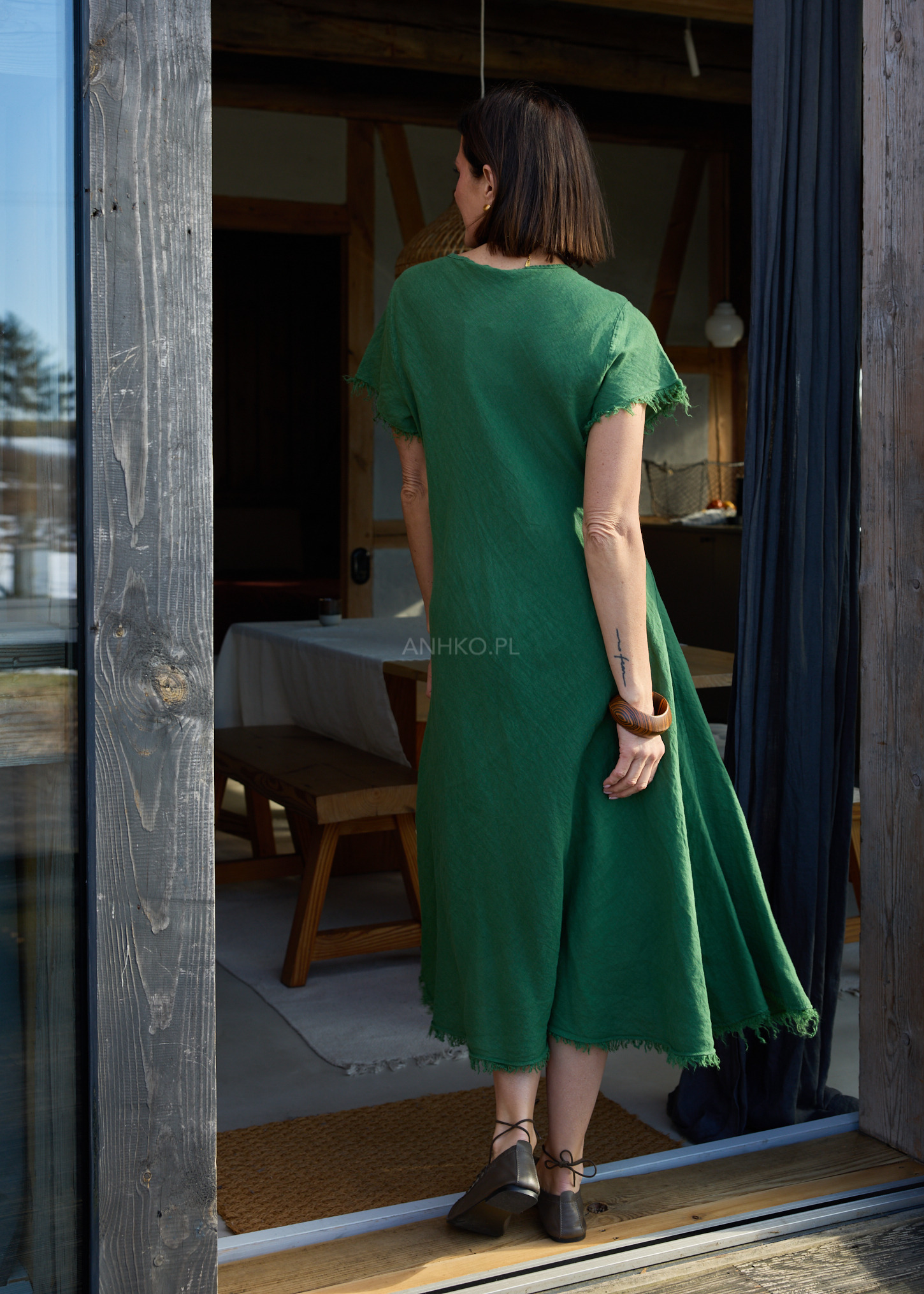 Ta lniana sukienka midi subtelnie podkreśla sylwetkę dzięki dopasowanej górze i lekko rozszerzanemu dołowi, który miękko układa się w ruchu. Naturalna tkanina zapewnia komfort noszenia, a dekolt w serek optycznie wysmukla szyję i dodaje lekkości całej stylizacji.