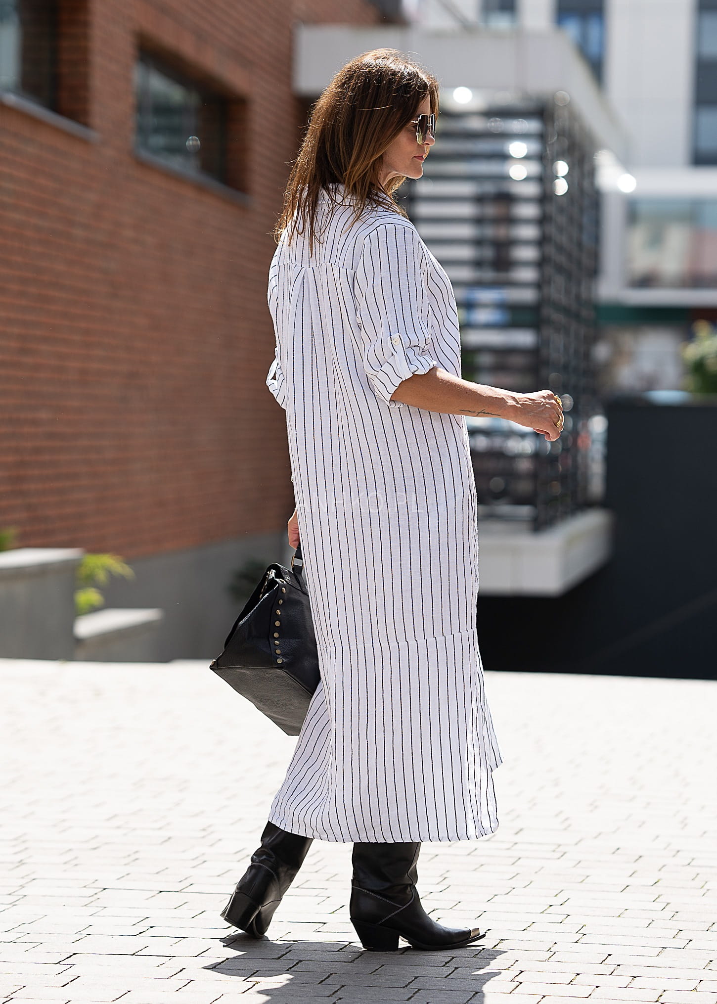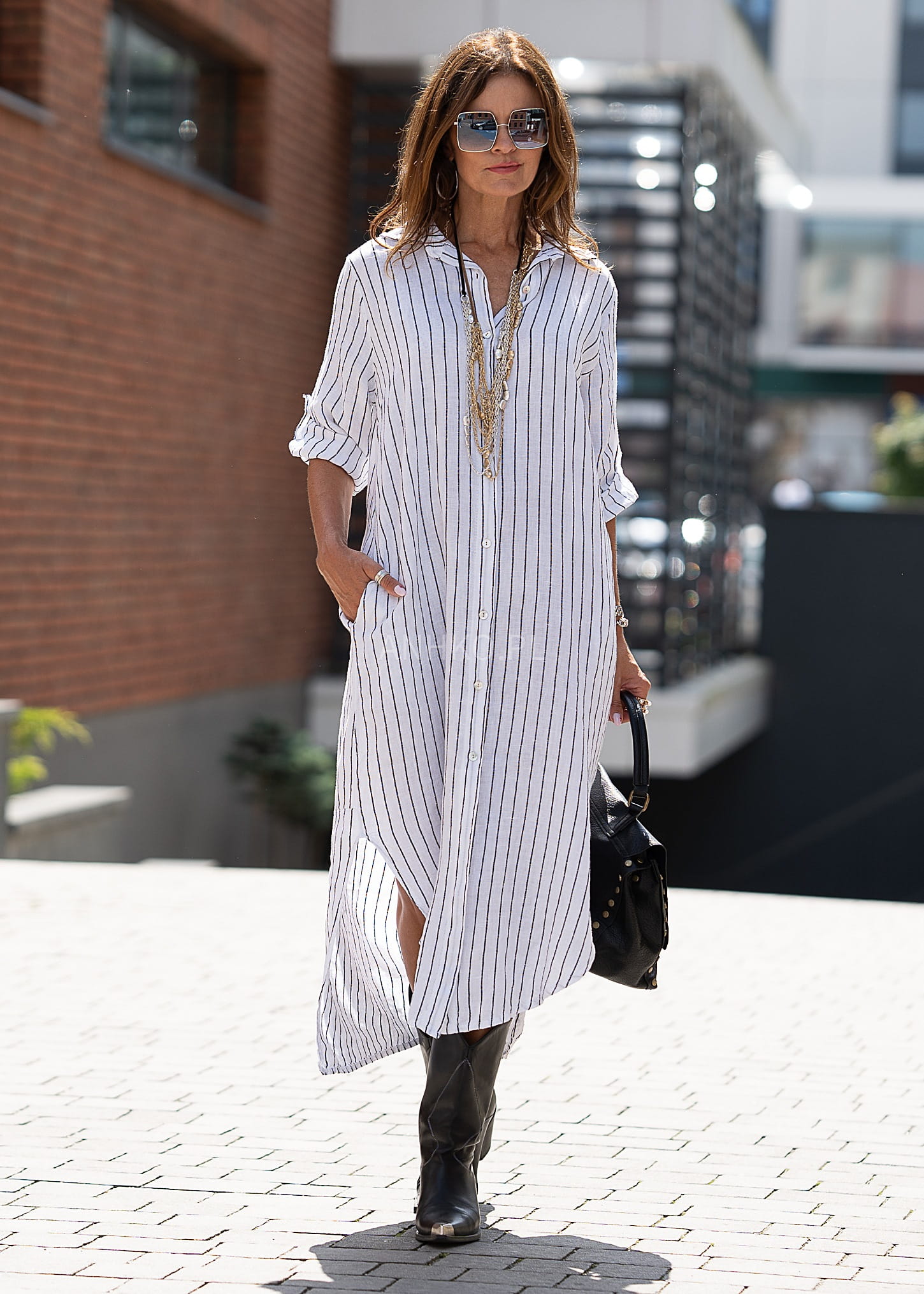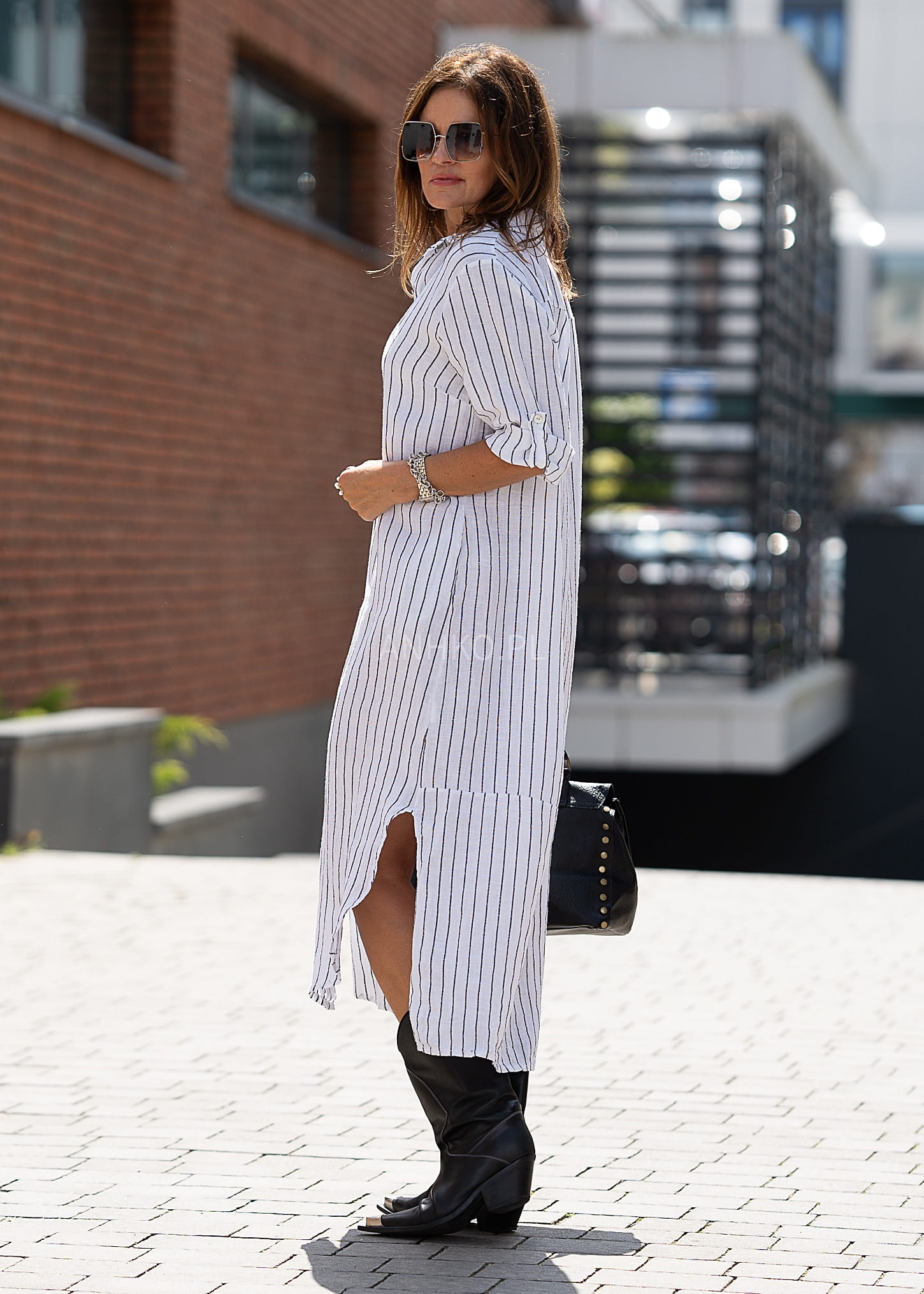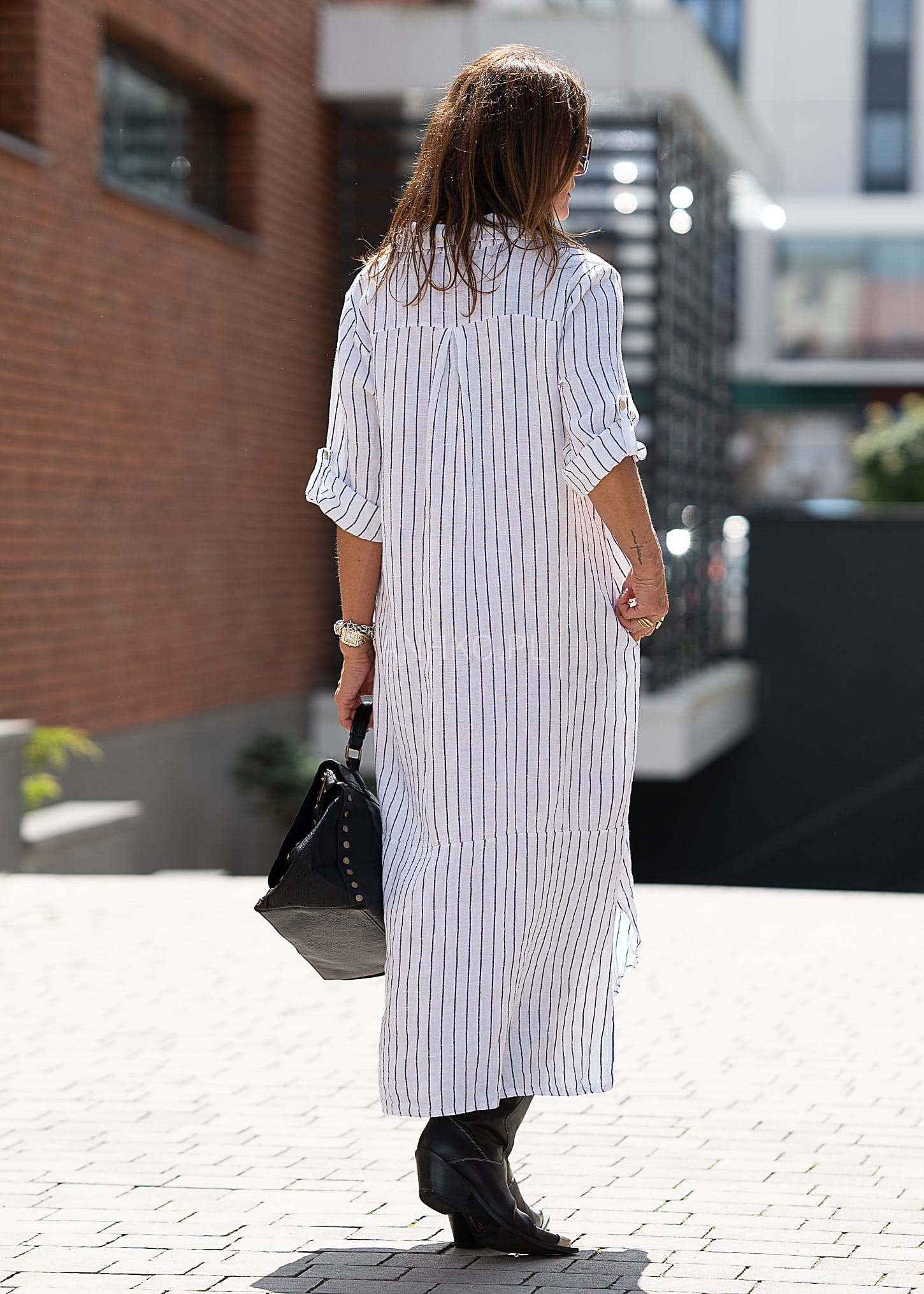 Ta sukienka lniana o koszulowym kroju miękko układa się na sylwetce, tworząc lekki, wydłużający efekt. Pionowy prążek optycznie wysmukla figurę, a luźna linia zapewnia pełną swobodę ruchów — idealną zarówno do miejskich stylizacji, jak i bardziej nonszalanckich zestawów warstwowych.