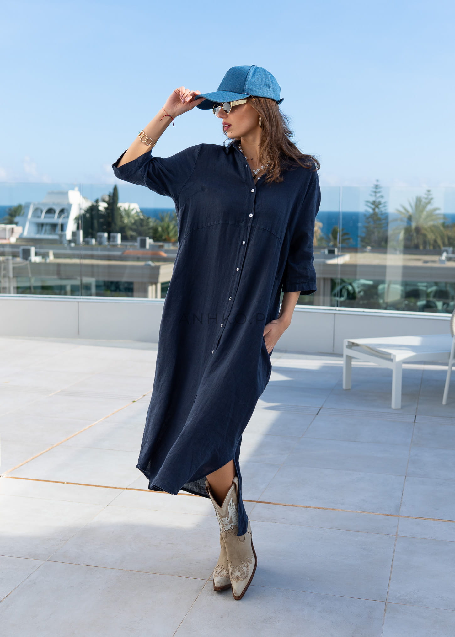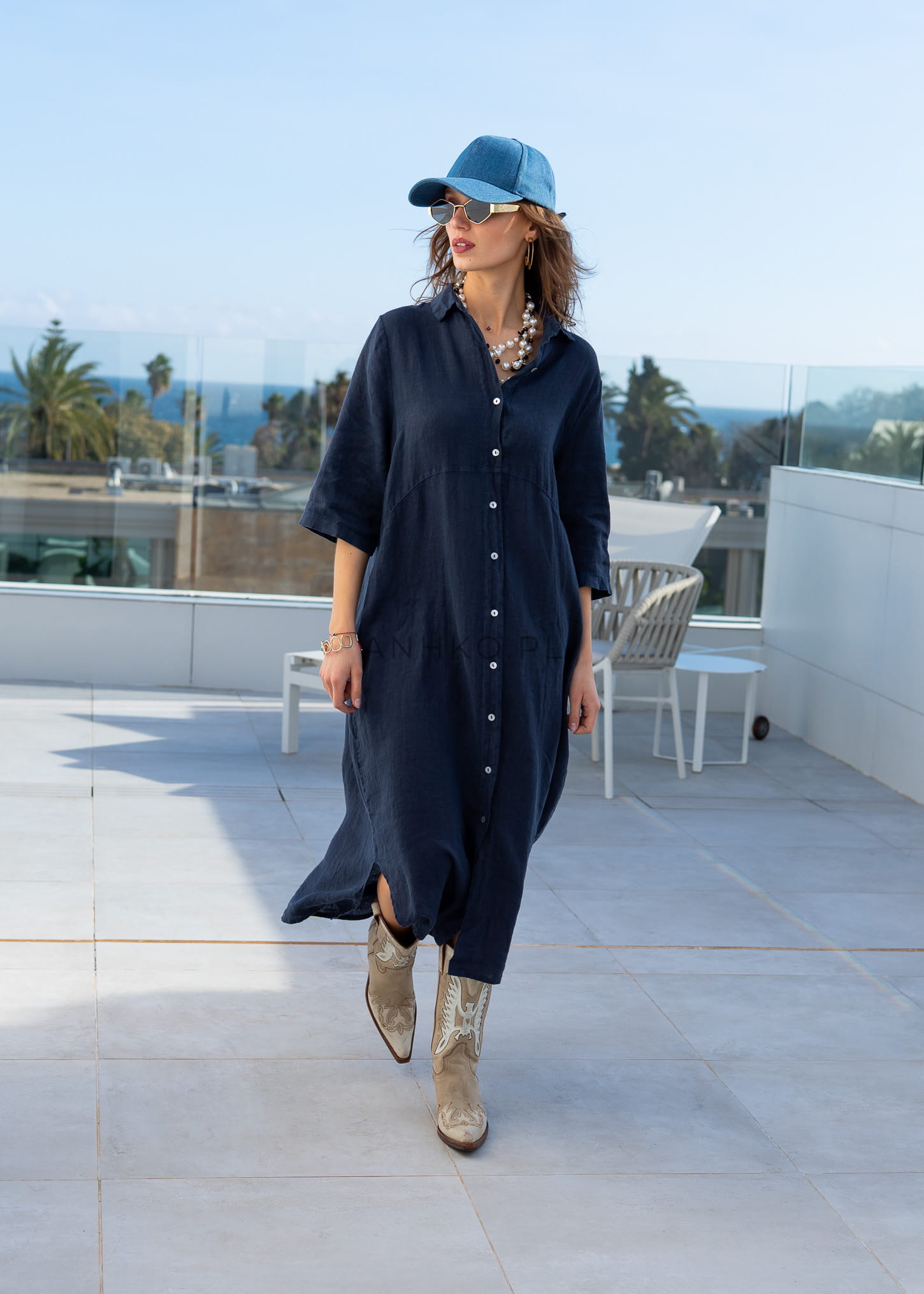 Model w stylu szmizjerki wykonany z naturalnego lnu łączy komfort i elegancję. Rękaw z możliwością podpięcia oraz klasyczny kołnierzyk dodają funkcjonalności, a głęboki granatowy kolor sprawia, że sukienka doskonale wpisuje się w różnorodne stylizacje – od codziennych po bardziej dopracowane.